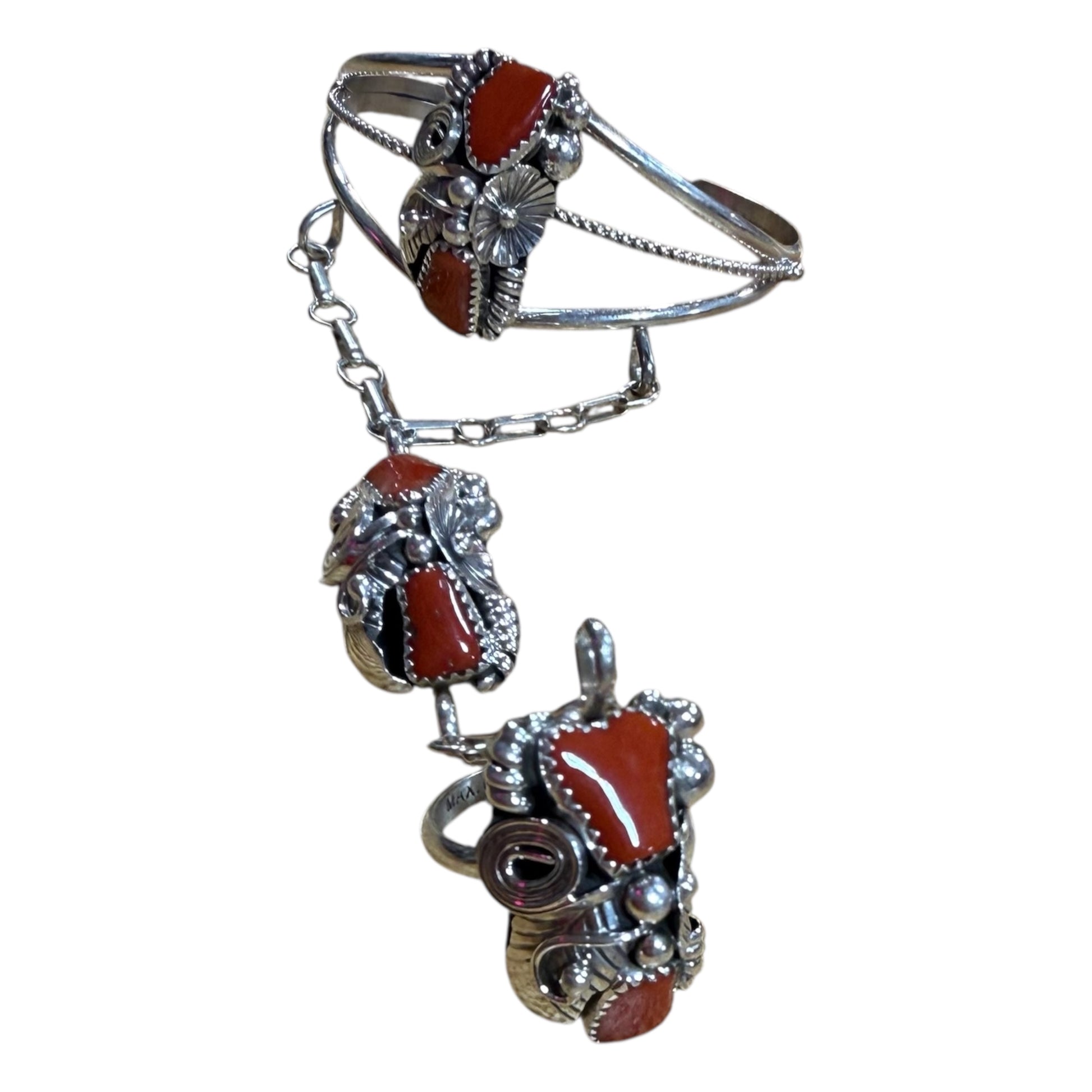 This fiery beauty is a true showstopper. Handcrafted by Maxine Calladito in sterling silver, this traditional Navajo-style slave bracelet features striking red coral stones that radiate warmth and power. The design flows gracefully from a bold coral cuff to a matching double-stone ring, connected by a chain of sterling silver links that drape elegantly across the hand. Each coral stone is set in intricate silverwork with hand-stamped details and signature leaf and rope accents — a timeless nod to classic Southwestern artistry.
