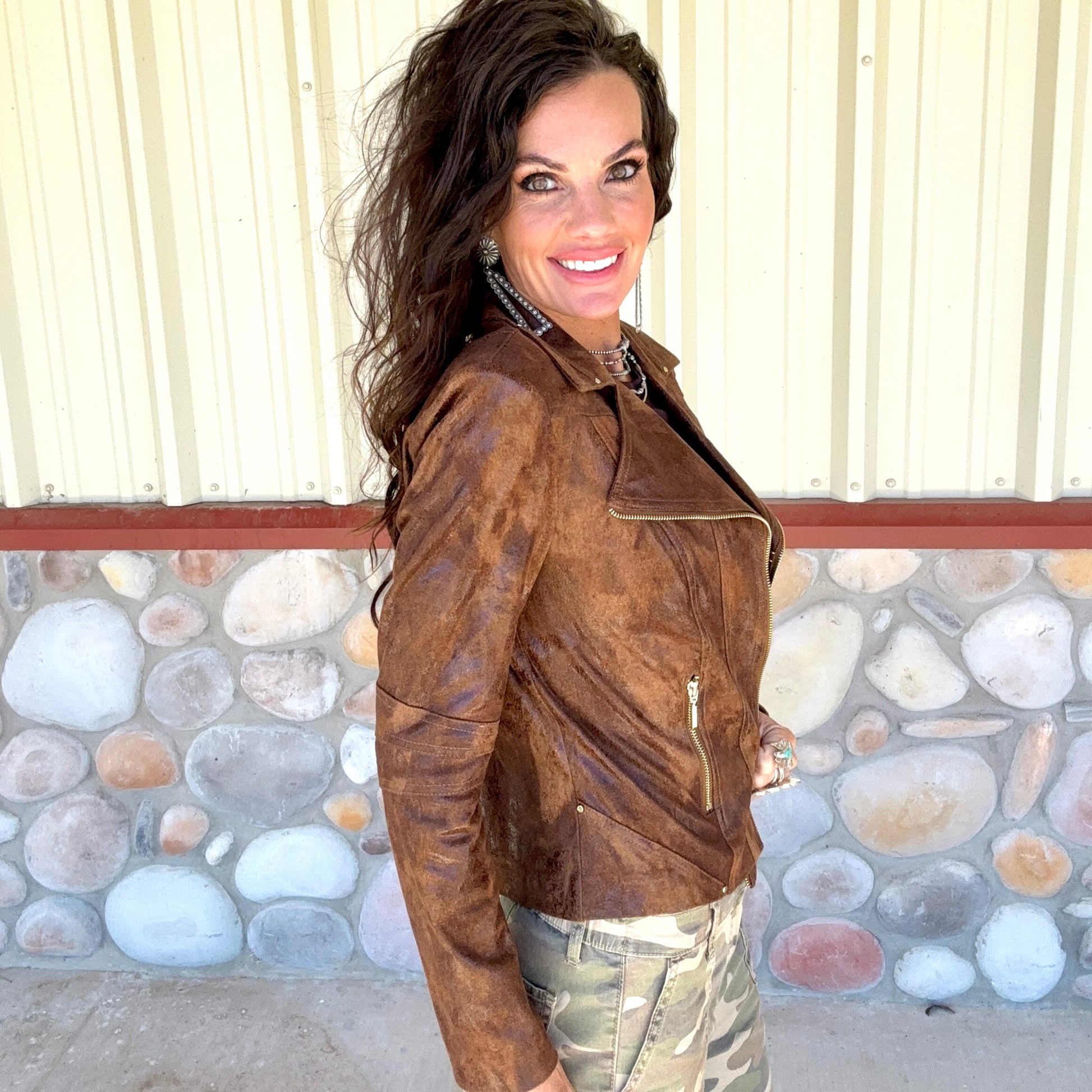 This faux suede jacket brings a touch of Western grit to a sleek, modern silhouette. Designed in a distressed chocolate brown finish, it offers that perfectly weathered, lived-in look that pairs effortlessly with denim, turquoise, or even camo for a bold contrast.