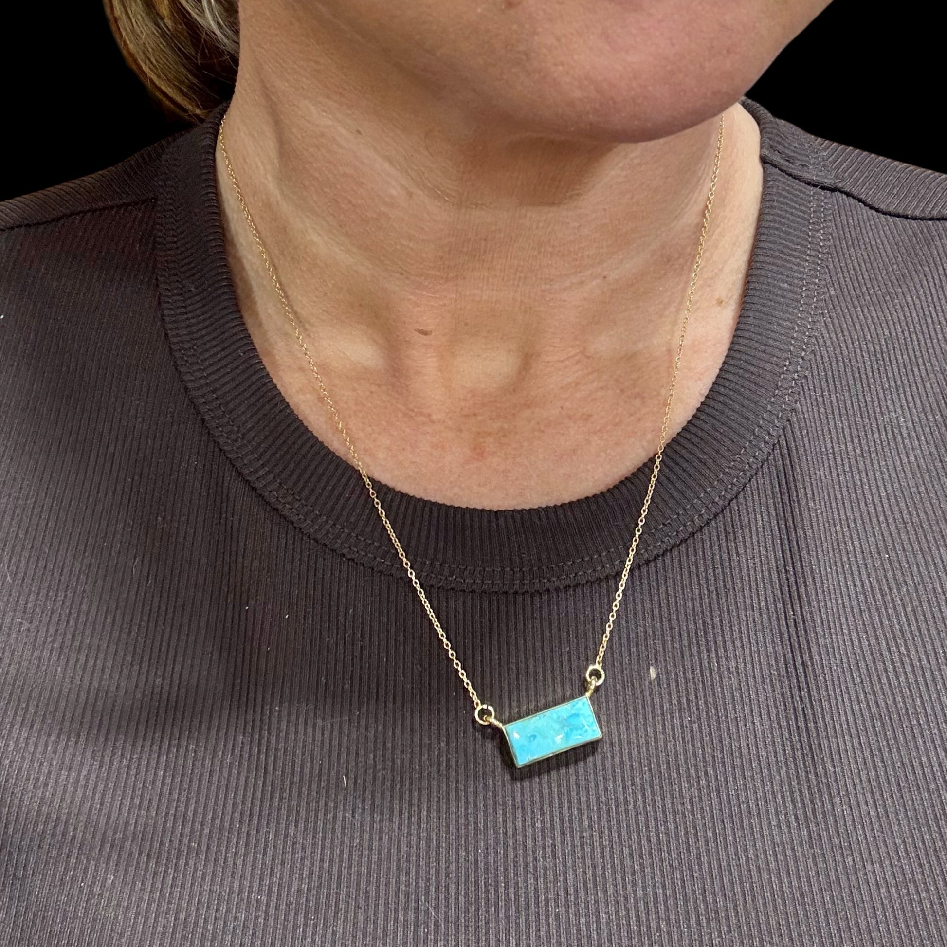 A timeless staple for any turquoise lover, this elegant necklace features a rectangular turquoise stone set in sleek 14k gold plating over sterling silver. The delicate chain complements the minimalist bar pendant, allowing the natural beauty of the stone to take center stage.