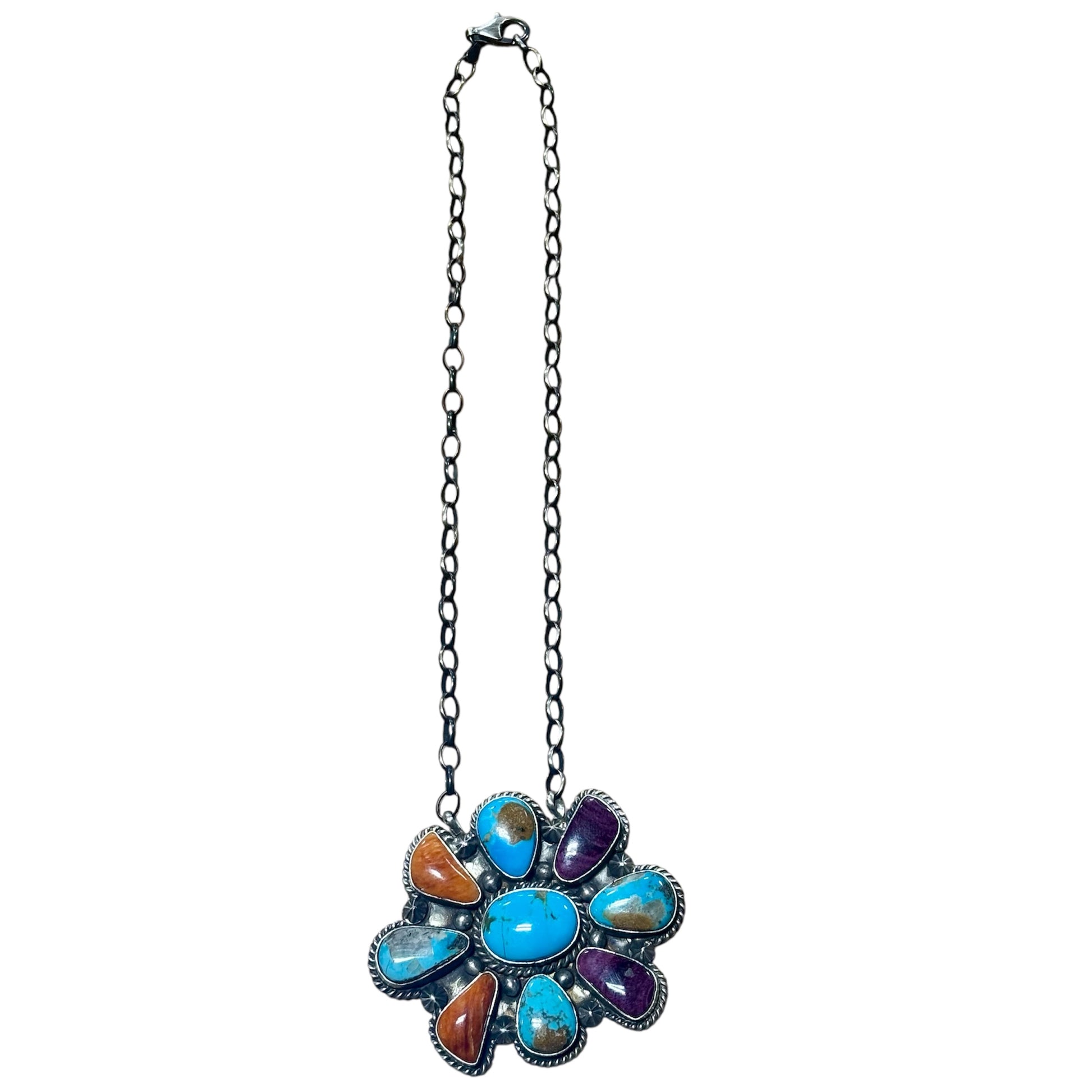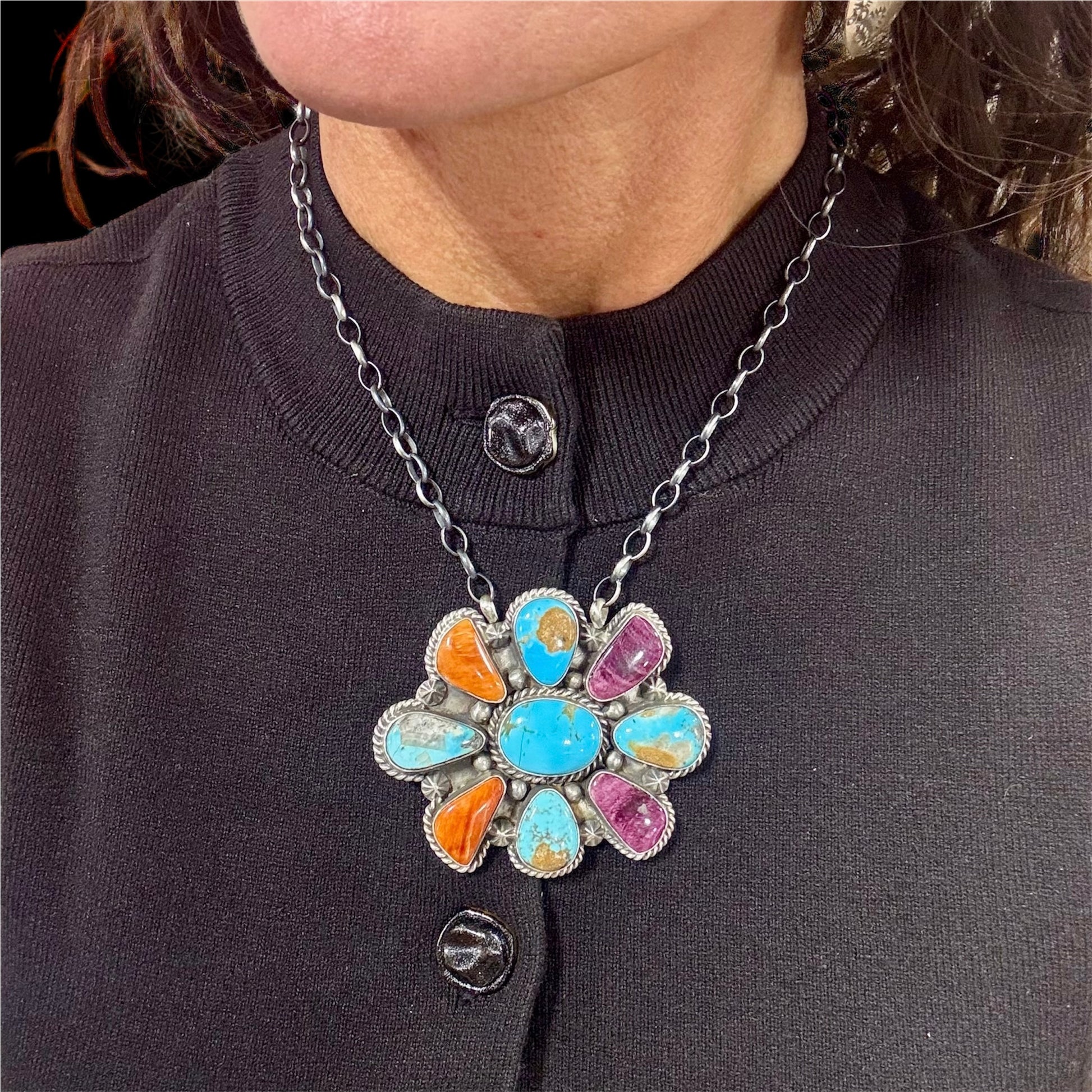 This gorgeous Western-inspired necklace is bursting with color and craftsmanship. Set in sterling silver, the statement cluster pendant features a vibrant mix of Kingman turquoise, orange and red spiny oyster shell, and deep purple charoite, arranged in a bold flower design that radiates true Southwestern charm.