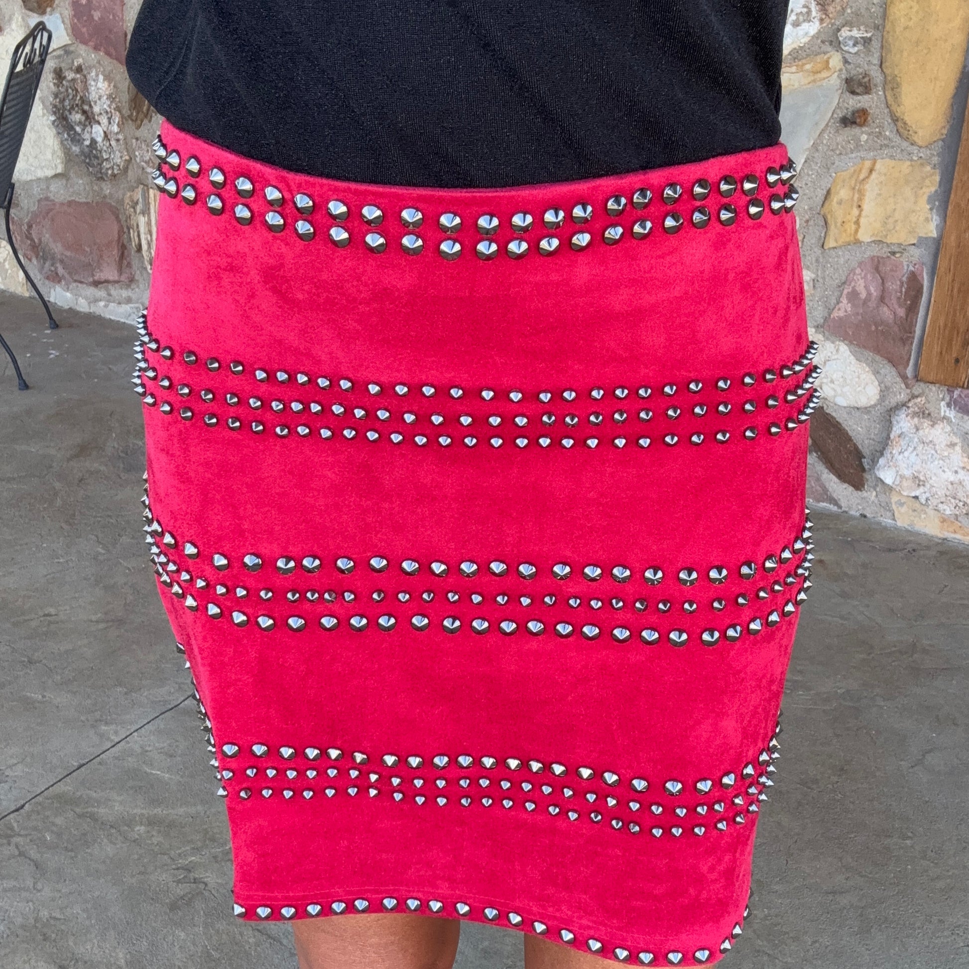 Turn up the heat in our Amarillo Blaze Skirt, a bold red suede statement piece that’s made for the spotlight. This high-waisted mini features rows of silver studs and rhinestone detailing that shimmer with every move — giving rodeo queen energy with a modern twist.