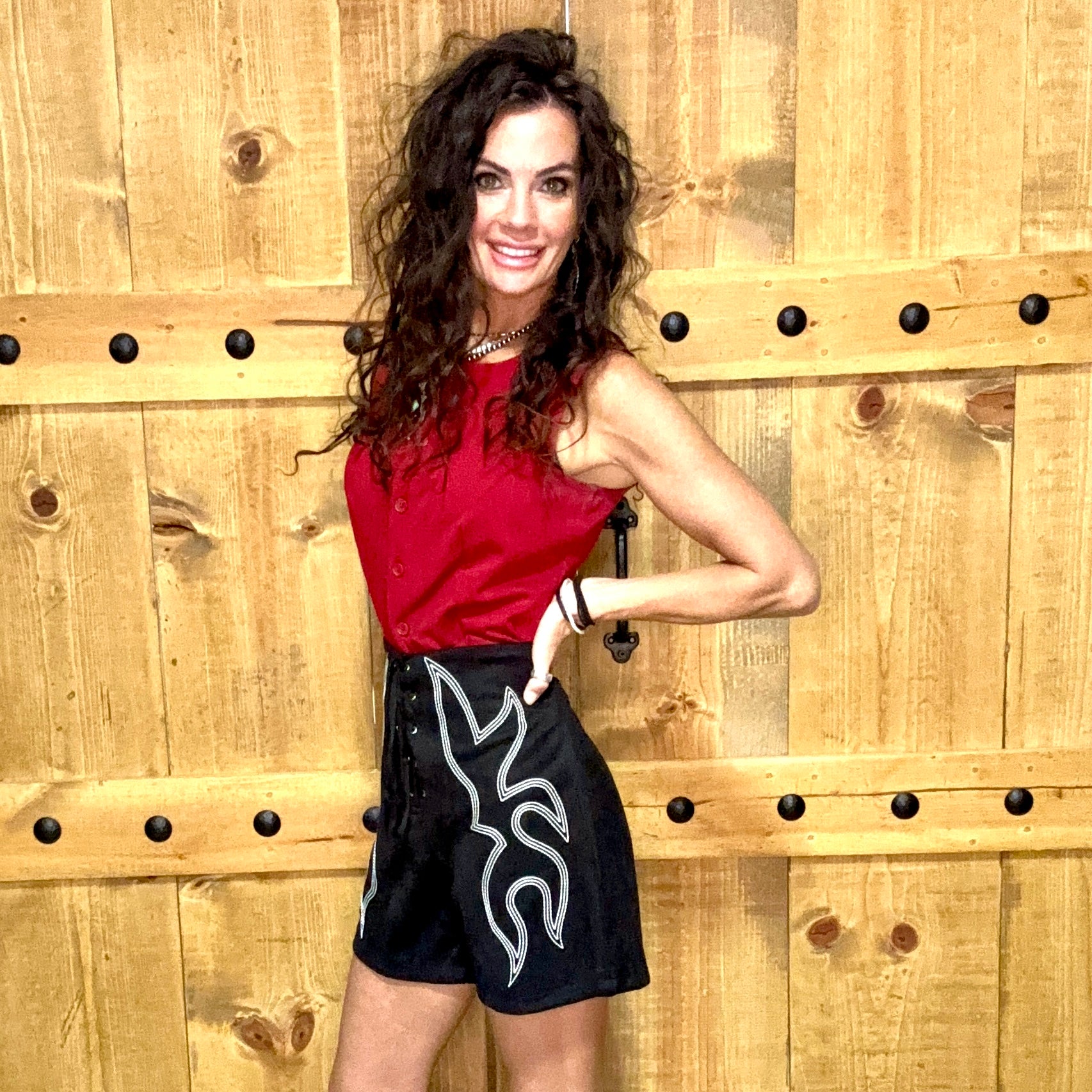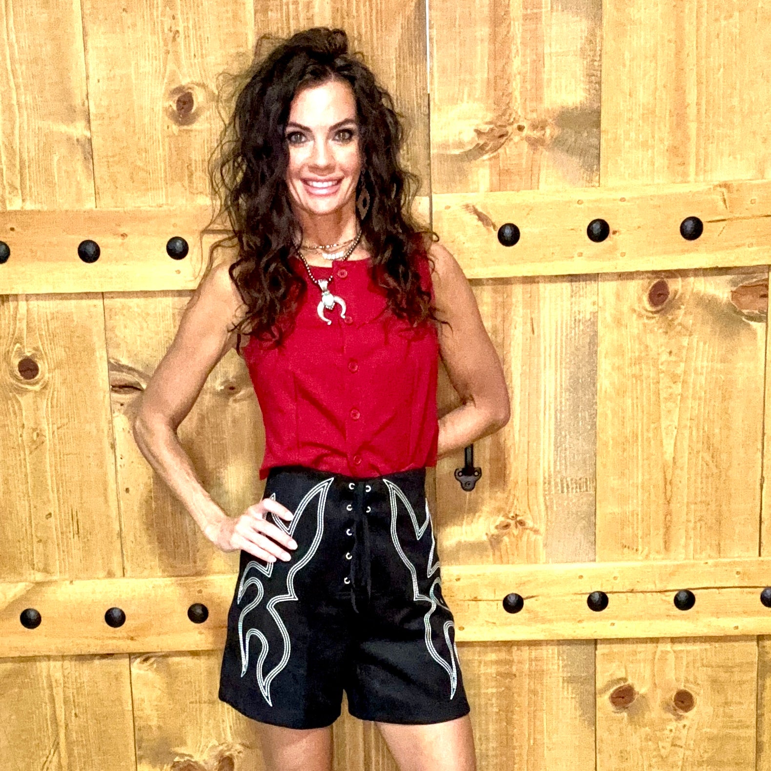 Step out in style with these rich black shorts, designed with a flattering high-rise fit and tailored silhouette. The smooth faux suede texture adds a touch of western luxury, while the versatile cut makes them perfect for pairing with boots, blouses, or casual tees. Chic yet comfortable, these shorts bring effortless sophistication to any outfit.