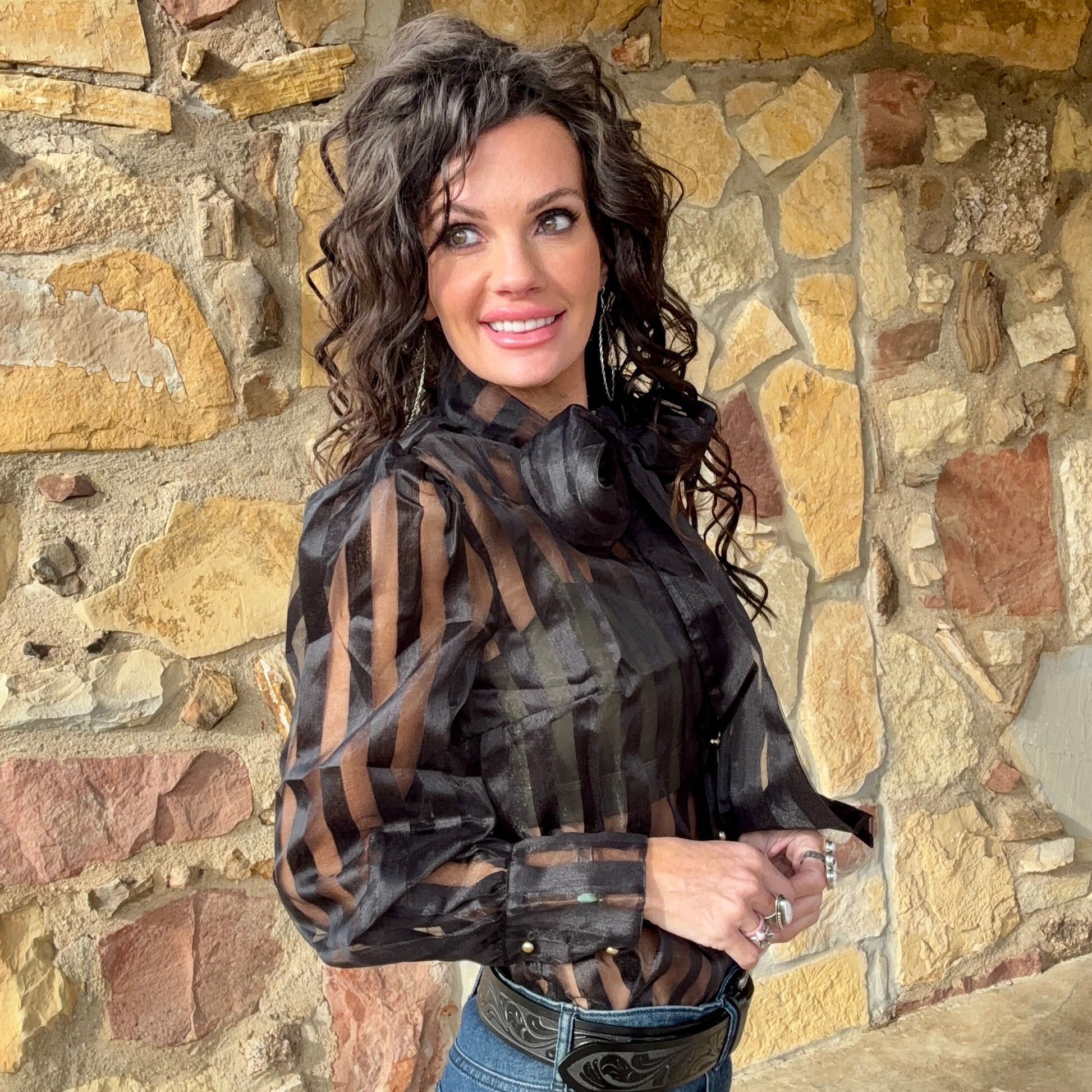 Where old-world charm meets modern Western elegance. The Blackwater Belle Sheer Stripe Top features bold vertical striping that elongates the frame and a dramatic neck bow that nods to classic elegance styling. Lightweight, airy, and effortlessly refined, this blouse is perfect for layering under statement jackets or wearing alone for a subtly daring moment. It’s the perfect mix of delicate and daring — built for the woman who commands a room with quiet confidence and cowgirl class.
