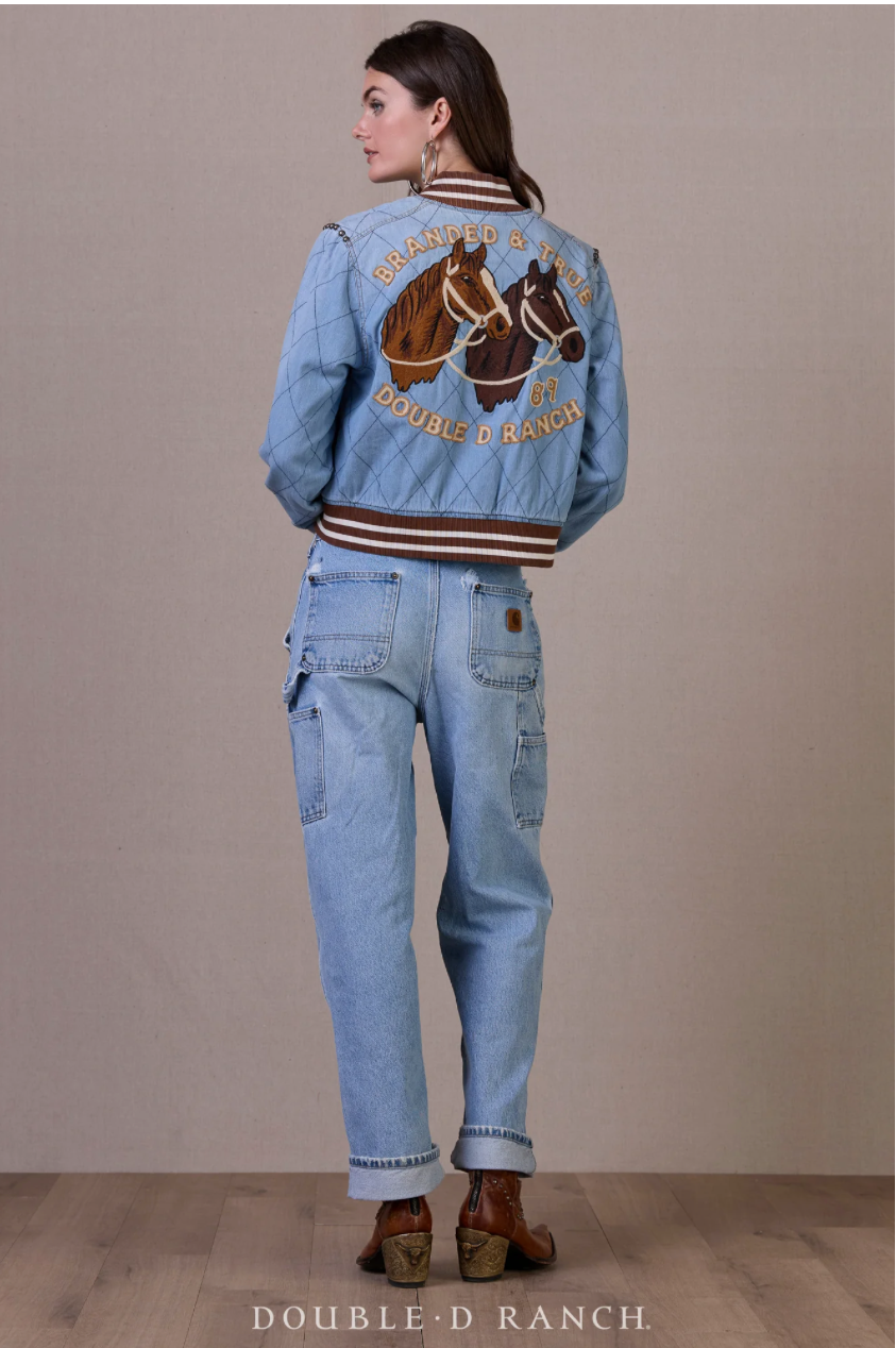 What a dreamy jacket! The classic chambray bomber has elements of English rider, like the askew quilt stitching and (faux) leather flap pockets, but also hints of retro in the racing stripe cuffs, collar, and waistband, and then the back brings in a bit of Western with the embroidered horseheads and wording that are reminiscent of an old rodeo jacket. It’s got a little bit of everything!