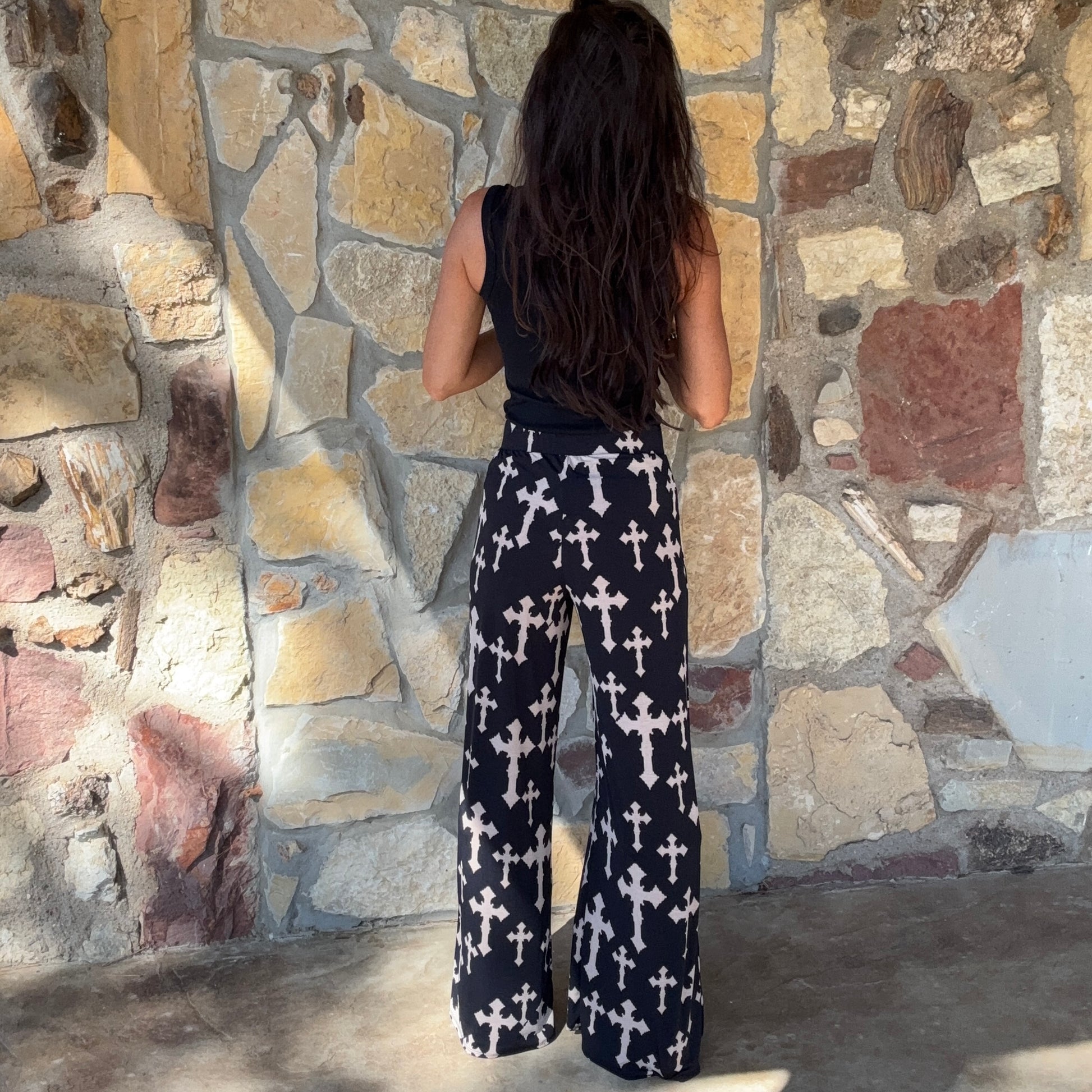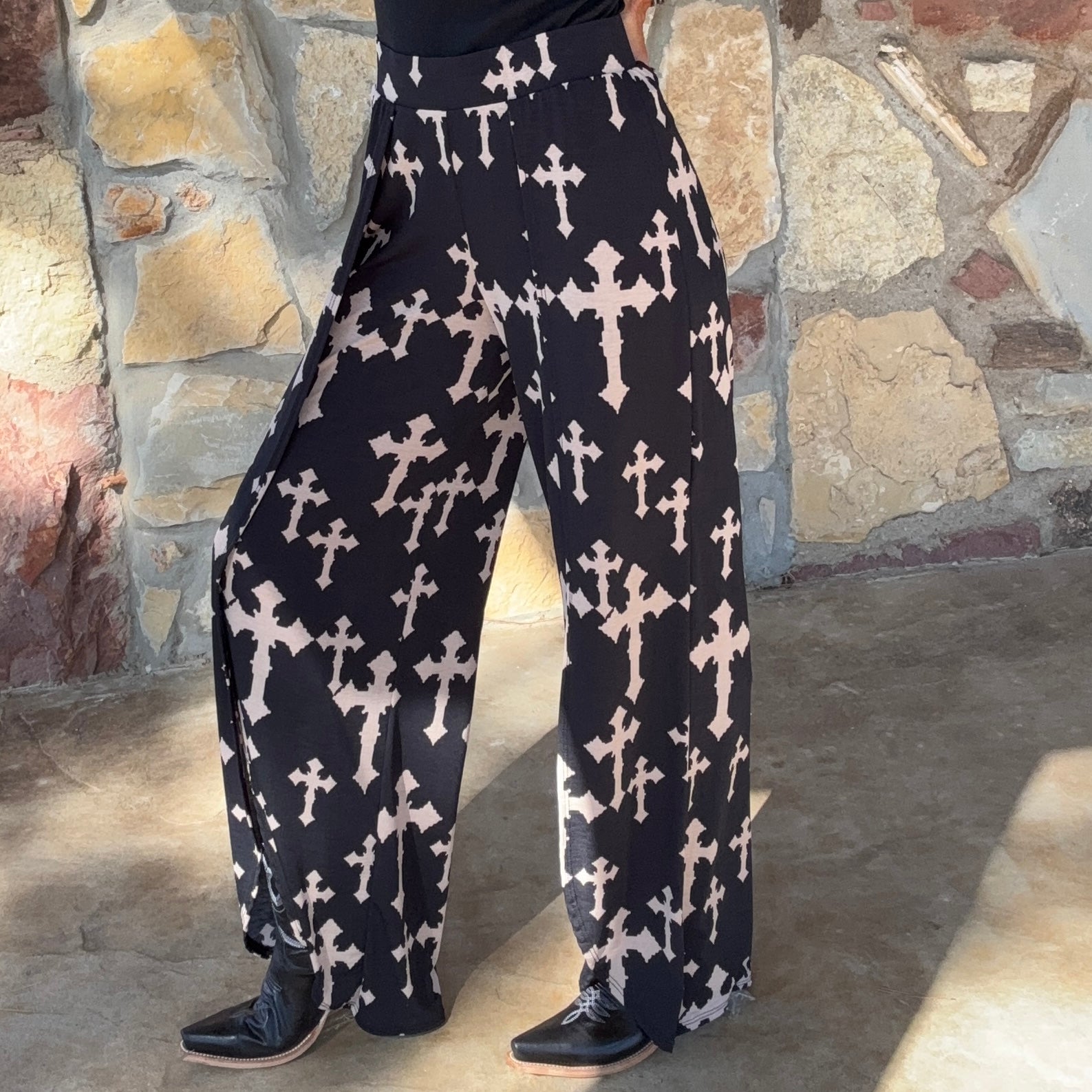 These flowy black pants feature a striking cream cross print throughout, blending statement style with a touch of Western spirit. Designed with a comfortable elastic waistband and soft, lightweight fabric, they move beautifully whether you’re walking the market or headed out for a night under the stars. Pair them with a simple tee, denim jacket, or a dressy blouse for that unmistakable TTR edge — faith-forward and fashion-first.