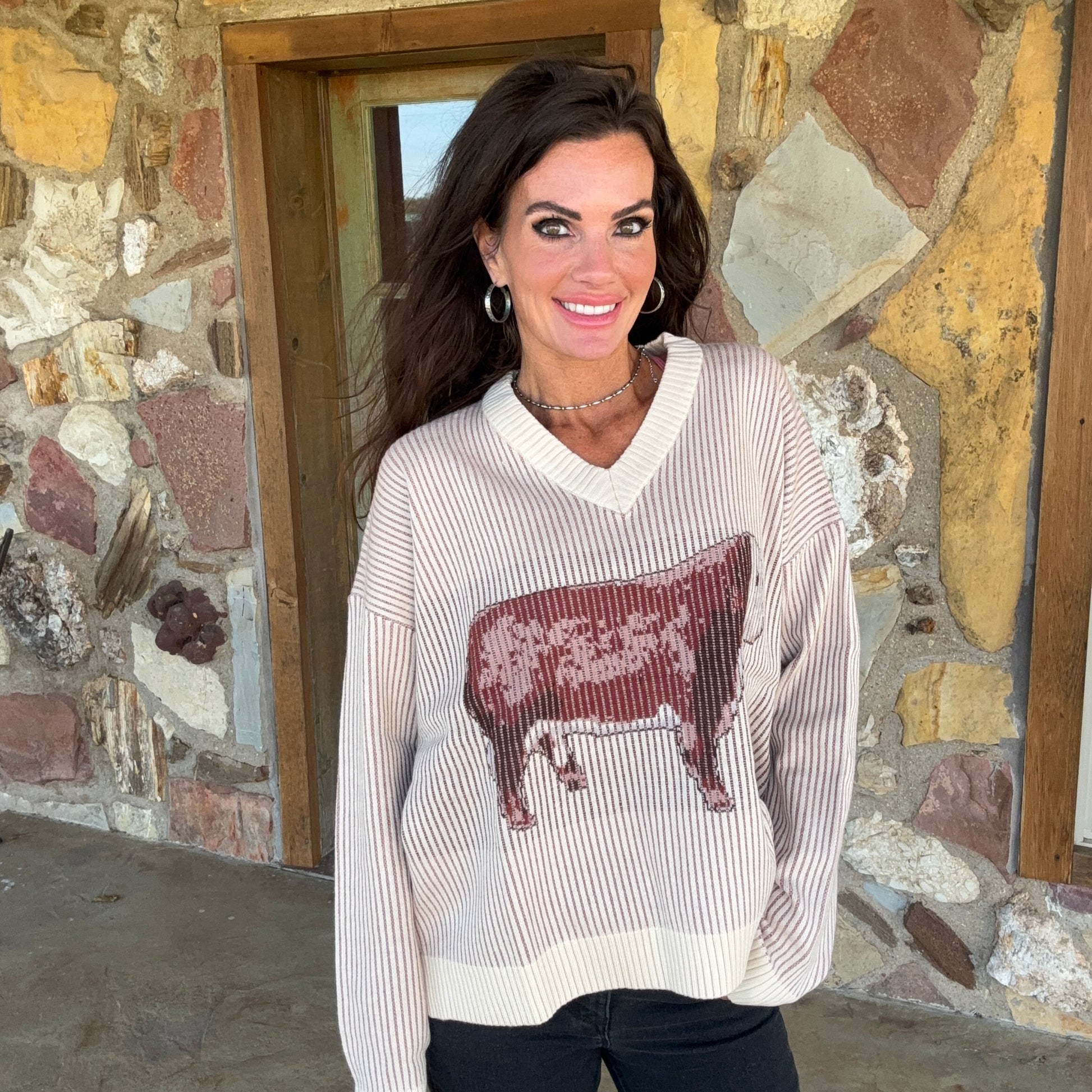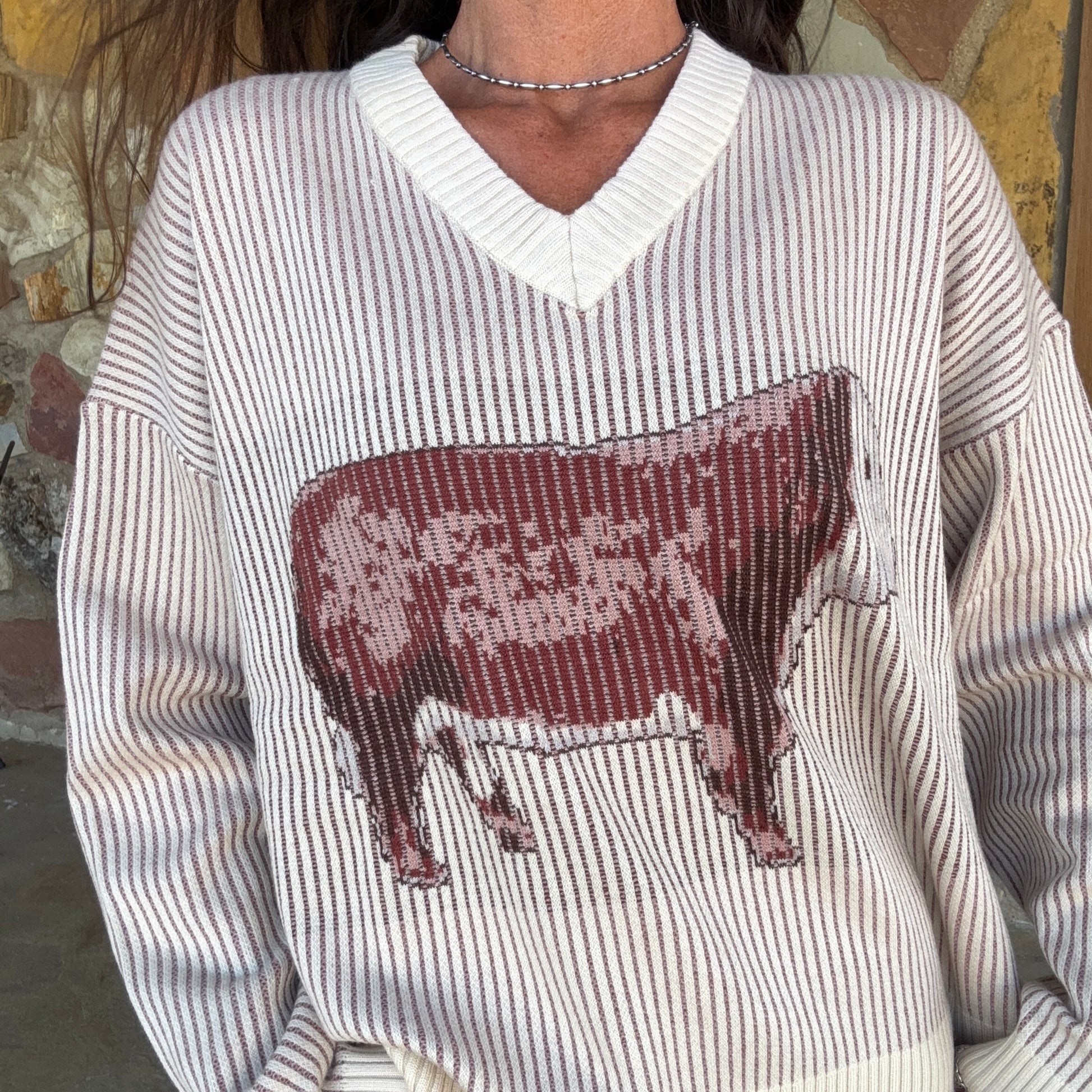 Say hello to your new favorite cozy statement piece — the Cattle Country sweater. This relaxed-fit knit features soft cream and taupe stripes with a bold cow graphic front and center, adding just the right mix of Western charm and laid-back style.