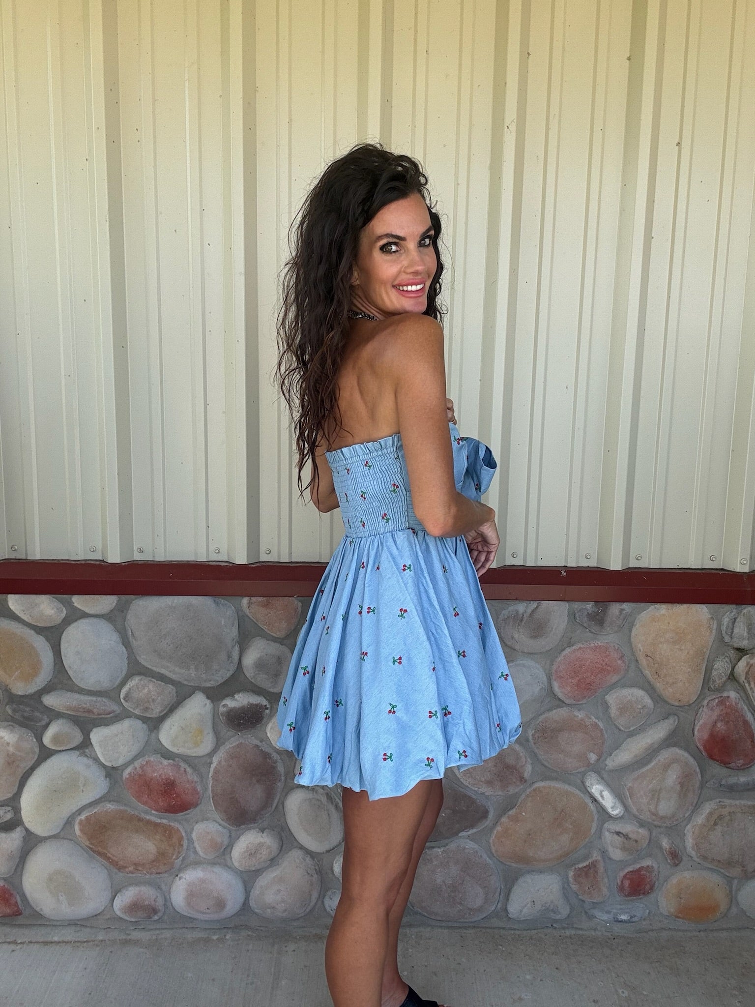 Flirty and playful, this bubble mini dress brings all the girly vibes. Featuring delicate cherry embroidery in bright red over pleated demin blue, it’s crafted with lightweight cotton blend, sleeveless, and a flattering open neckline with a bow-tie front. The flattering fit and feminine silhouette make it the perfect choice for lunch dates, festivals, or twirling through wildflower fields.