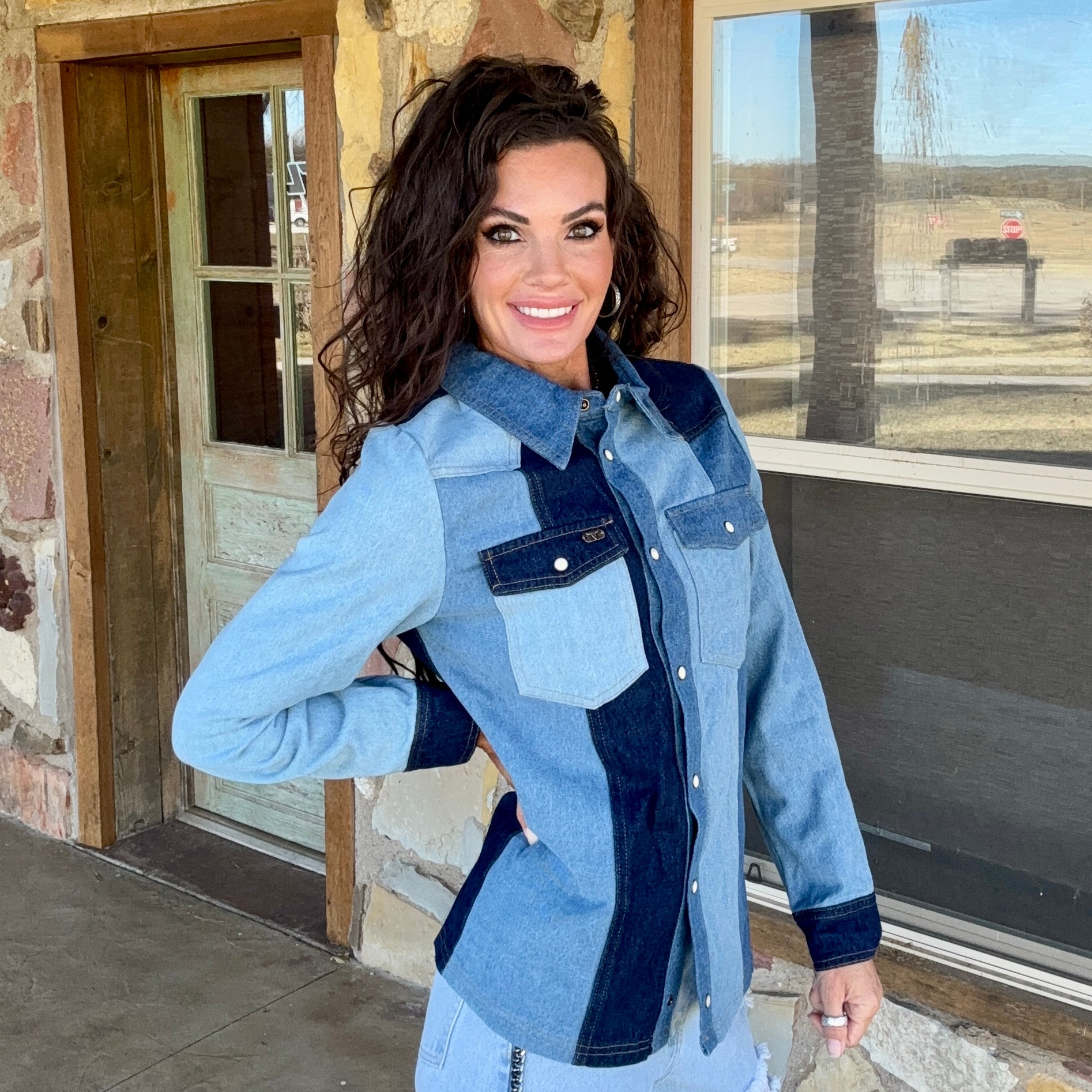 Meet your new denim statement piece — a color-block patchwork Western snap shirt that brings modern flair to a timeless cowboy classic. Made with alternating panels of light, medium, and dark-wash denim, this long-sleeve shirt delivers the perfect blend of rugged charm and boutique-ready style.