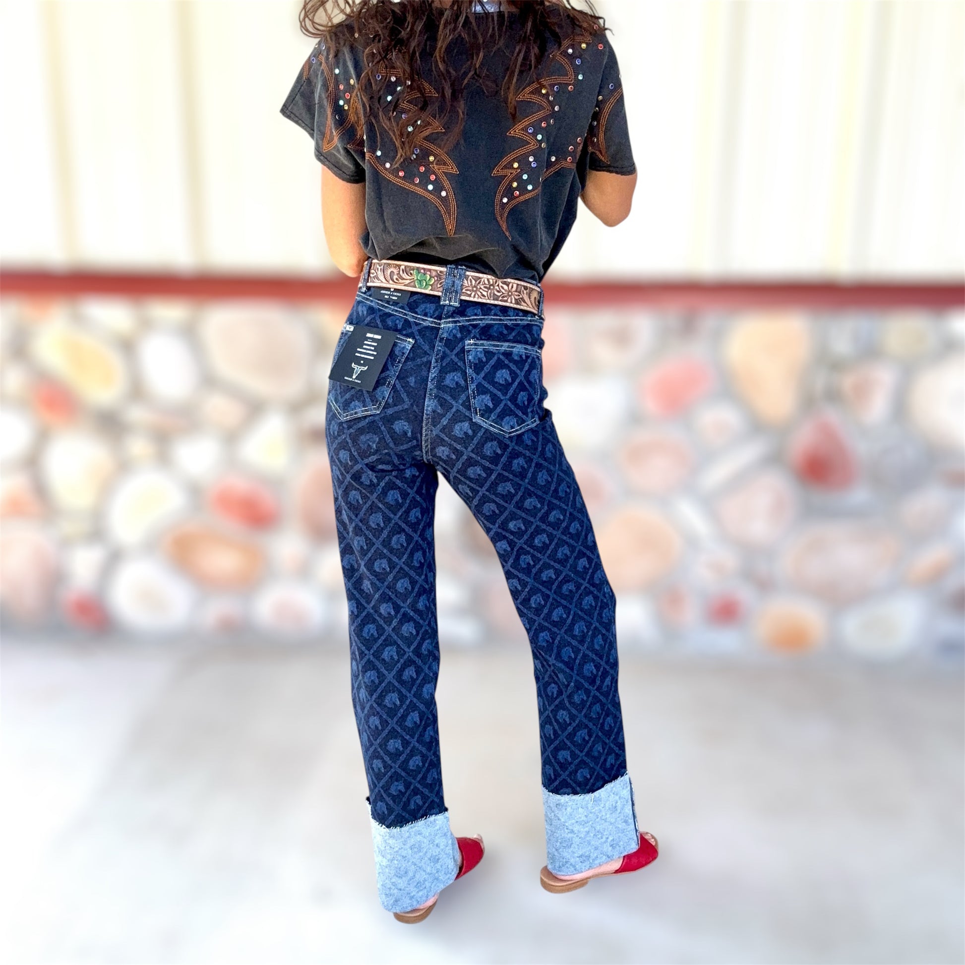 Stand out from the denim crowd with these bold patterned bootcut jeans. Featuring an allover dark-wash print and light-wash contrast hems, they deliver a fresh twist on a Western-inspired classic. The mid-rise fit and bootcut silhouette make them flattering and versatile, perfect for pairing with your favorite belts, tees, or boots.
