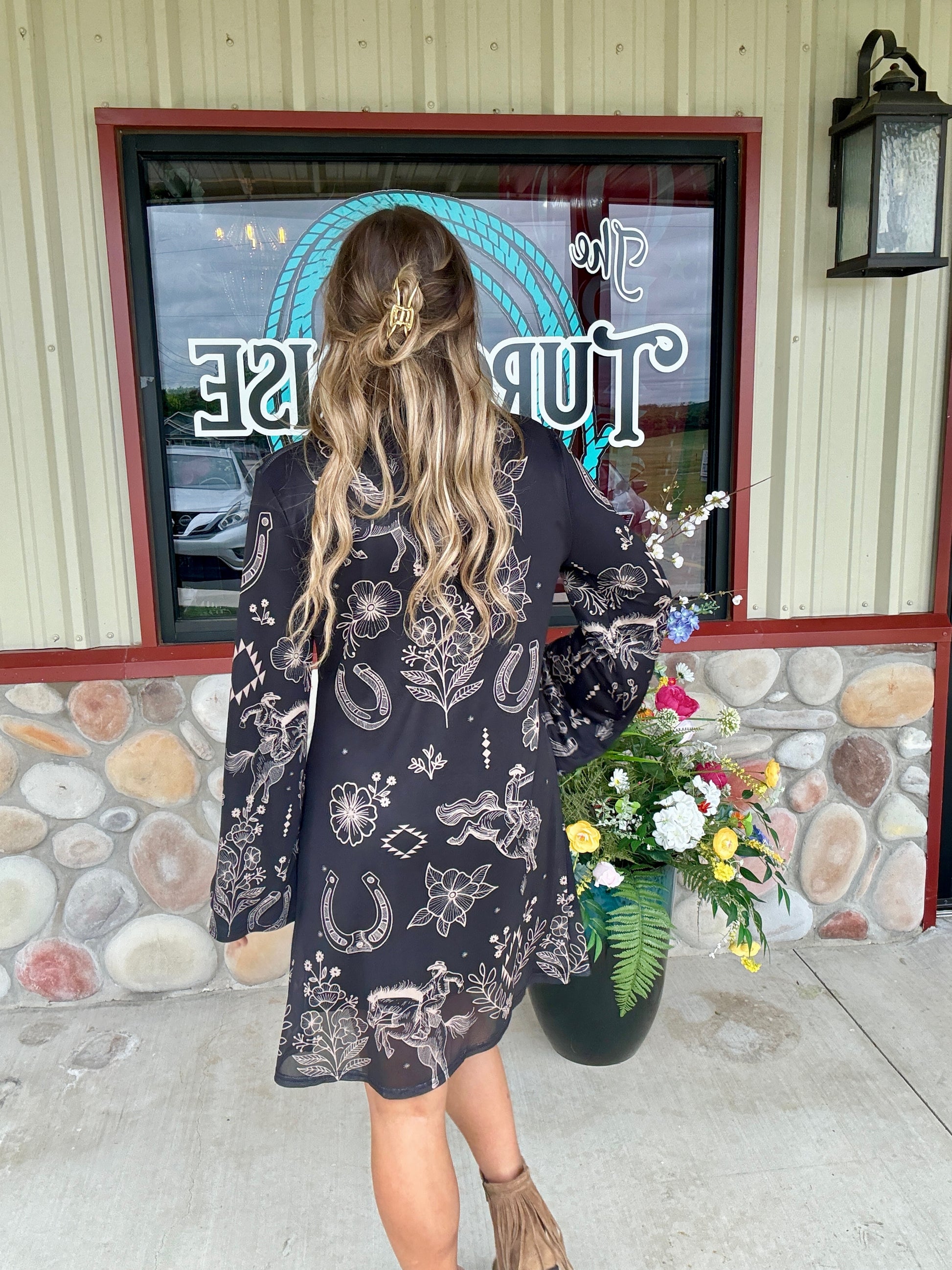 Bring some wild west magic to your wardrobe with the Cowgirl Spirit Swing Dress! This easy-breezy black dress features a playful tan print of horses, horseshoes, florals, and lucky charms — perfect for the dreamer with a cowgirl soul. Designed with a relaxed fit, a flattering v-neckline, and a cute collar detail, it’s effortlessly stylish and ultra-comfy for rodeo nights, concerts, or a casual day out.