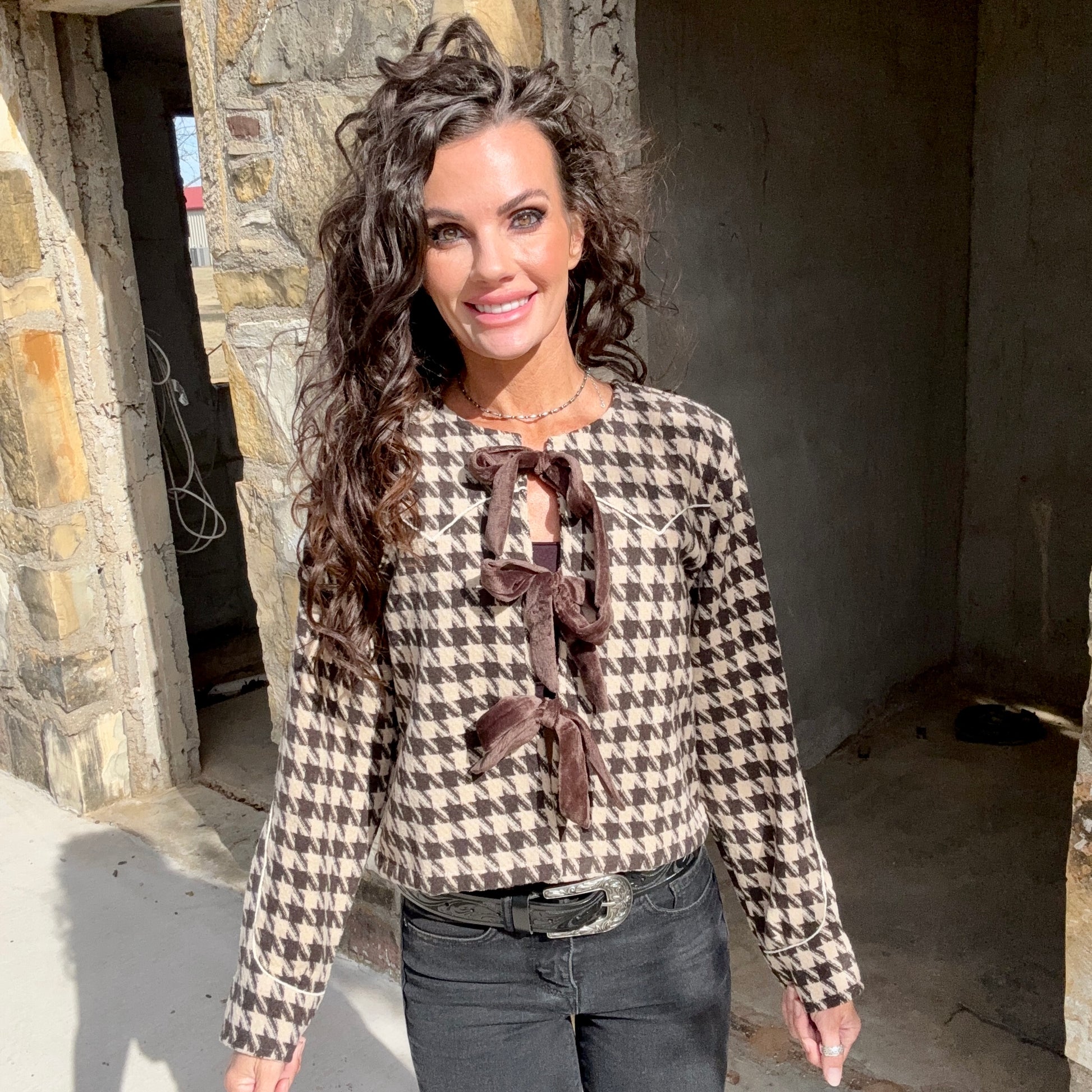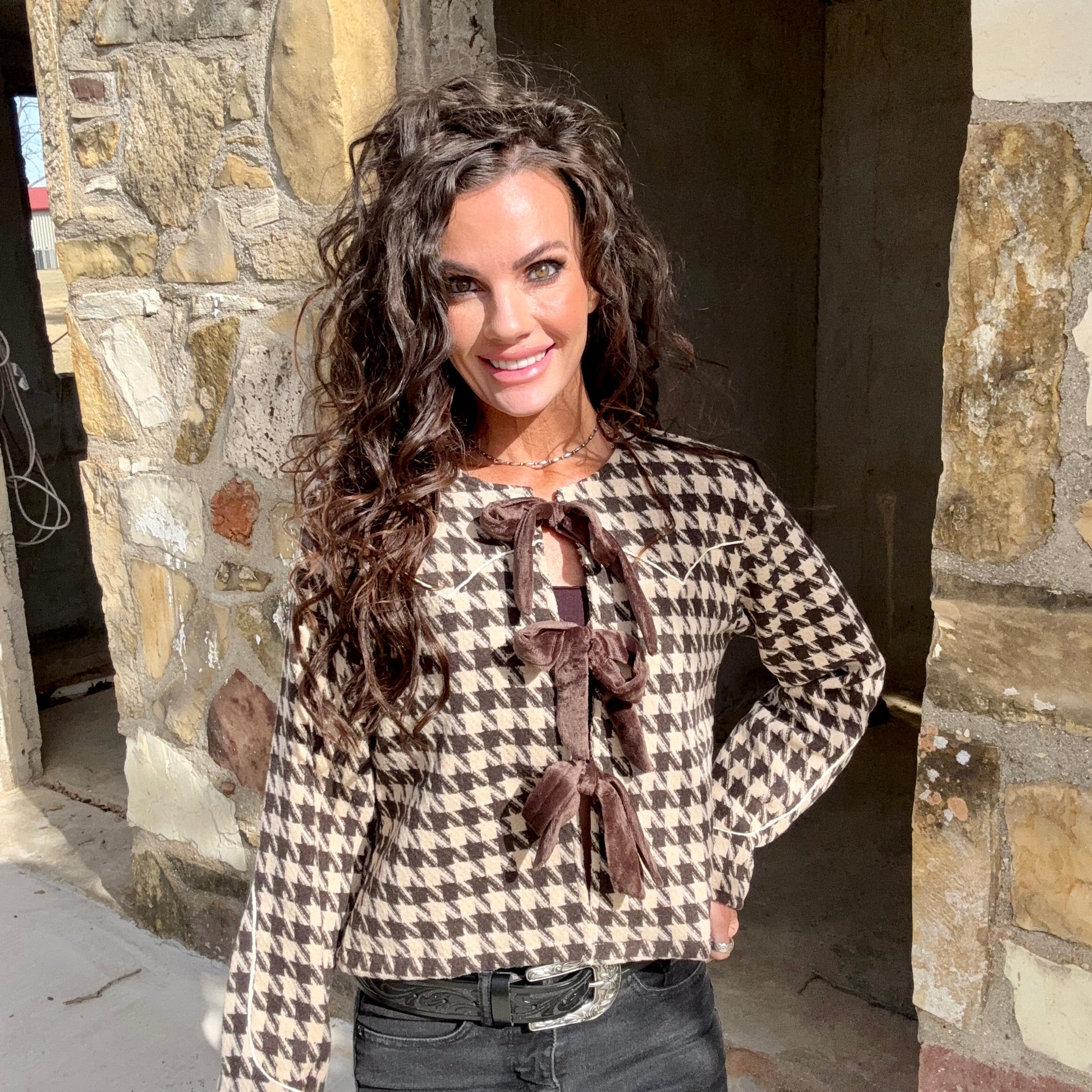 Bring timeless charm to your western wardrobe with this houndstooth tie-front sweater. Featuring rich chocolate-brown velvet bows and soft neutral tones, this piece blends classic sophistication with cowgirl flair. The lightweight knit makes it perfect for layering under a jacket or tucking into your favorite denim, while the playful bow ties add a touch of femininity and polish.
