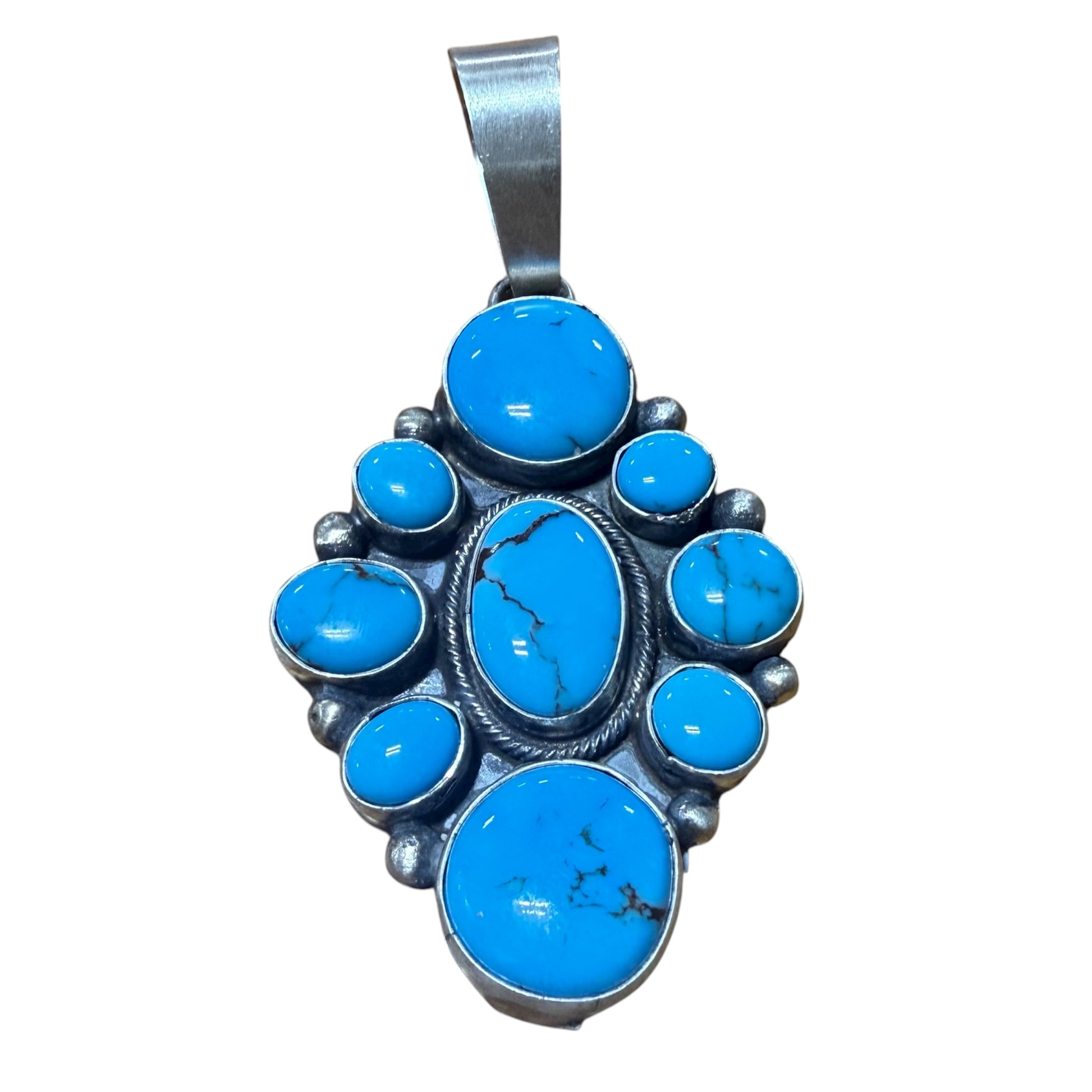 This striking Navajo pendant by renowned artisan Ella Peters highlights a classic Southwestern cluster design. The piece showcases nine vivid blue turquoise cabochons, each with natural matrix veining, set in smooth sterling silver bezels and accented by polished silver drop beads.