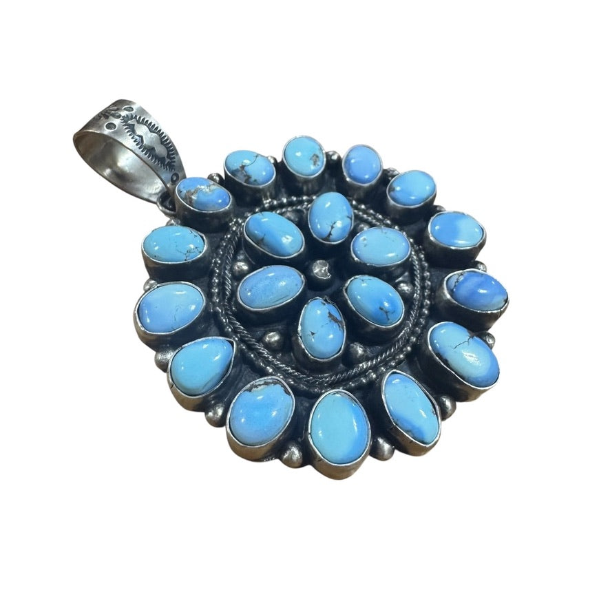 This exquisite pendant by Navajo silversmith Ella Peters showcases a breathtaking Golden Hills turquoise cluster in a classic round design. Each sky-blue stone is hand-selected and bezel-set, revealing subtle lavender undertones and warm brown matrix that reflect the natural beauty of the Mongolian mine.