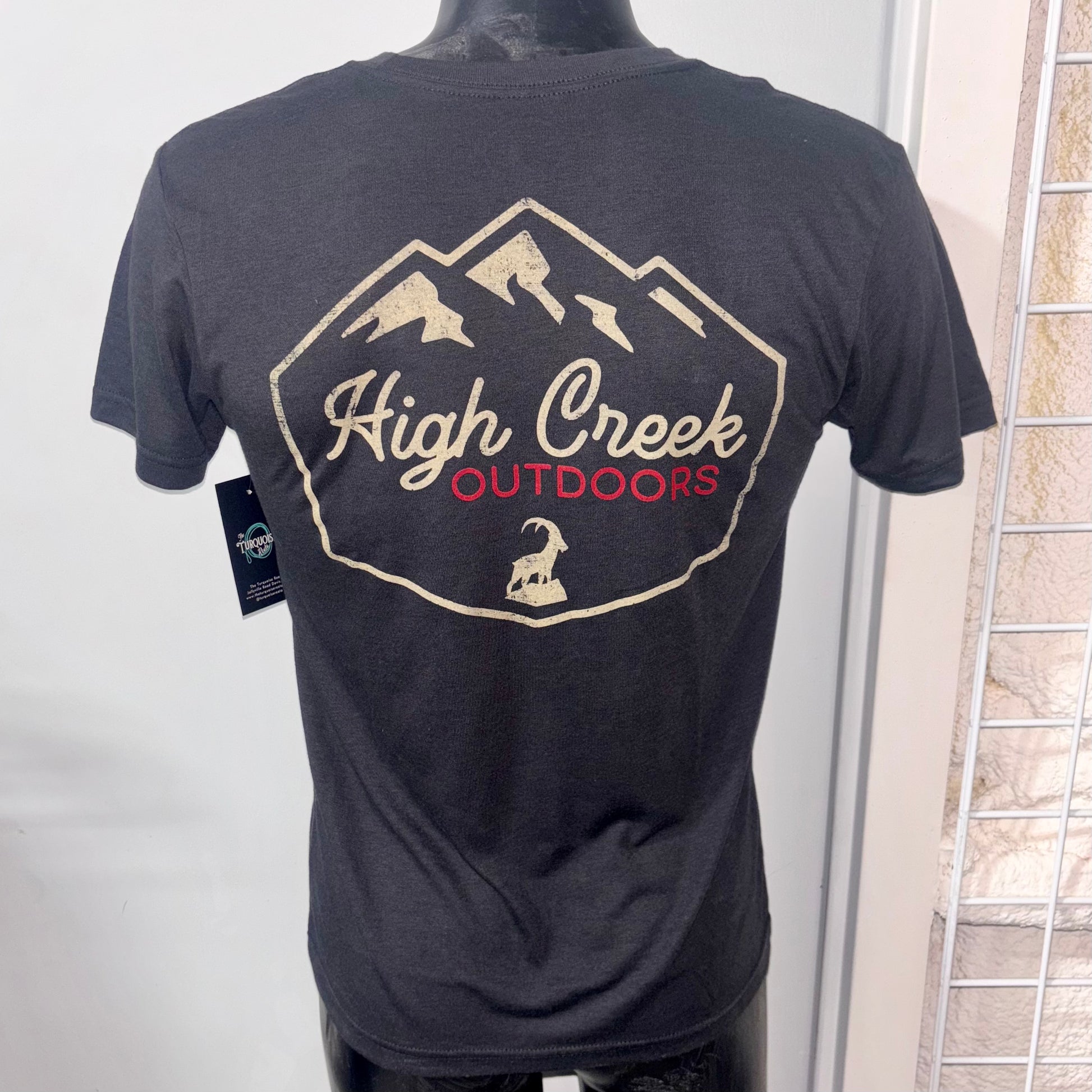 Soft, rugged, and ready for the outdoors — this charcoal black tee features a High Creek Outdoors chest logo with mountain graphics. Perfect for everyday Western wear and layering.