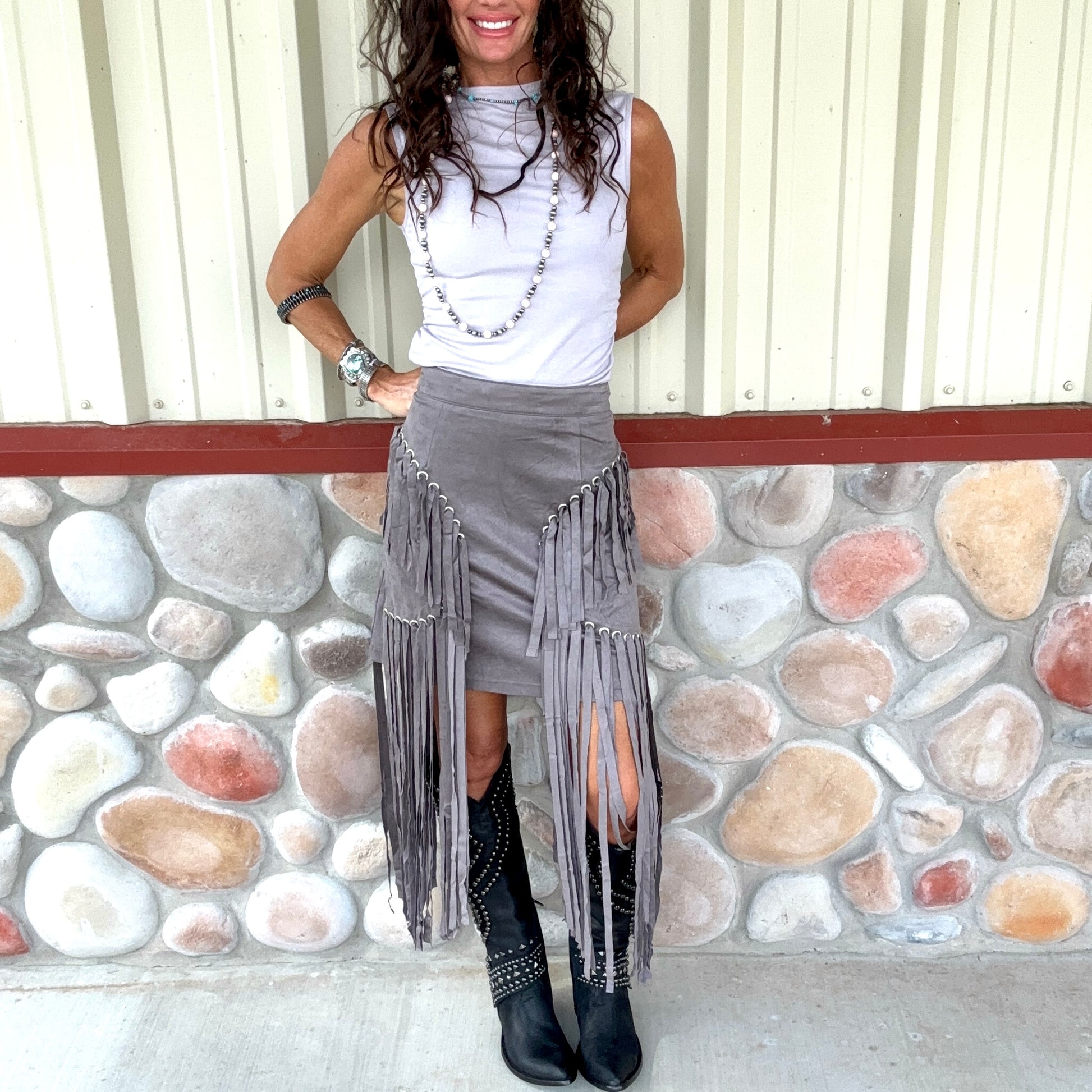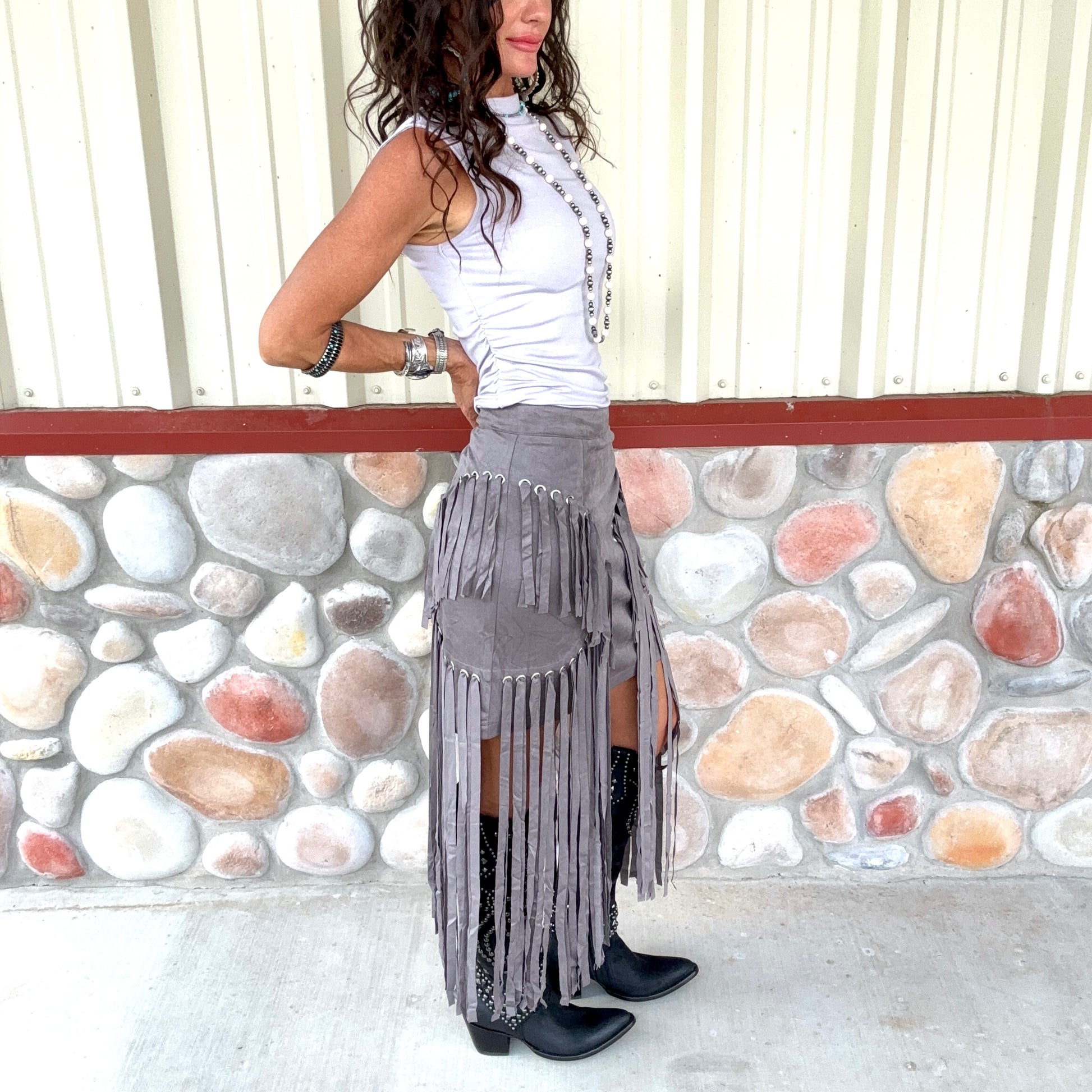 Turn heads in this daring fringe suede skirt, designed for the modern cowgirl with a bold sense of style. Crafted in a rich gray faux suede, it features dramatic fringe panels that sway with every step, creating movement and attitude. Metal grommet accents add a touch of edge, while the fitted mini base keeps the silhouette sleek and flattering. Perfect for concerts, nights out, or making a statement at any Western-inspired event.