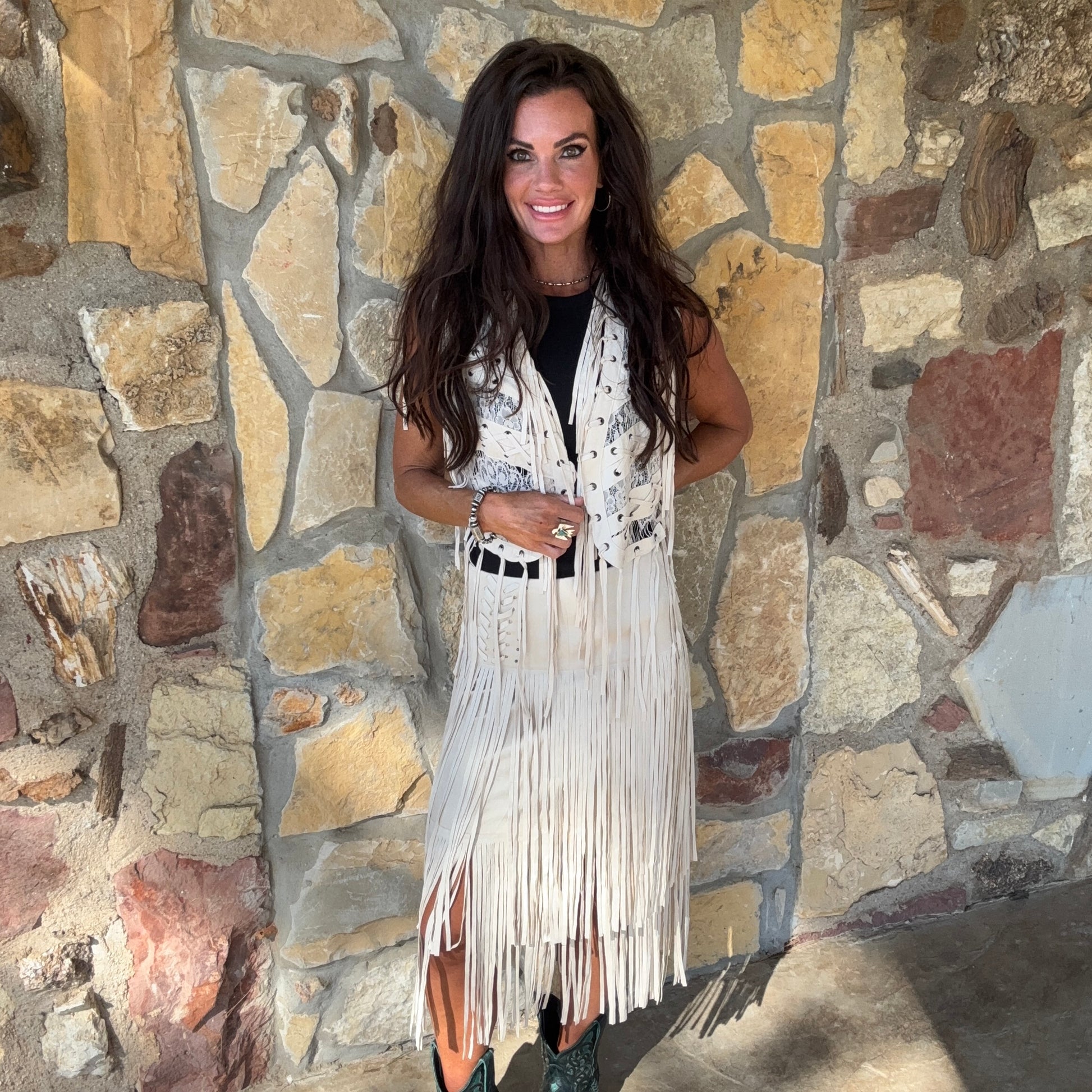 Bring the movement, the texture, and the attitude with the Dust Dancer Fringe Skirt. Crafted from soft cream faux suede, this skirt features full-length fringe that sways with every step — pure cowgirl energy from rodeo nights to concert lights. The lace-up detailing at the waist adds a flattering, feminine touch while keeping that Western edge. Pair it with boots, a fitted tee, or a fringe vest for a head-turning look that’s equal parts bold and timeless.