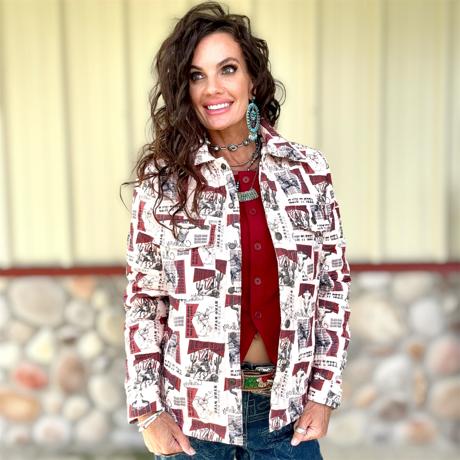 Bring bold Western style to cooler days with this eye-catching quilted jacket. Featuring a dusty cream base covered in marlboro-inspired patchwork prints—including bronc riders, cowboy motifs, and rustic signage—this jacket blends cozy comfort with true cowgirl attitude. The lightweight quilted design keeps you warm without feeling bulky, while the button-front closure and shirt-style collar add a classic, laid-back vibe.