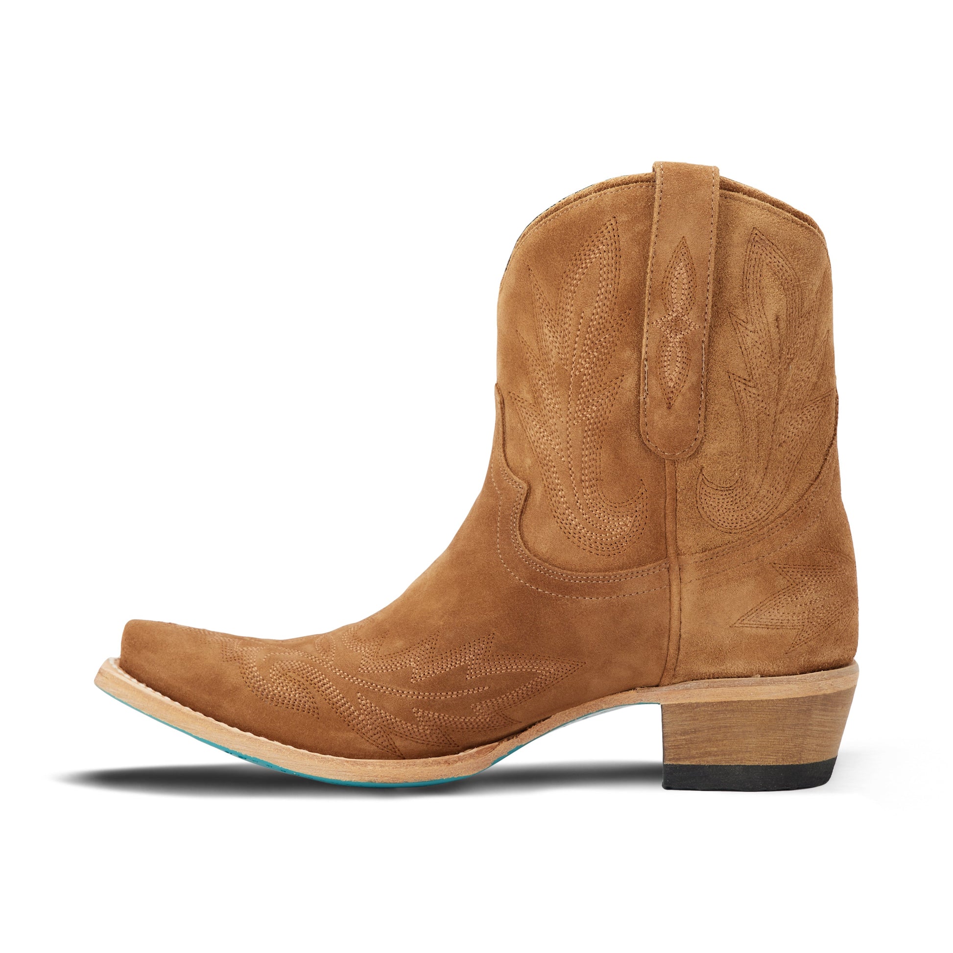 Heirloom quality ankle boots with a western influence. The classic snip toe profile is embroidered to perfection with a twist on traditional flame stitch in bootie form. She's short, sweet, and just the right height to pair well with your wardrobe.