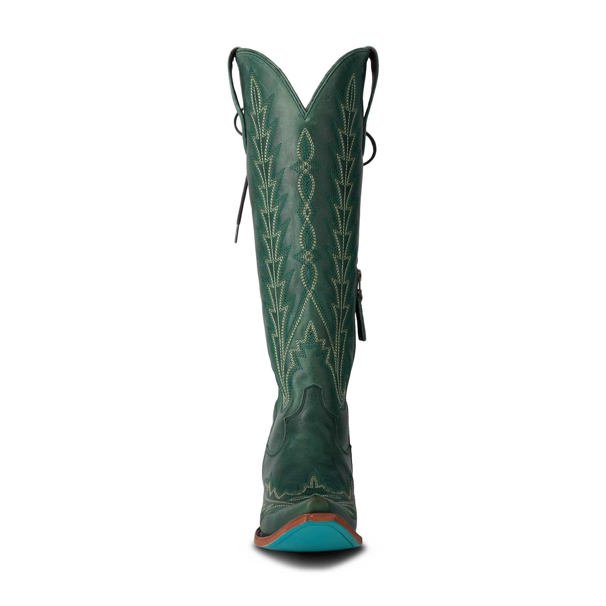 Heirloom quality with a core western influence. The classic snip toe profile is embroidered to perfection with a twist on traditional flame stitch and a functional corset back. The Lexington Knee-High is timeless and sexy all wrapped in one.