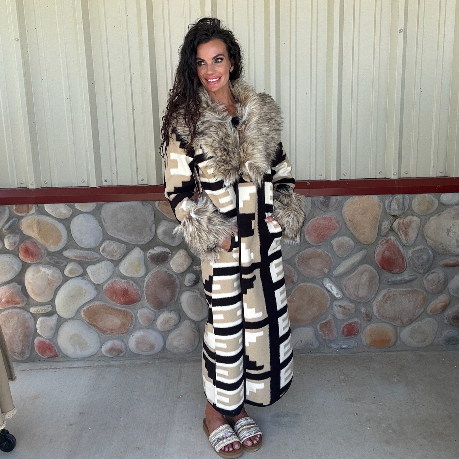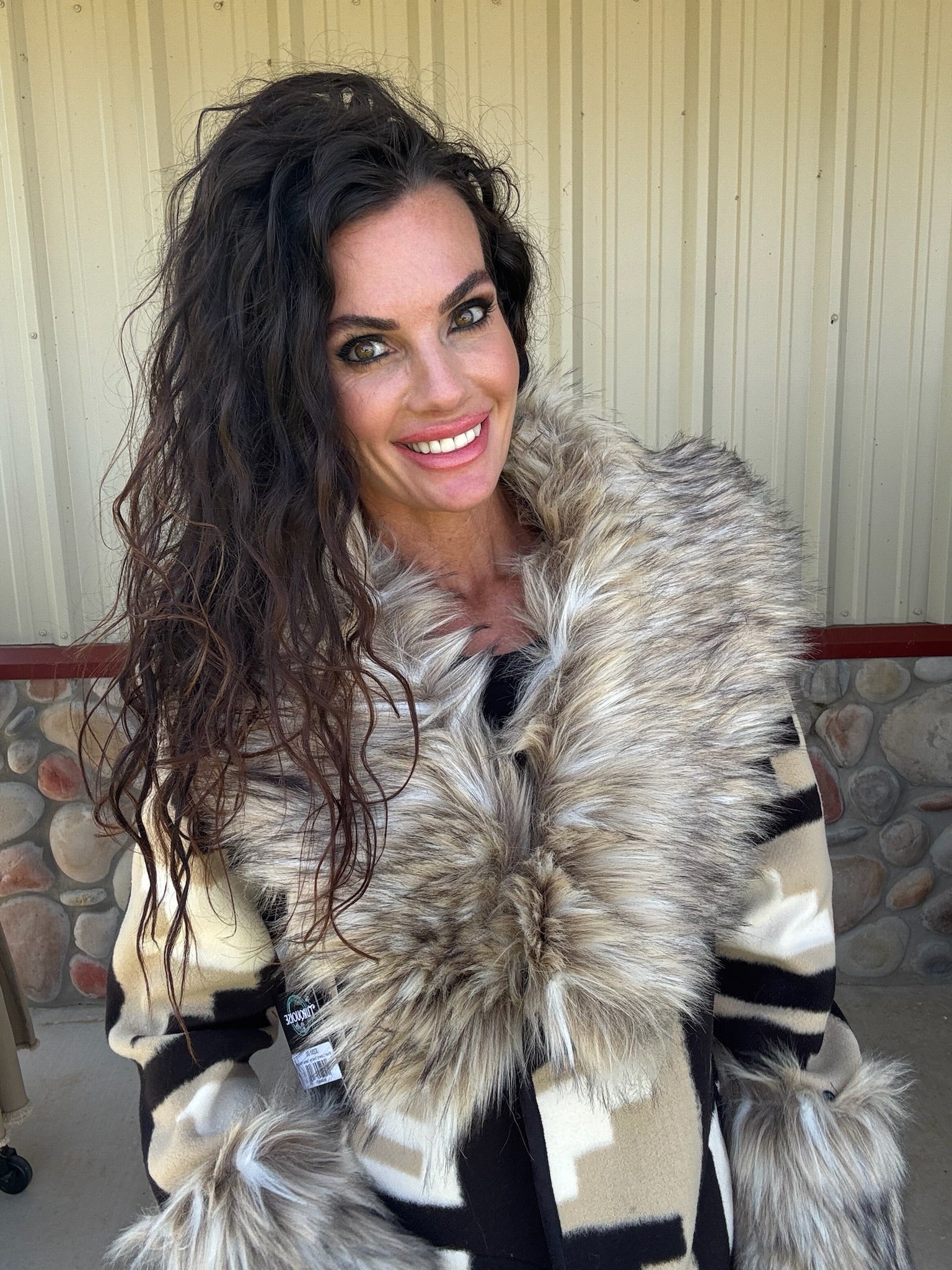 Channel timeless Western luxury in the stunning Liberty Coat by Tasha Polizzi. Crafted from a rich blend of faux fur, polyester, and acrylic, this statement piece brings cozy sophistication with every wear. From chilly ranch mornings to city nights out, the Casey Coat layers effortlessly over denim, dresses, or leather, adding a bold touch of texture and elegance.