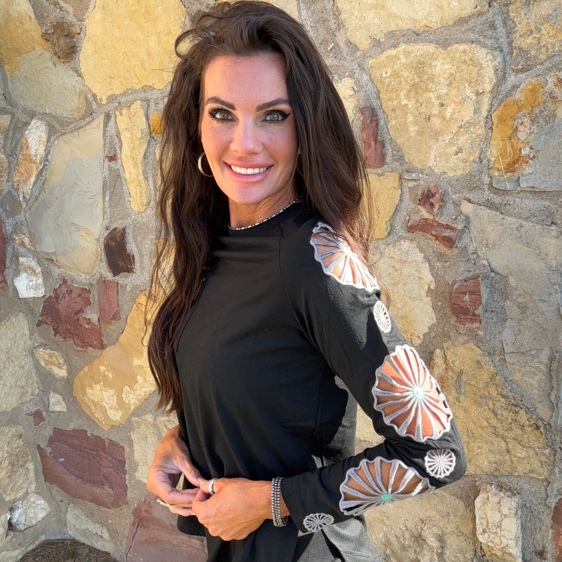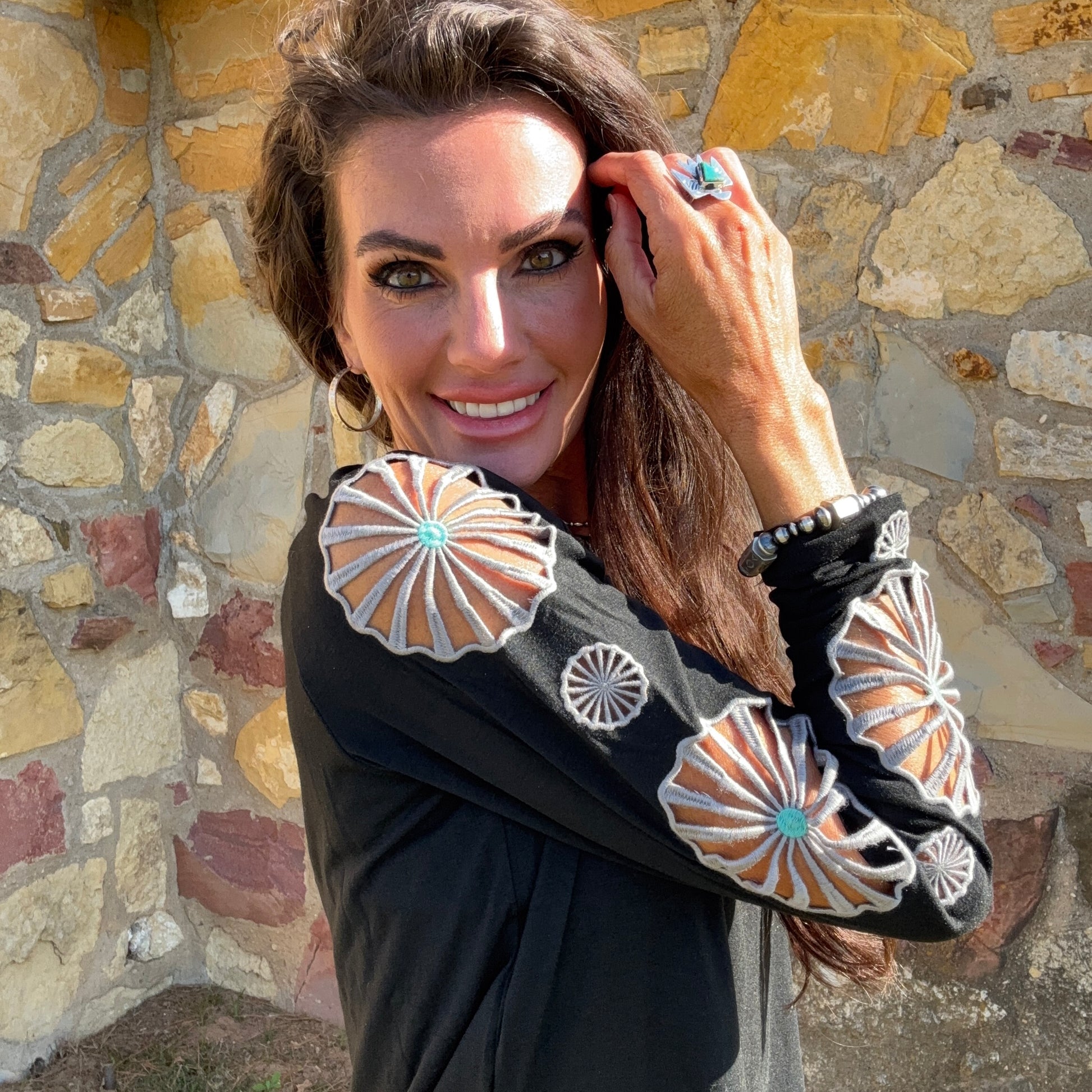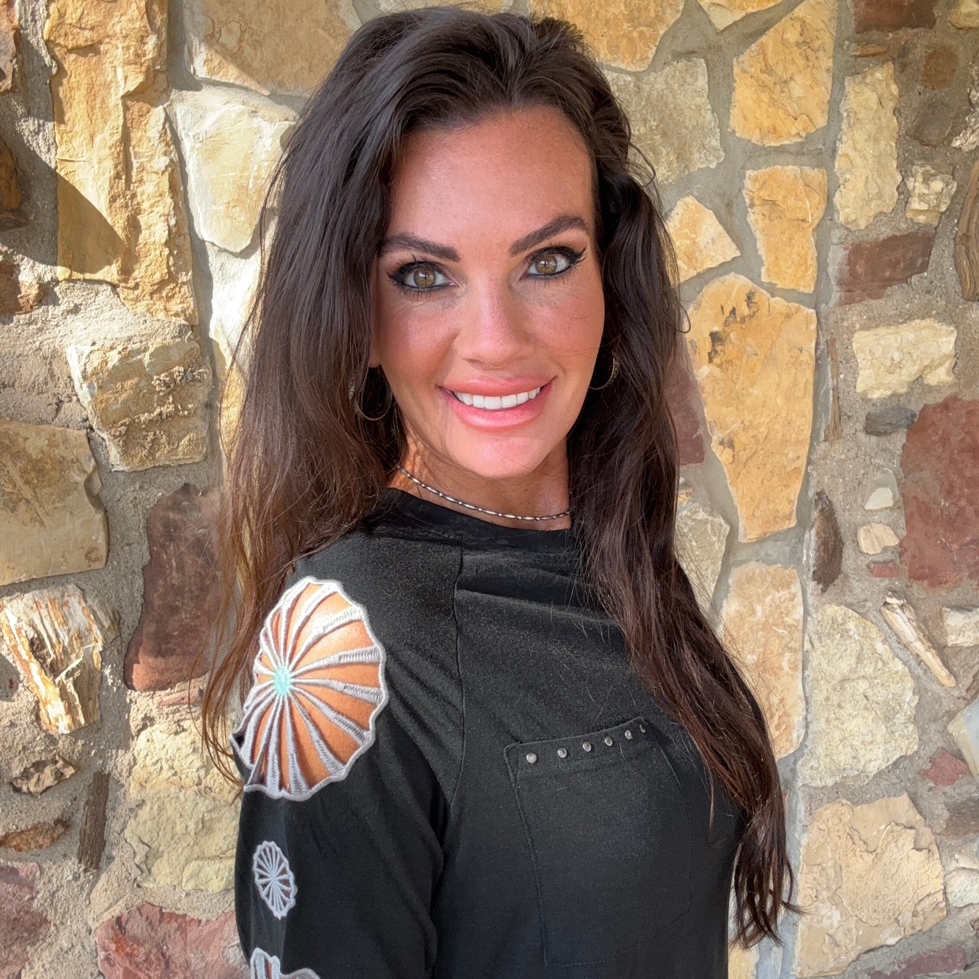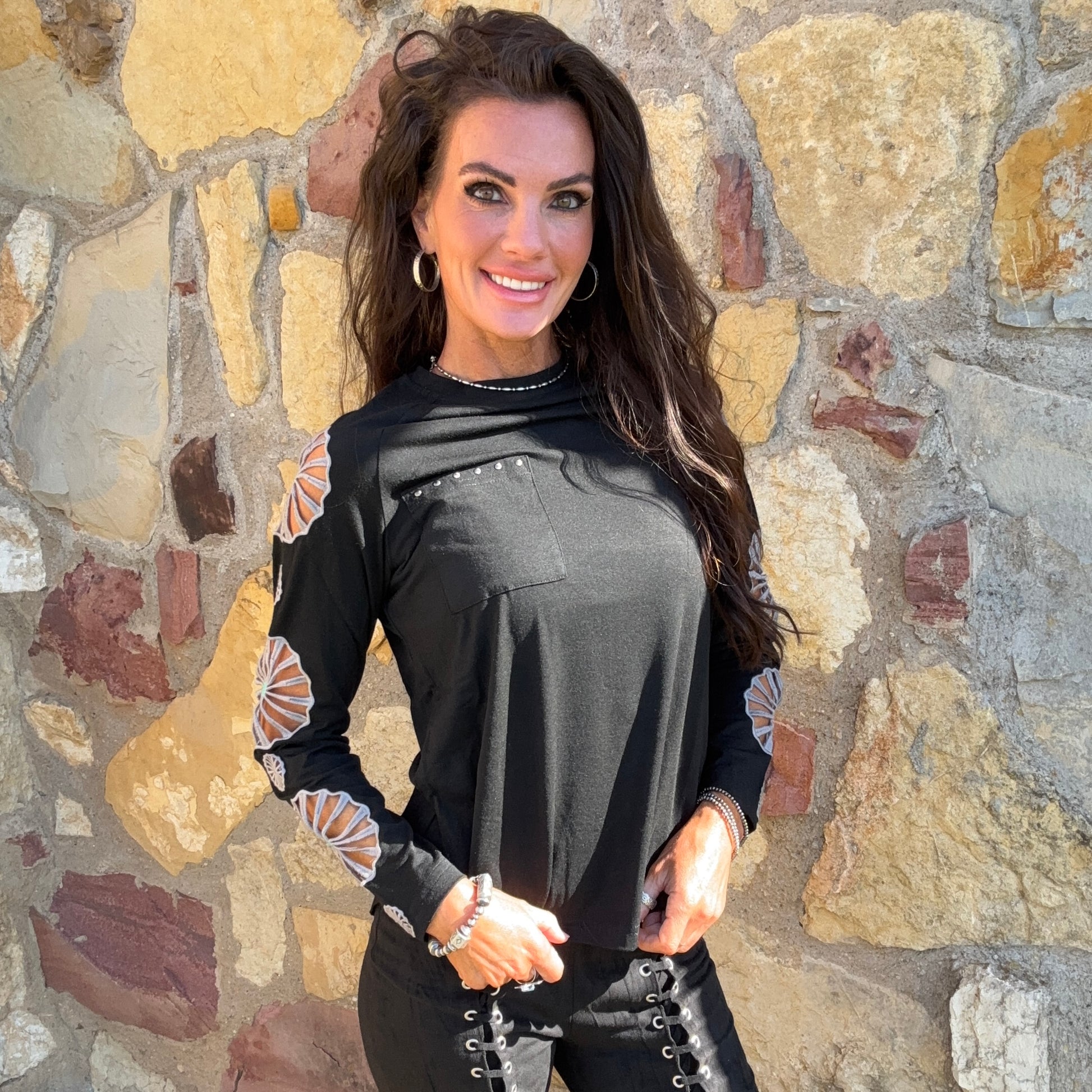 Add a touch of artistry to your everyday style with the Midnight Wagon Cutout Tee. This sleek black top features unique cutout embroidery along the sleeves, designed in warm desert tones that bring a subtle Western flair. The fitted silhouette keeps it flattering and easy to layer — perfect with denim, suede, or turquoise accessories. Effortless, comfortable, and eye-catching, this tee is made for the modern cowgirl who loves a little edge with her charm.