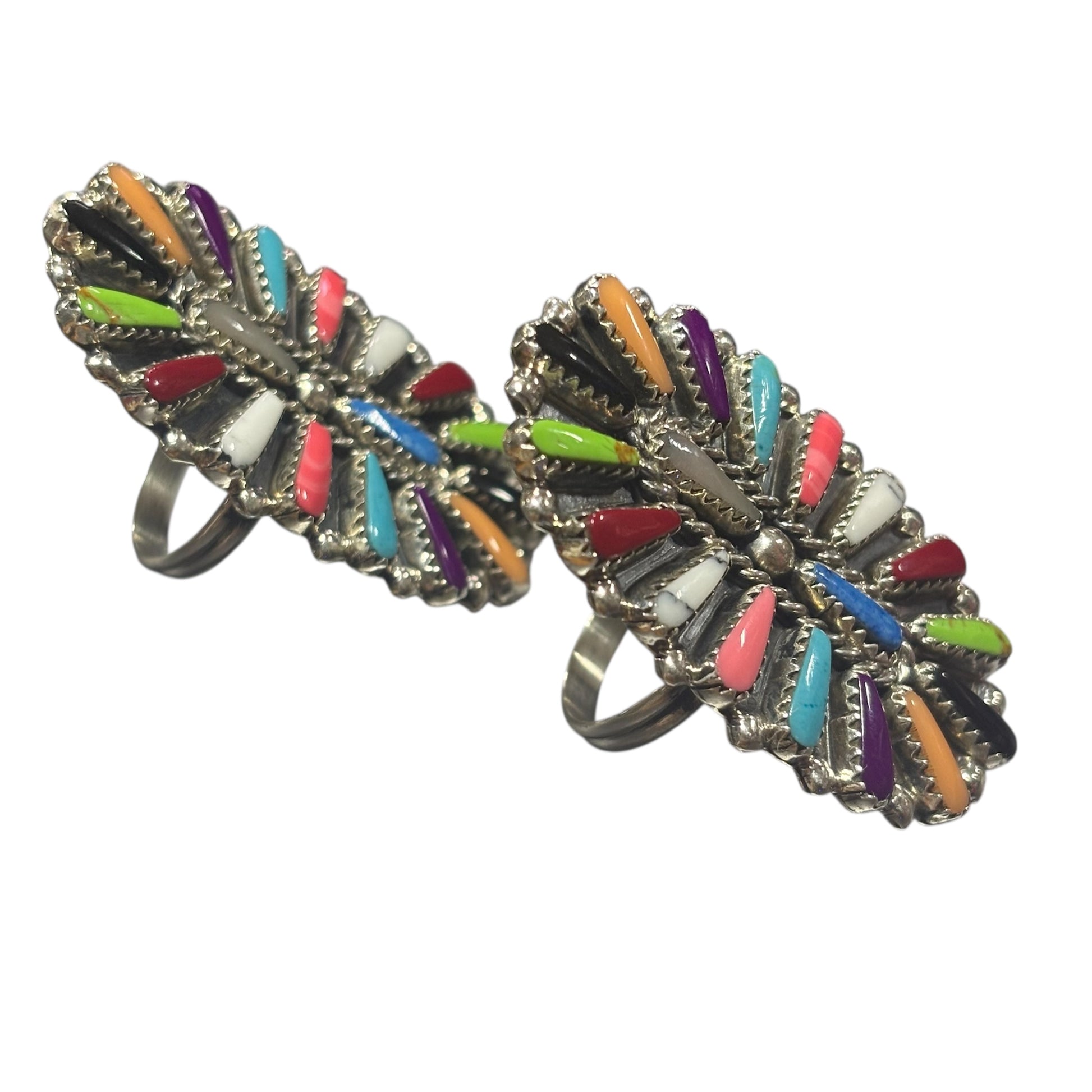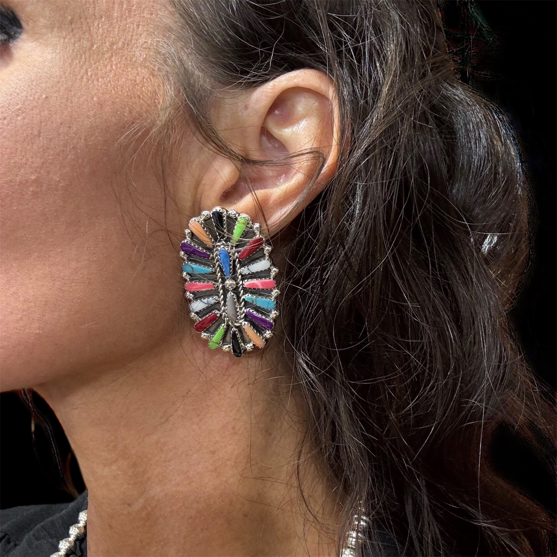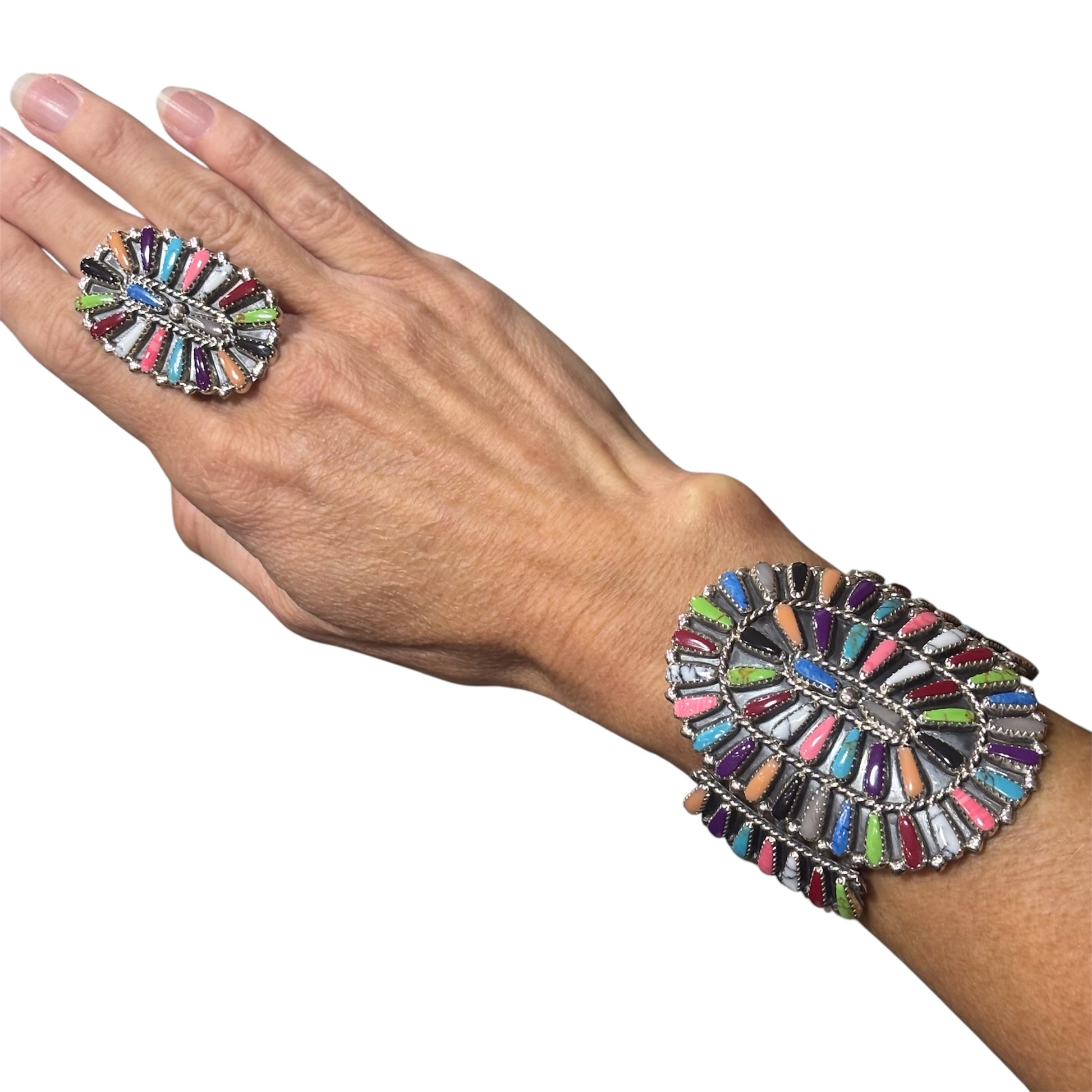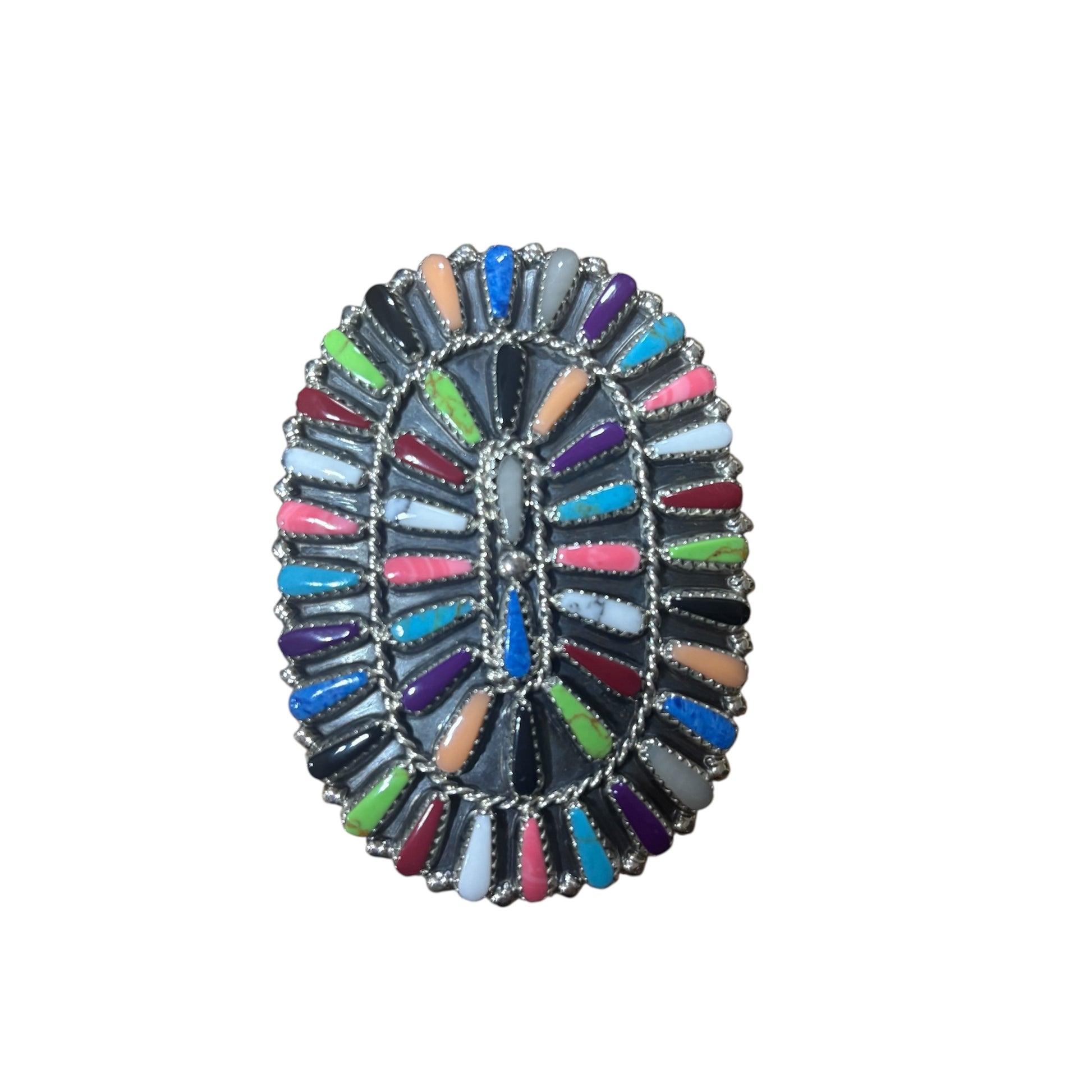 Turn every head in the room with this breathtaking multi-stone cluster set — a true masterpiece of Southwestern artistry. Handcrafted in sterling silver, each piece bursts with an array of vibrant natural stones, all arranged in a signature sunburst cluster design.