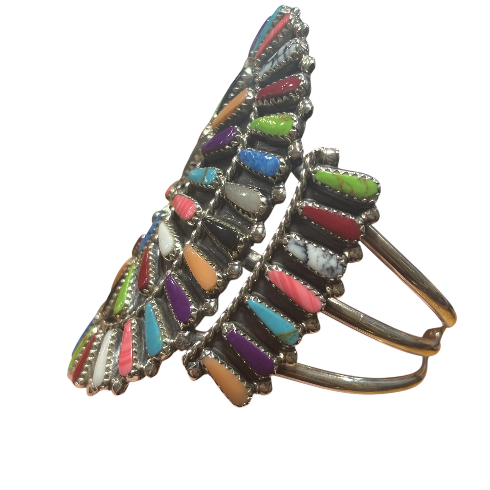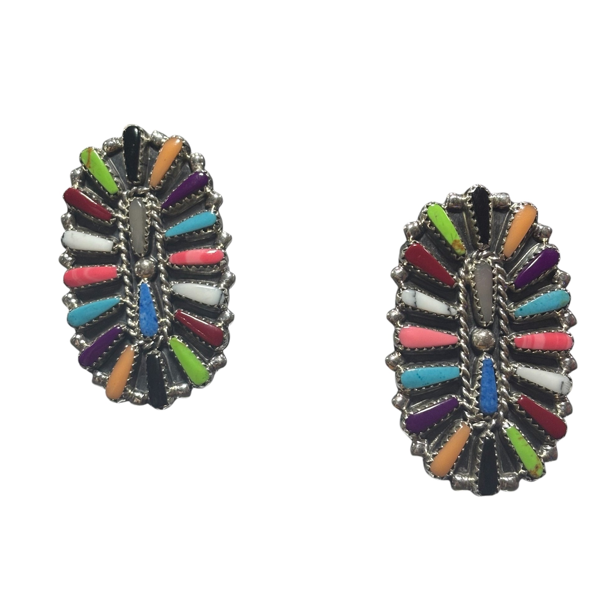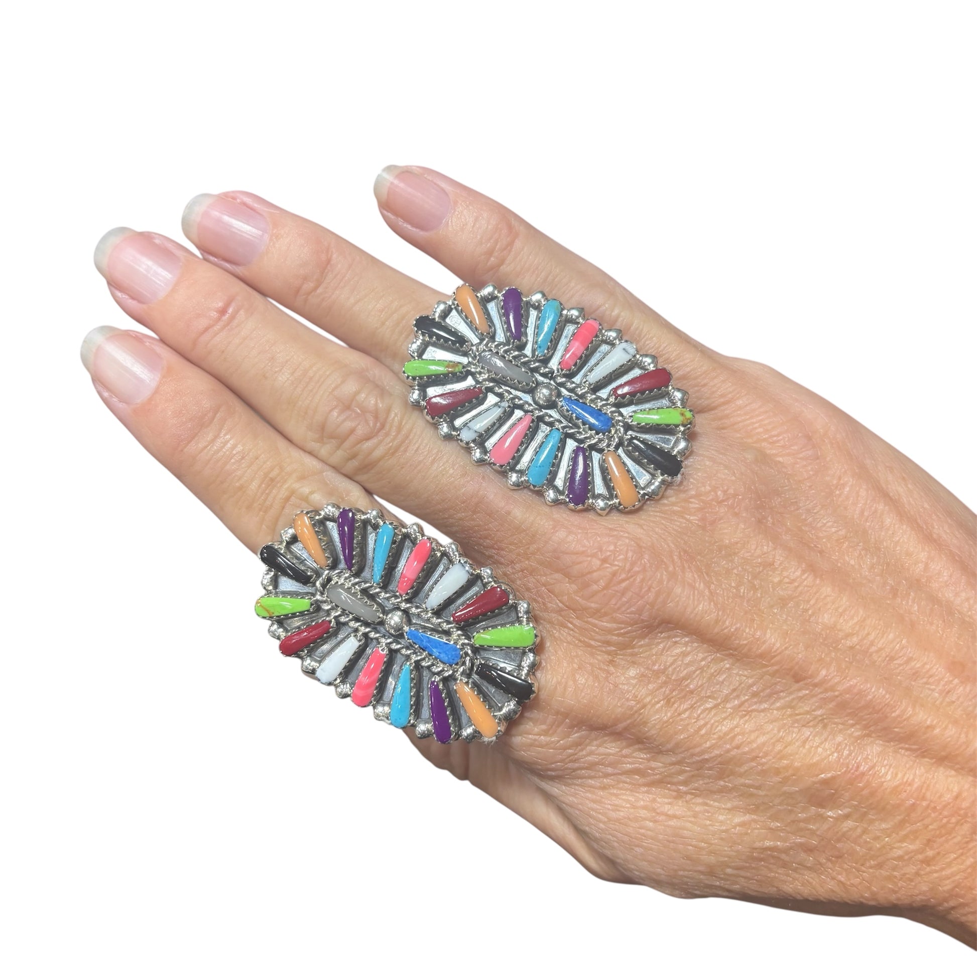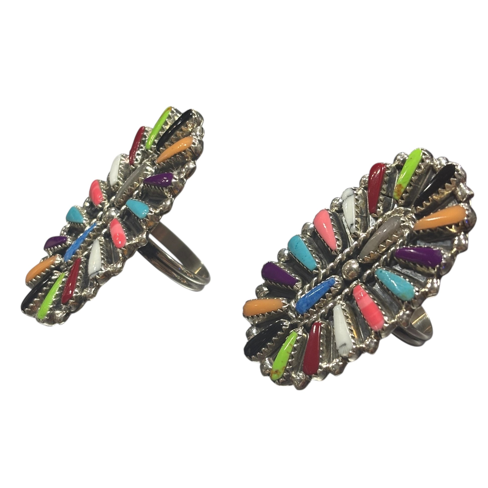 Turn every head in the room with this breathtaking multi-stone cluster set — a true masterpiece of Southwestern artistry. Handcrafted in sterling silver, each piece bursts with an array of vibrant natural stones, all arranged in a signature sunburst cluster design.