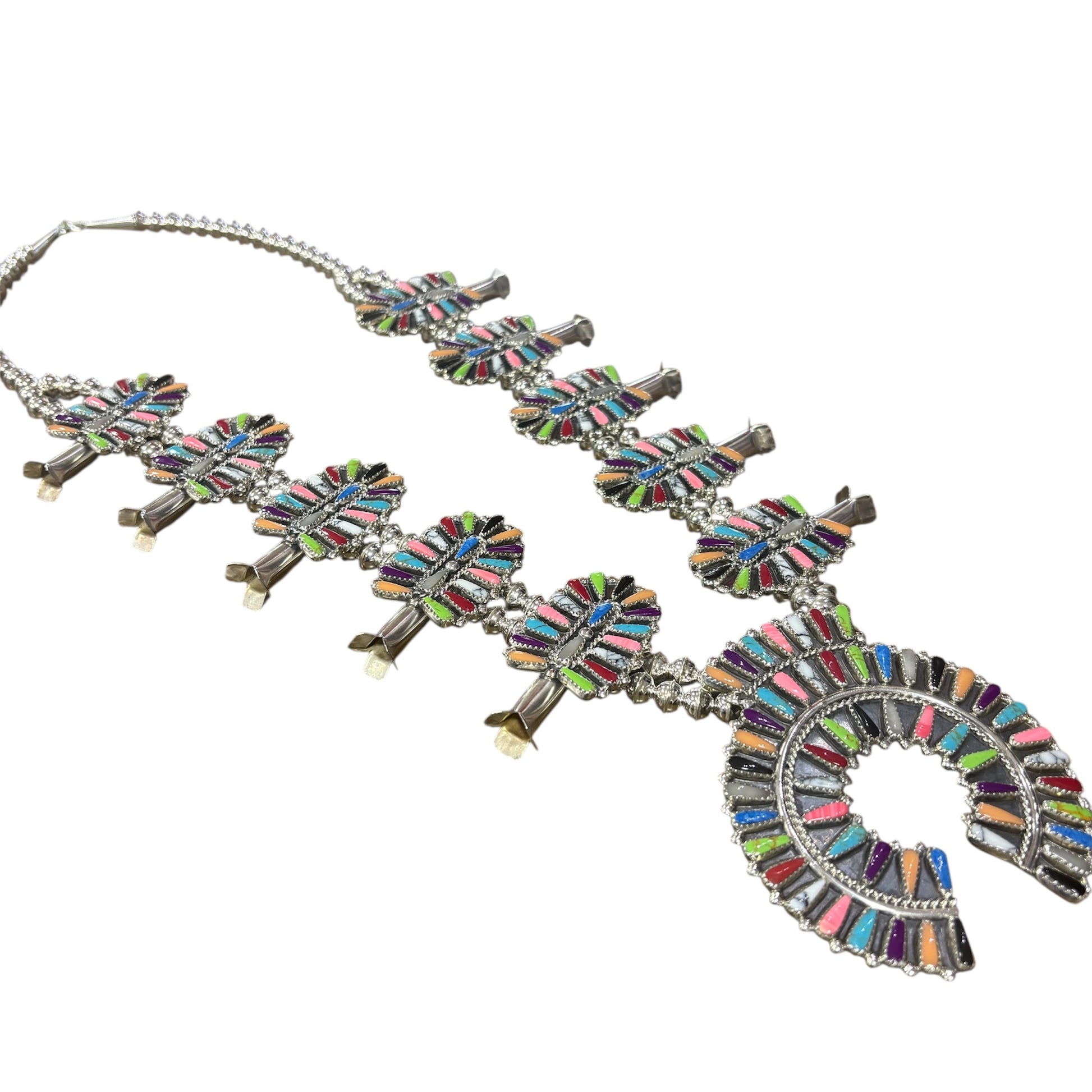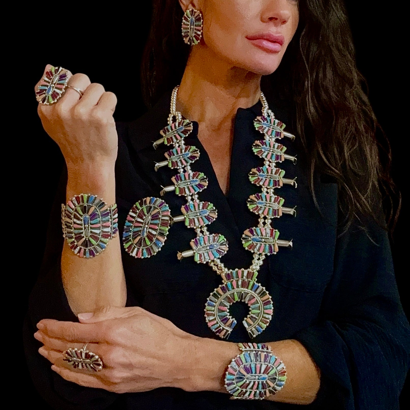Includes: squash blossom necklace, two cuffs, earrings, two rings, and pin