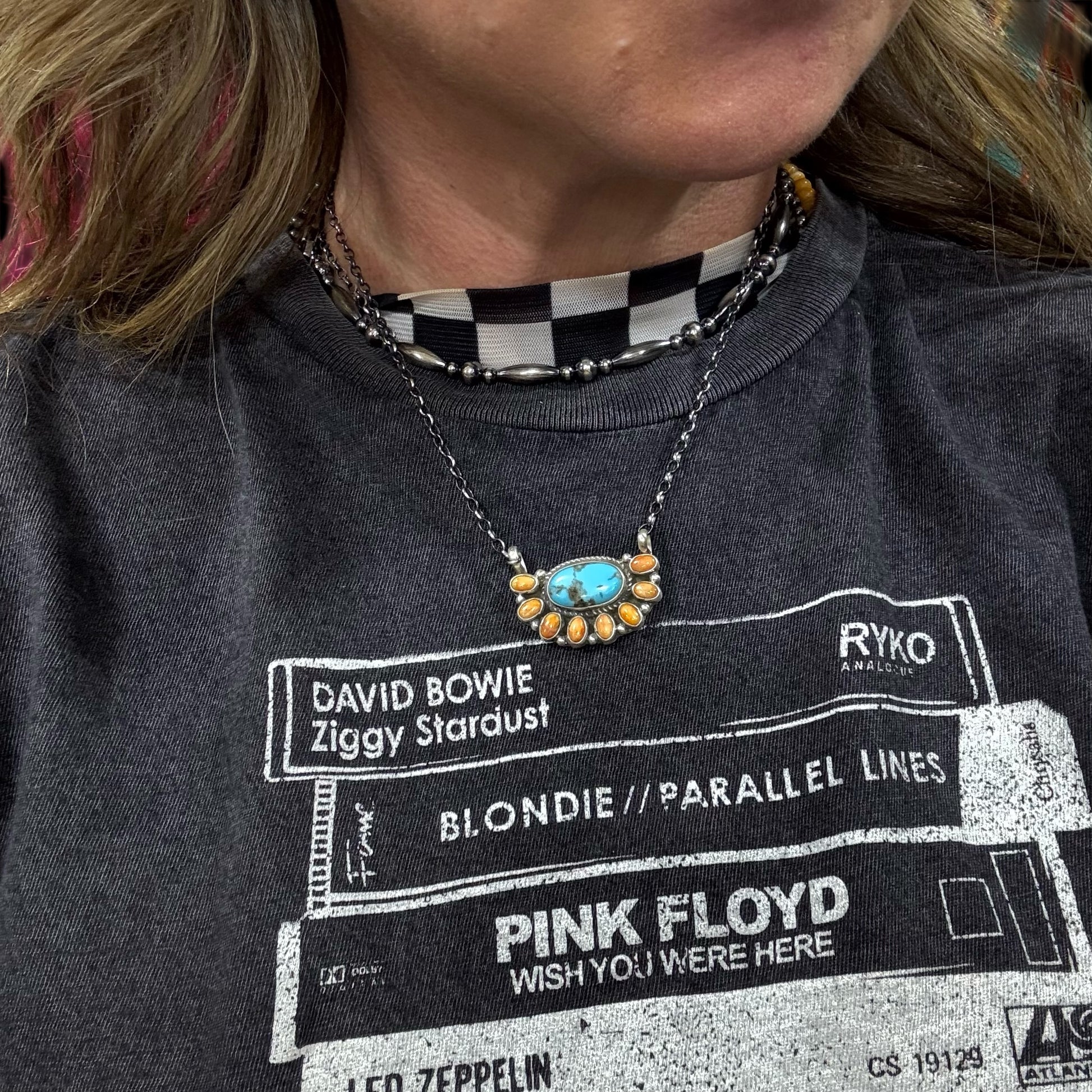 This breathtaking necklace by Navajo artist Geraldine James captures the bold spirit of the Southwest with a perfect balance of color and craftsmanship. Featuring a radiant mix of natural orange spiny oyster and high-grade turquoise stones, each gem is hand-set in sterling silver bezels that highlight their unique textures and hues.
