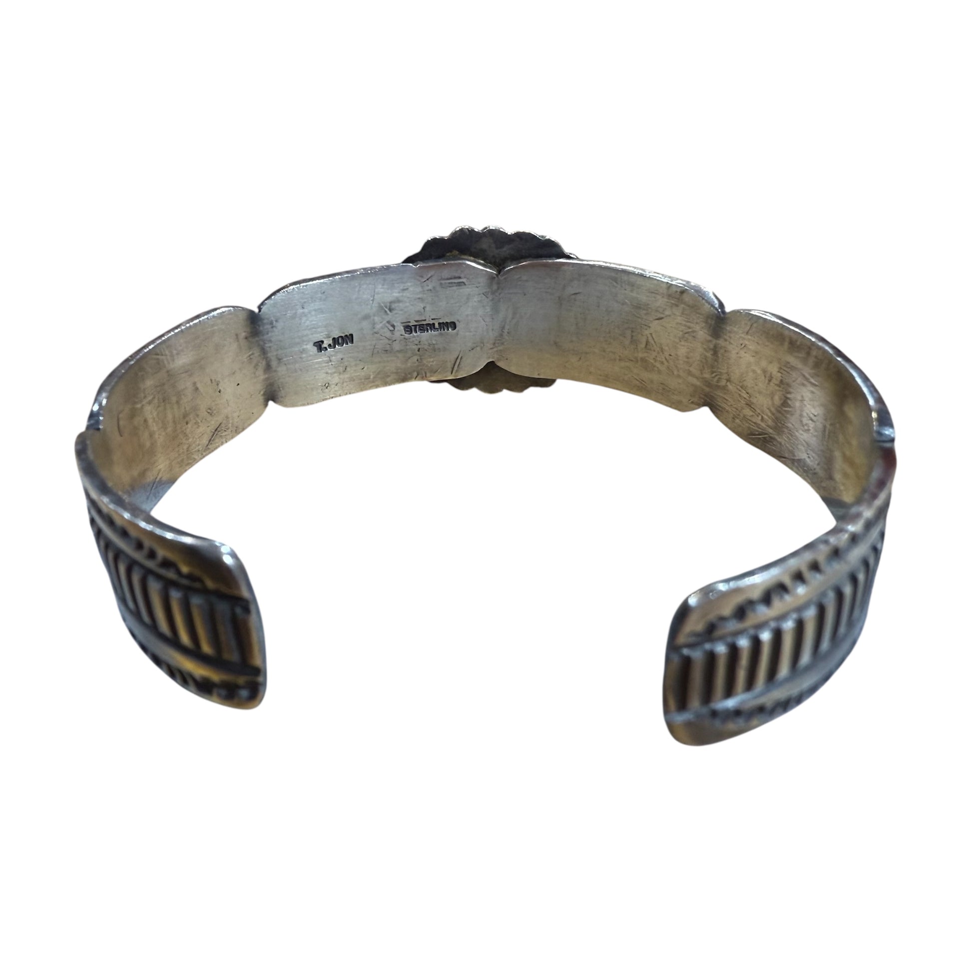 This beautifully handcrafted cuff by Navajo silversmith Tilli John showcases a single, vibrant orange spiny oyster shell cabochon — radiating warmth and desert energy. The stone is framed by a classic blossom-style bezel, surrounded with intricate hand-stamped silverwork and scalloped detailing that reflect Tilli John’s signature craftsmanship.