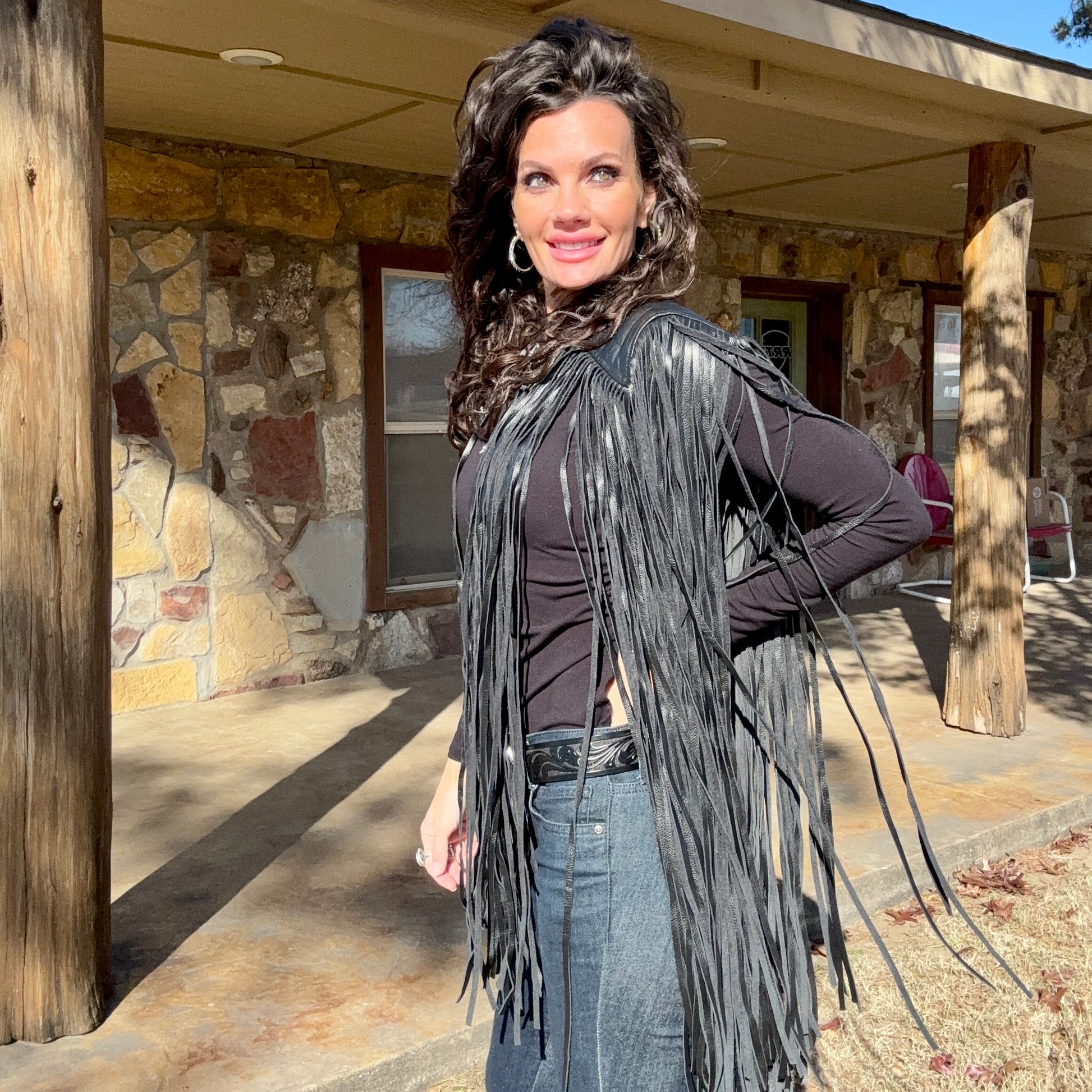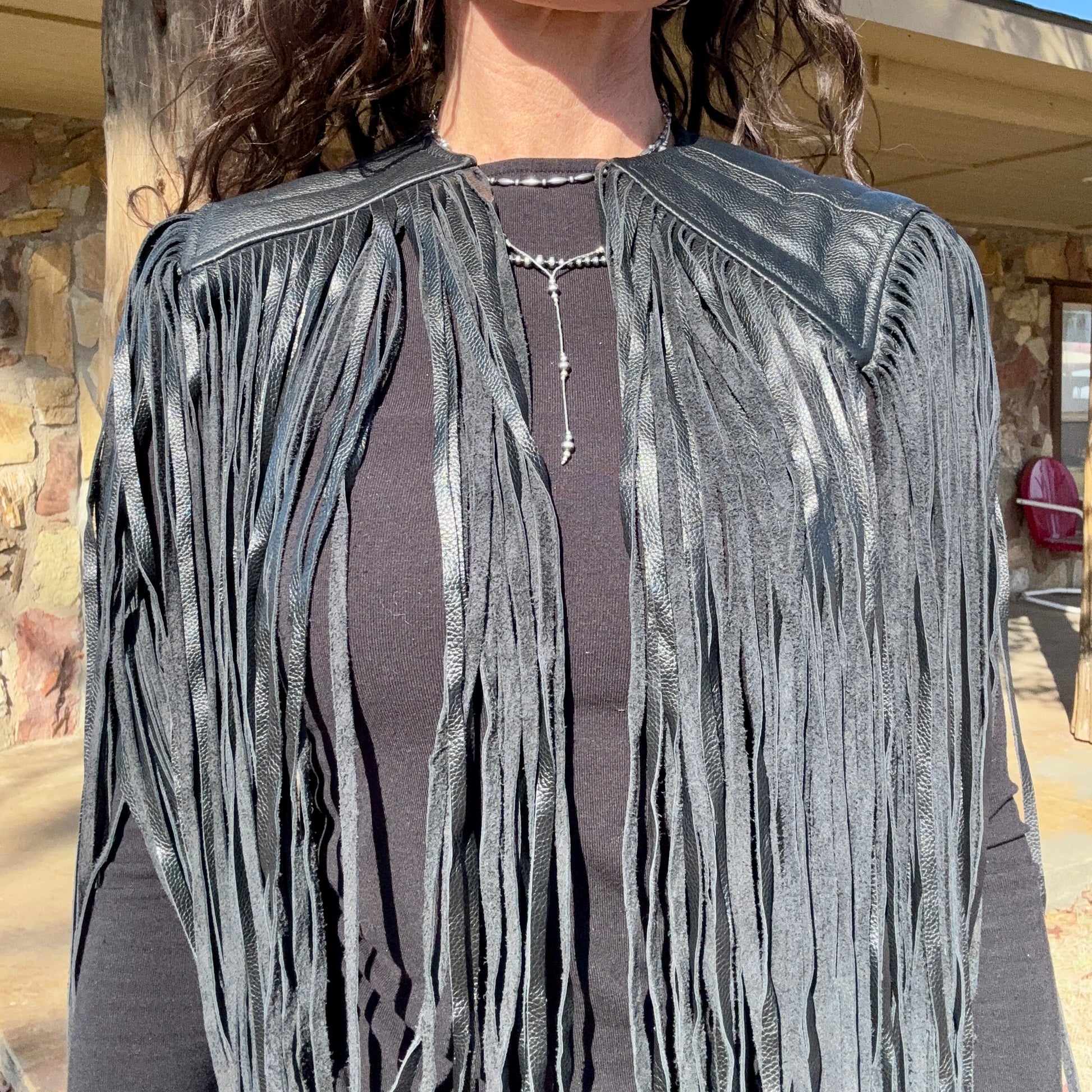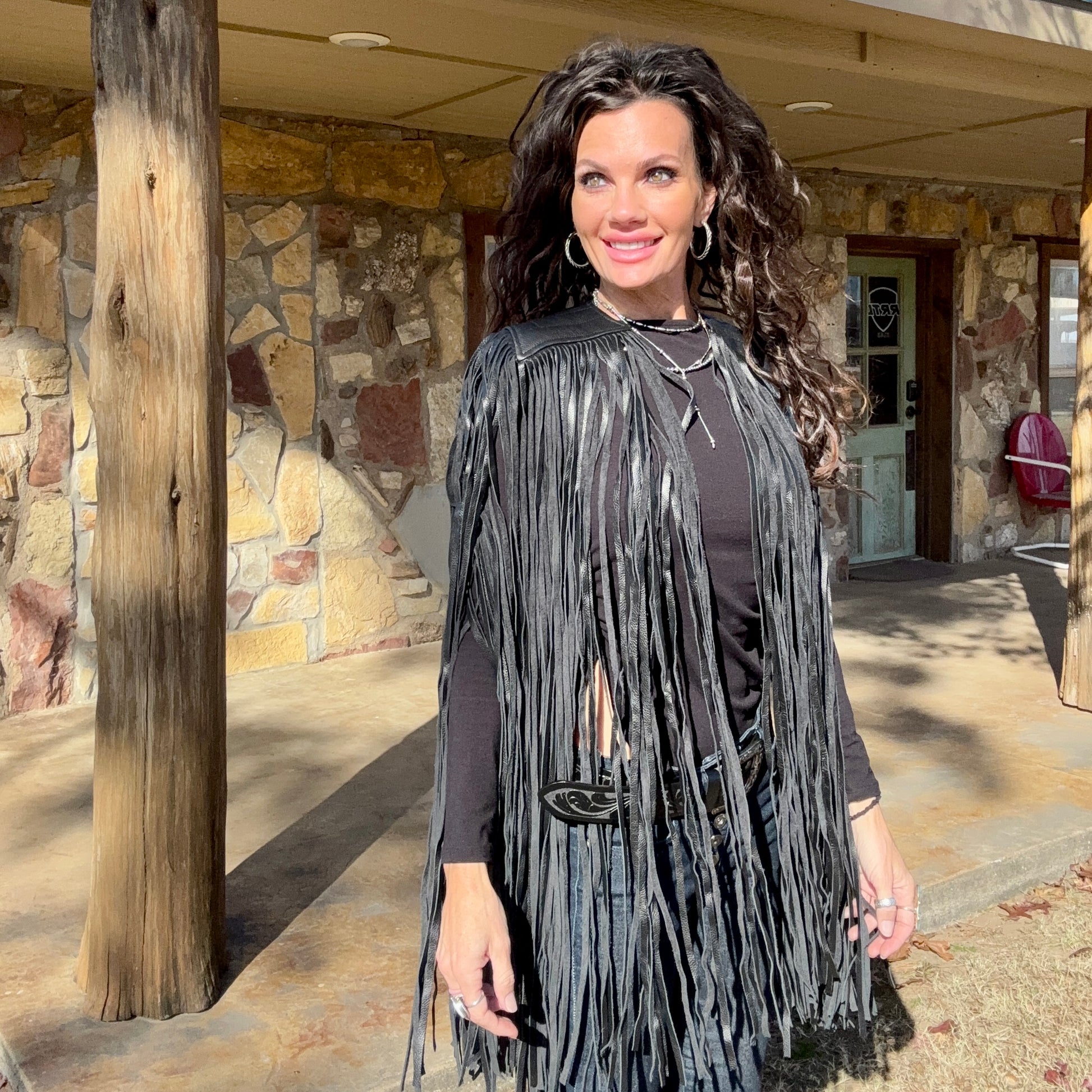 This cape is western rebellion at its finest. Crafted in deep black with cascading fringe from shoulder to hem, the Black Stallion Outlaw Cape adds texture, drama, and undeniable presence to any outfit. Lightweight and open-front, it layers effortlessly while letting your belt, boots, and turquoise shine. Perfect for concerts, rodeo nights, and statement-making everyday wear.