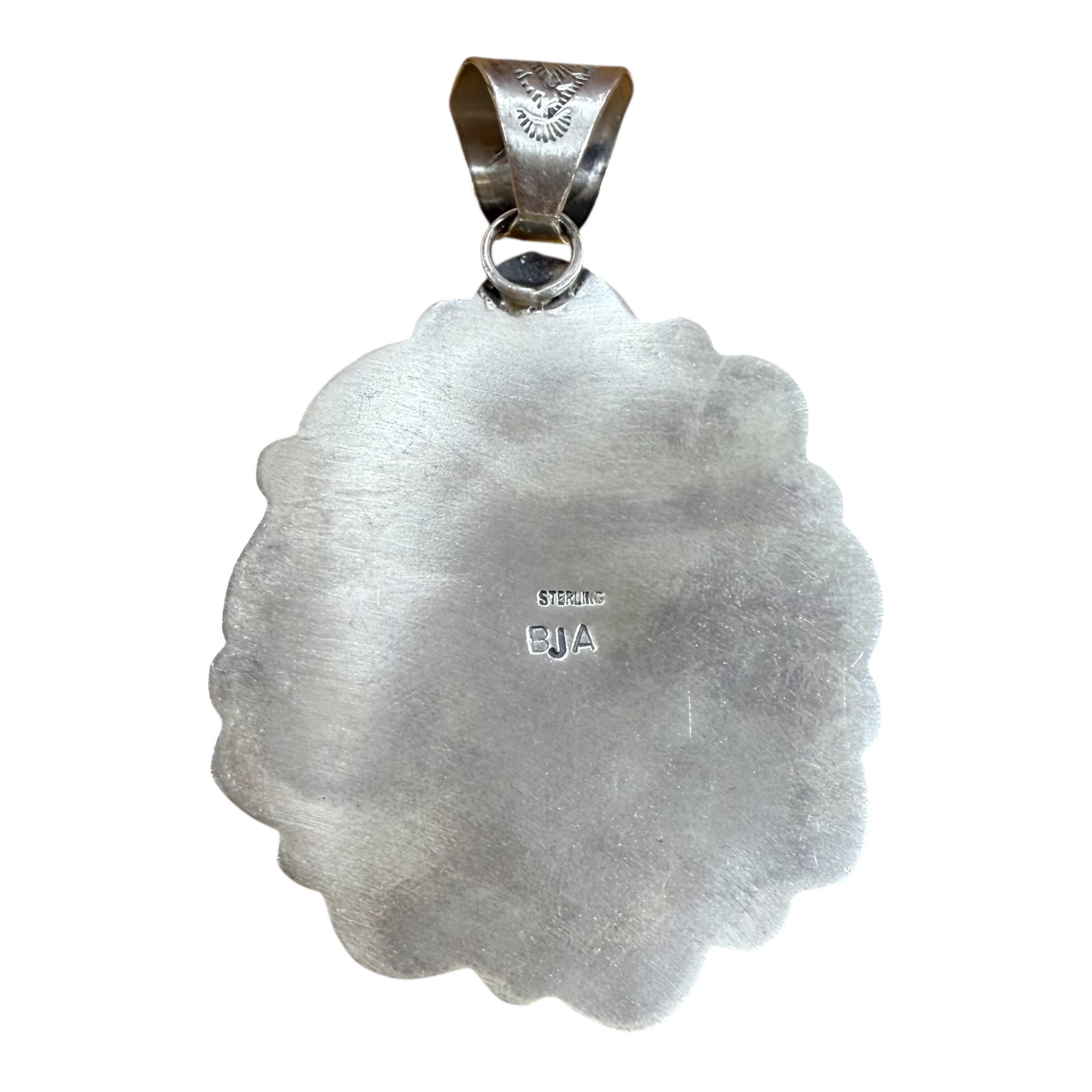 This statement pendant by Navajo silversmith Boyd Ashley showcases the stunning natural beauty of Palomino turquoise. The design features a nine-stone cluster layout, centered around a large freeform cabochon surrounded by eight complementary stones, each hand-cut and set in smooth bezels. The sterling silver base is finished with traditional stamped concho details and a hand-stamped bail, adding depth and character to the piece.