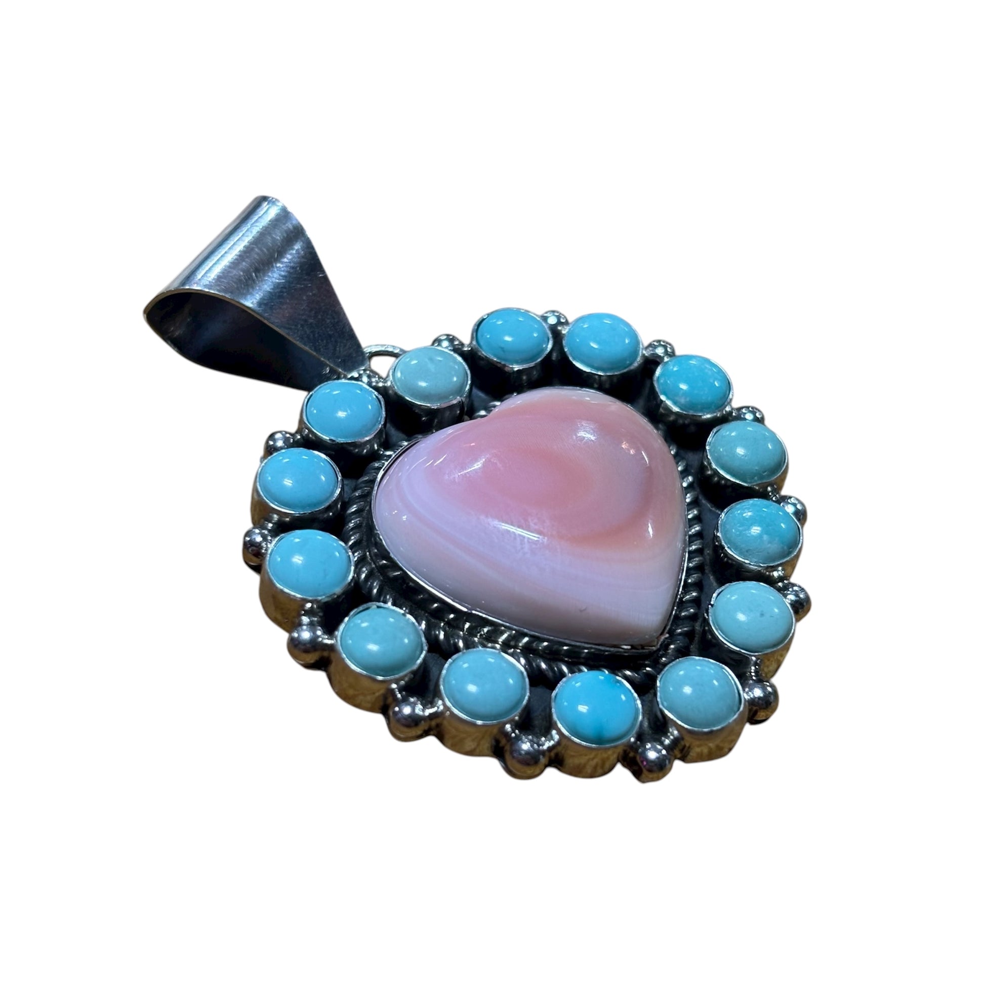 This beautiful three-piece set features a polished pink conch shell heart at the center, framed by a delicate rope-style sterling silver bezel. A halo of vibrant turquoise stones encircles the heart, creating a striking contrast of soft pink and vivid blue.