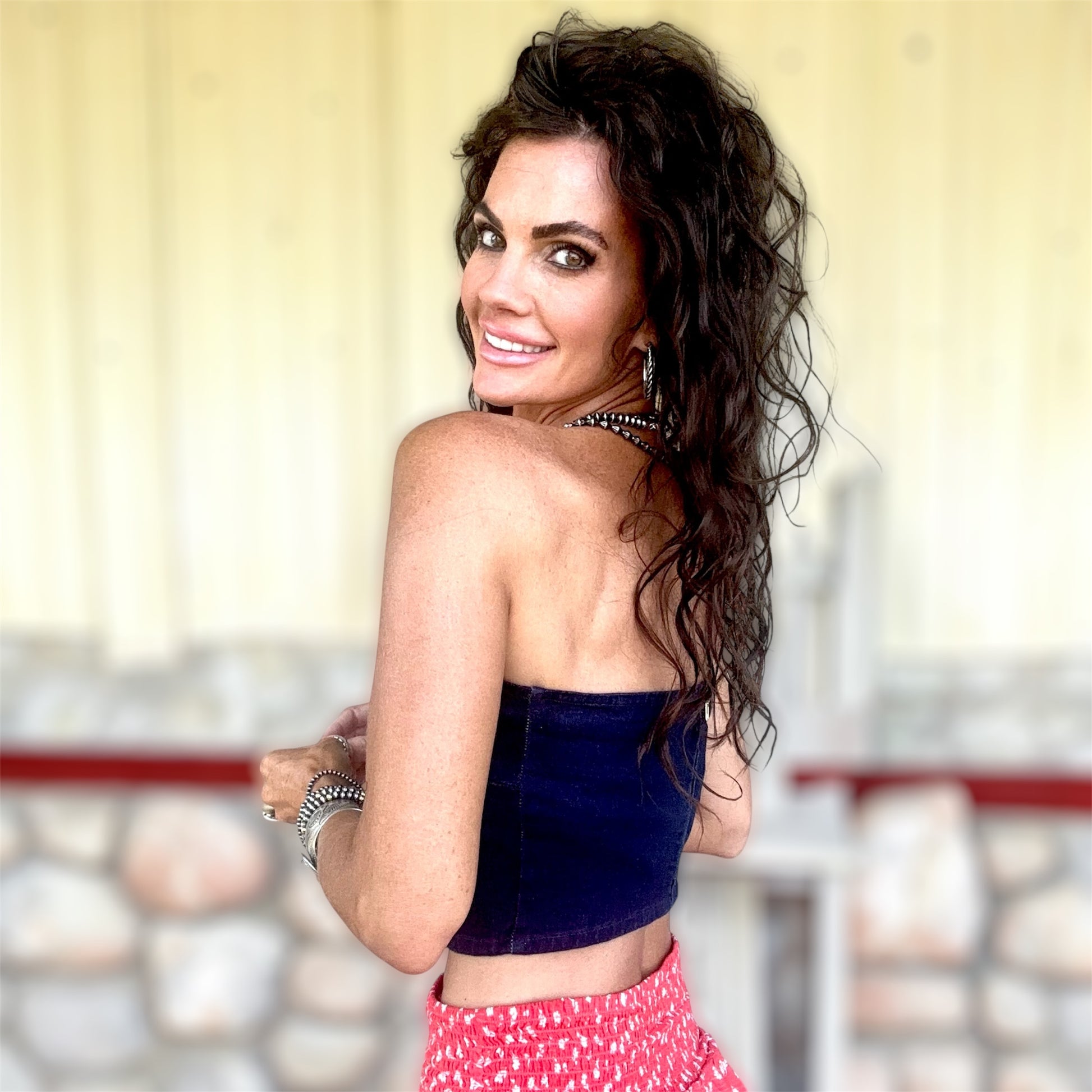 This structured denim top brings modern western style to your wardrobe. Designed with a flattering fitted cut and classic seam detailing, it features a zipper back with a hook-and-eye closure for a secure, tailored fit. The dark rinse denim pairs effortlessly with skirts, trousers, or jeans, making it a timeless staple you can dress up or down.