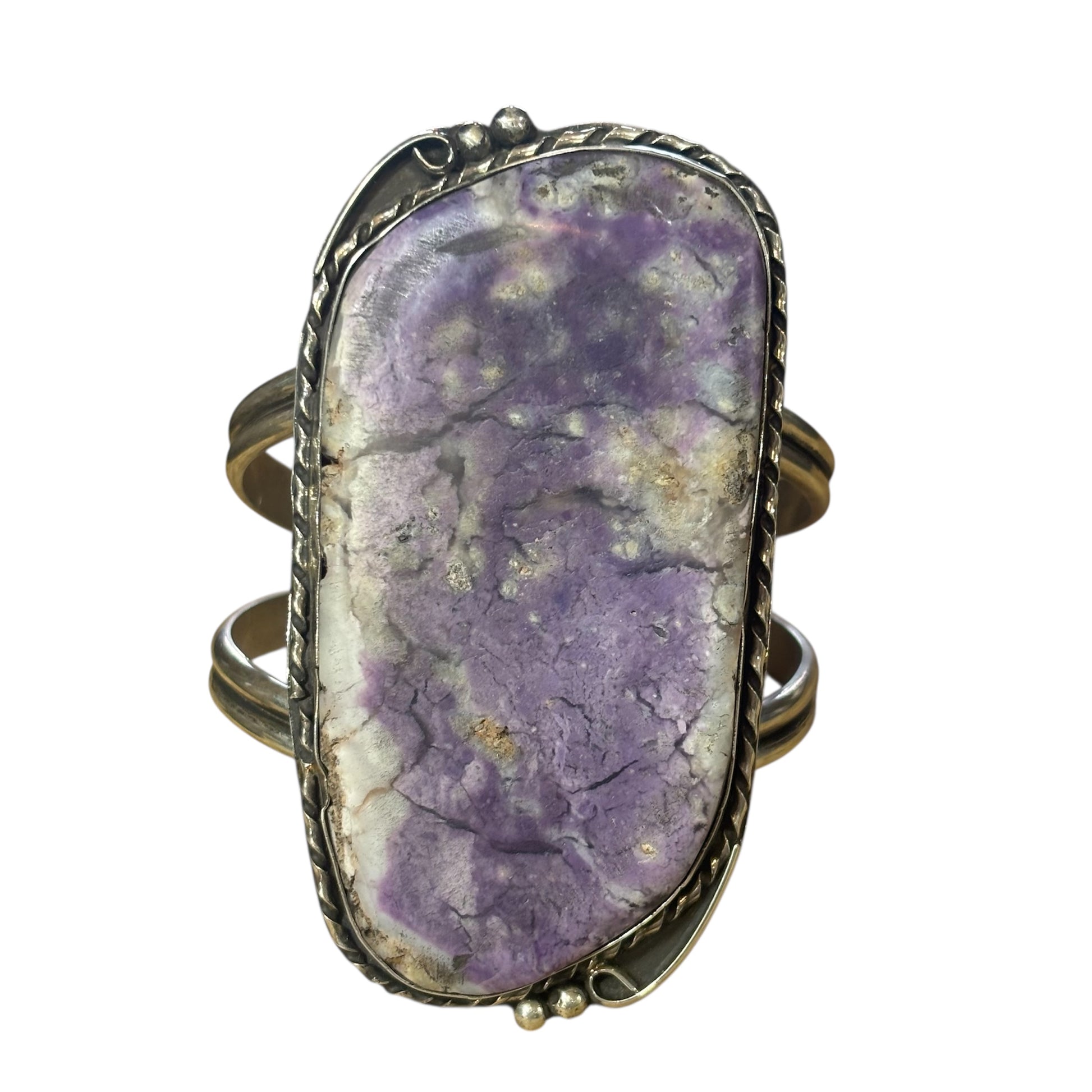 This one-of-a-kind Sugilite cuff radiates the quiet strength and serenity of the desert twilight. The massive rectangular stone displays a stunning range of purples — from soft lavender to deep amethyst — accented by natural white and gray matrix patterns that give it incredible depth and character. Set in solid sterling silver, the stone is framed by hand-twisted rope detailing and silver drops on each end, creating a perfect balance of boldness and artisan craftsmanship.