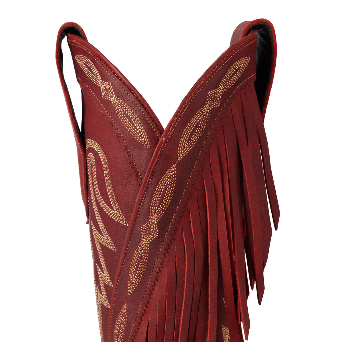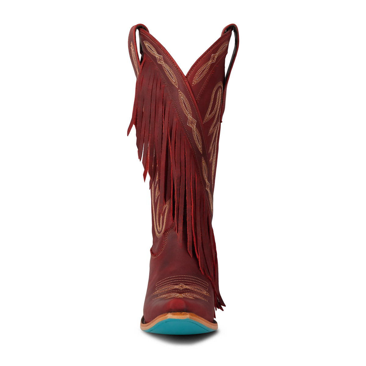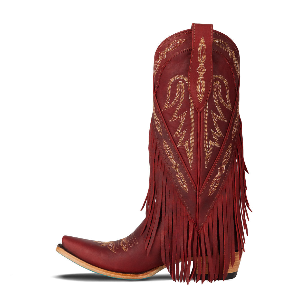 From rodeo to runway this chic boho western cowgirl boot is ready for wherever the night takes you. A modern play on traditional flame stitch & asymmetrical fringe detailing. She's a must have in your closet.