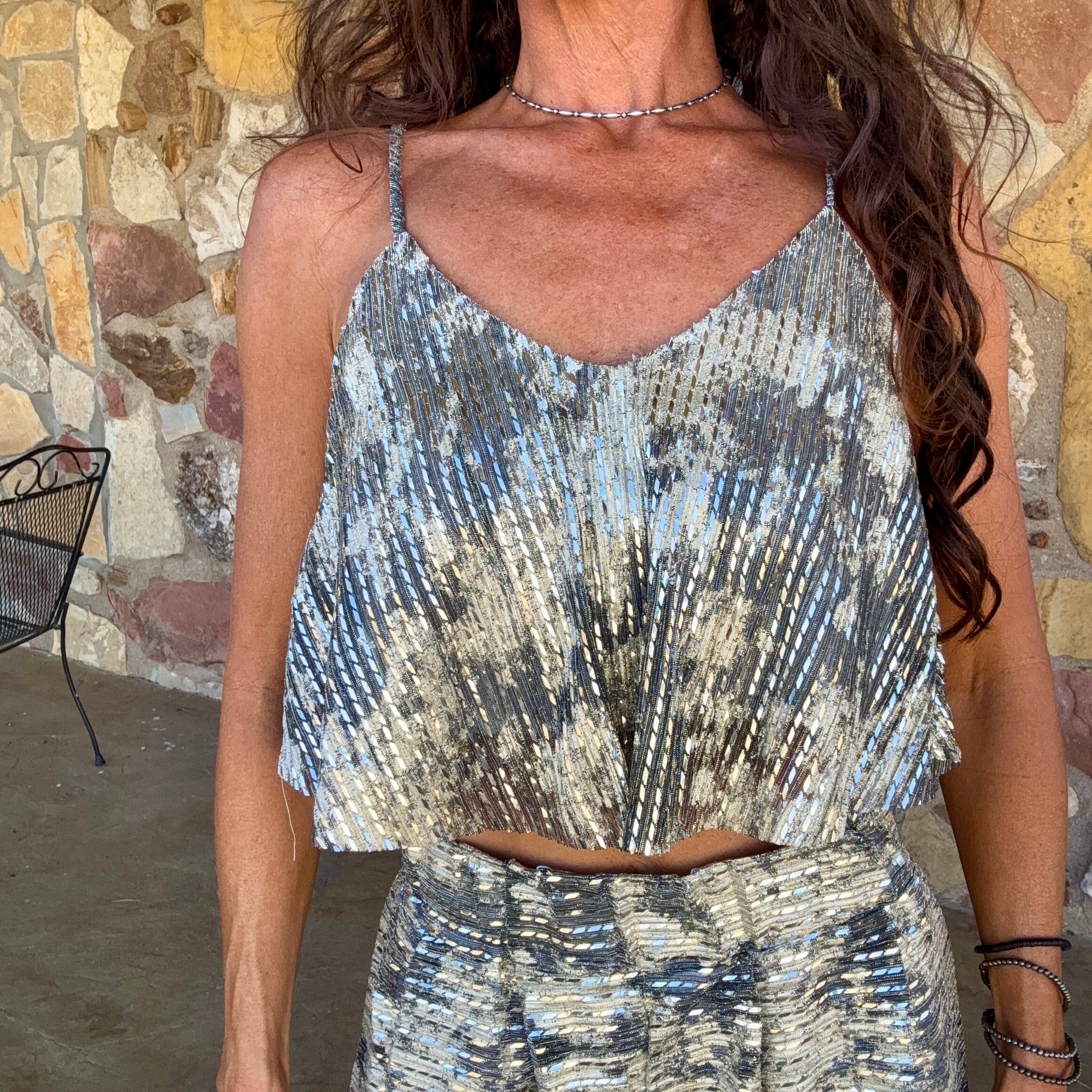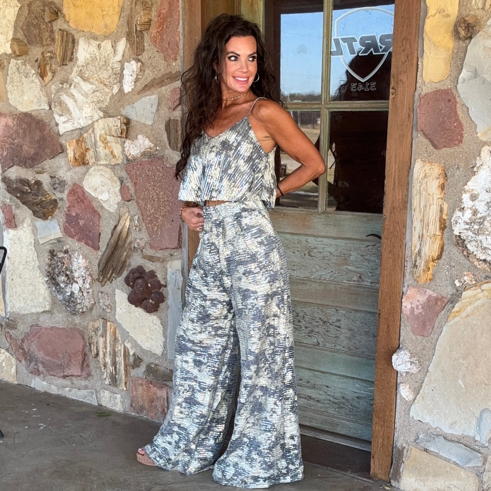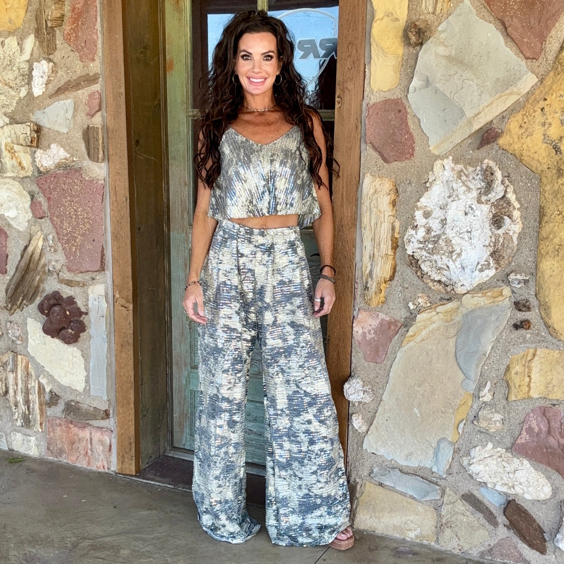 Make an entrance in this silver shimmer set that blends easy comfort with bold western elegance. The cropped cami top features a relaxed drape with spaghetti straps, while the high-waisted wide-leg pants move effortlessly with every step. The metallic finish catches the light just right, giving this set a modern cowgirl glow that’s perfect for nights out, market weekends, or rodeo events under the stars.