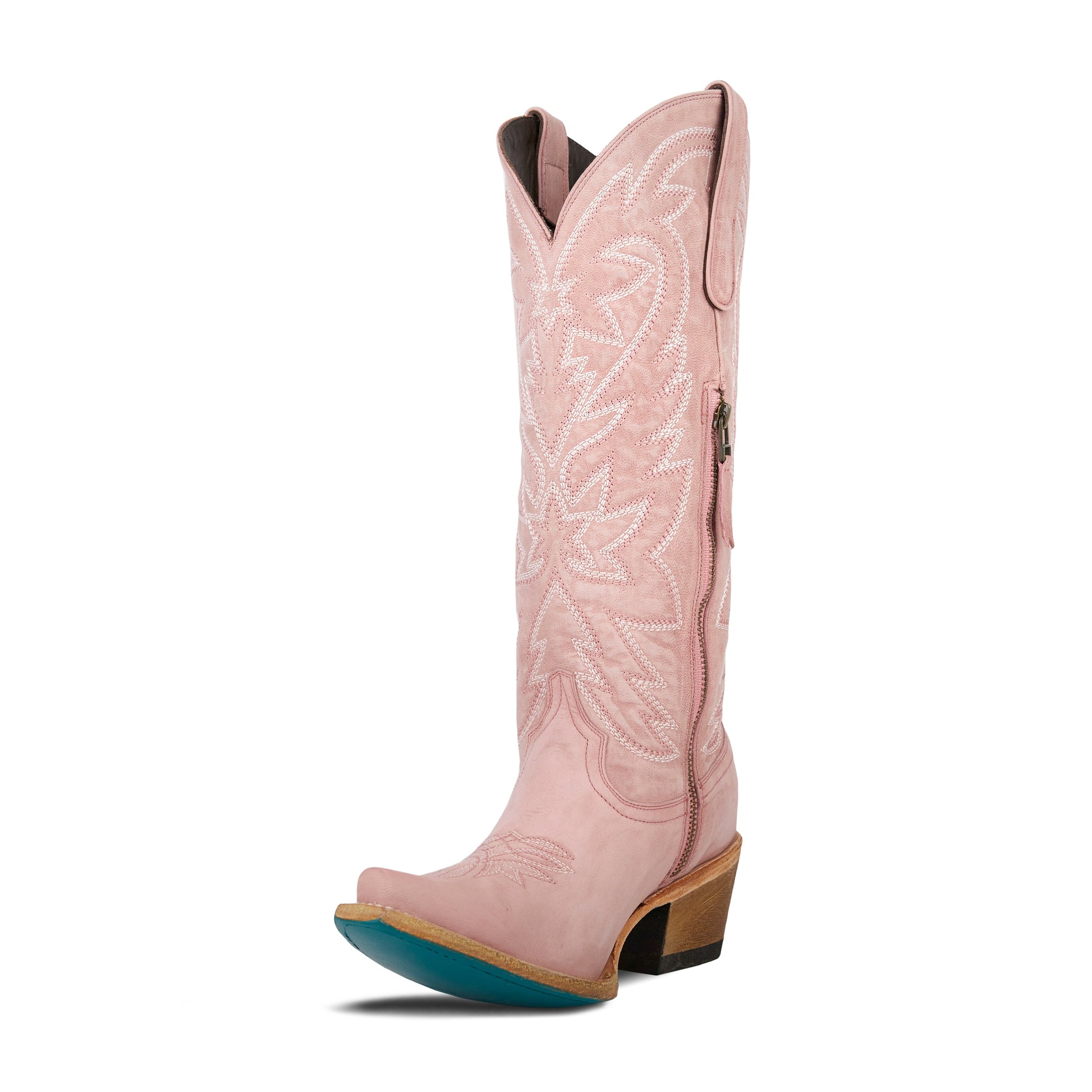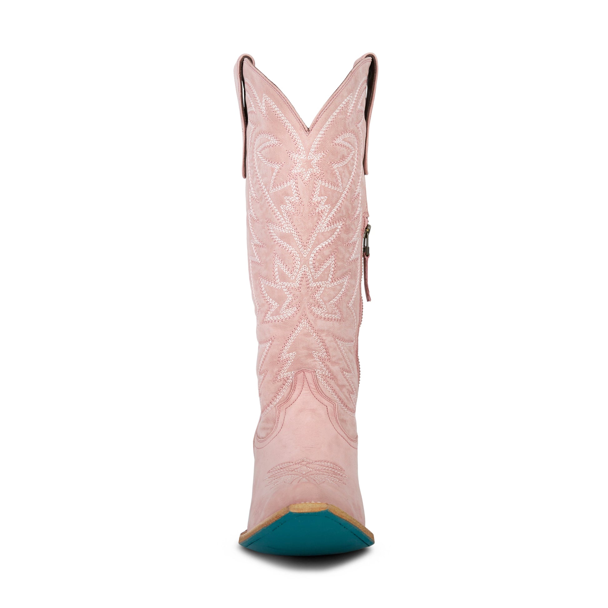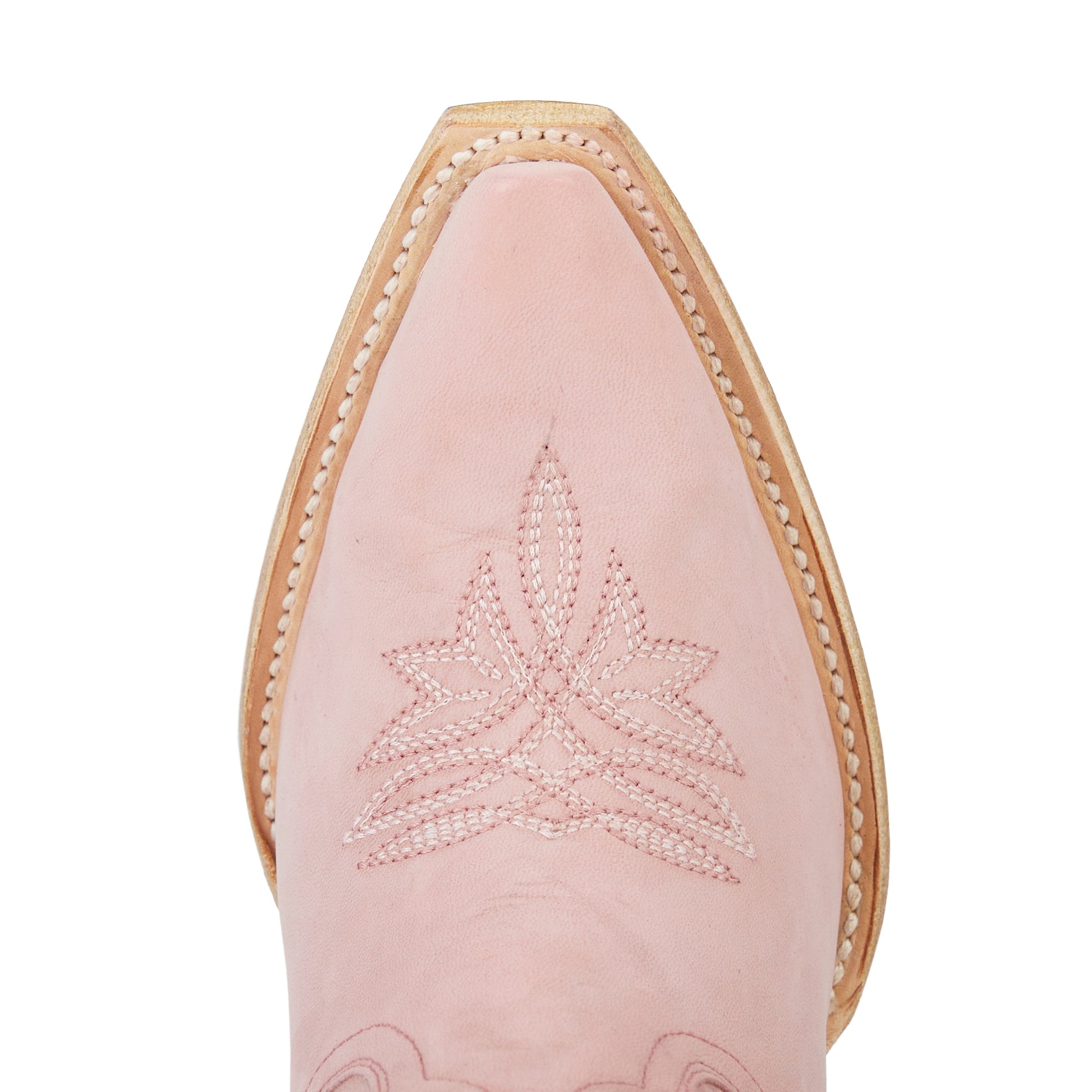 This classic snip toe is accompanied by an abstract cosmic starburst pattern and retro inspired toe stitch. Level up your wardrobe with this blue bottom hottie. She's the perfect chic, cowgirl boot right off the runway.
