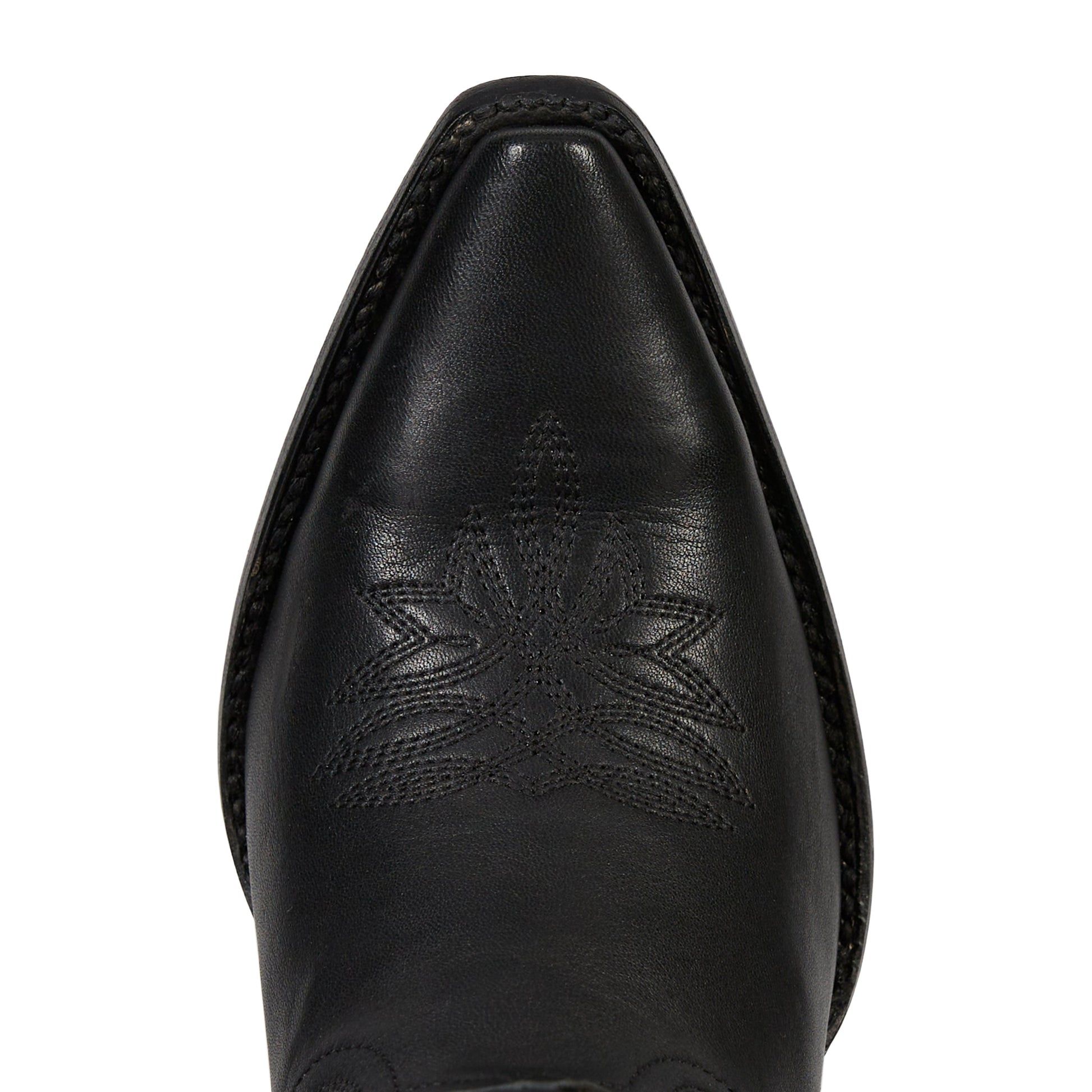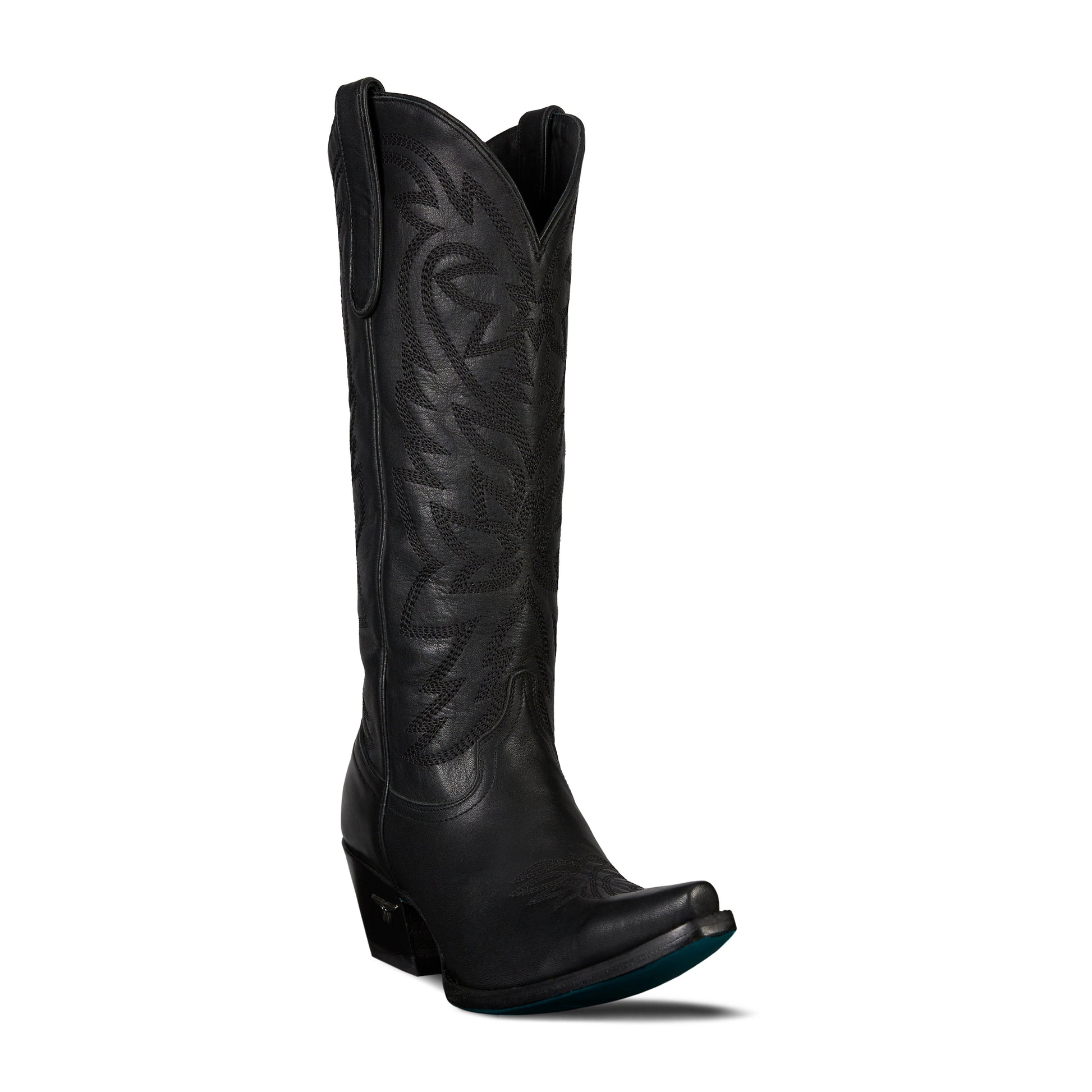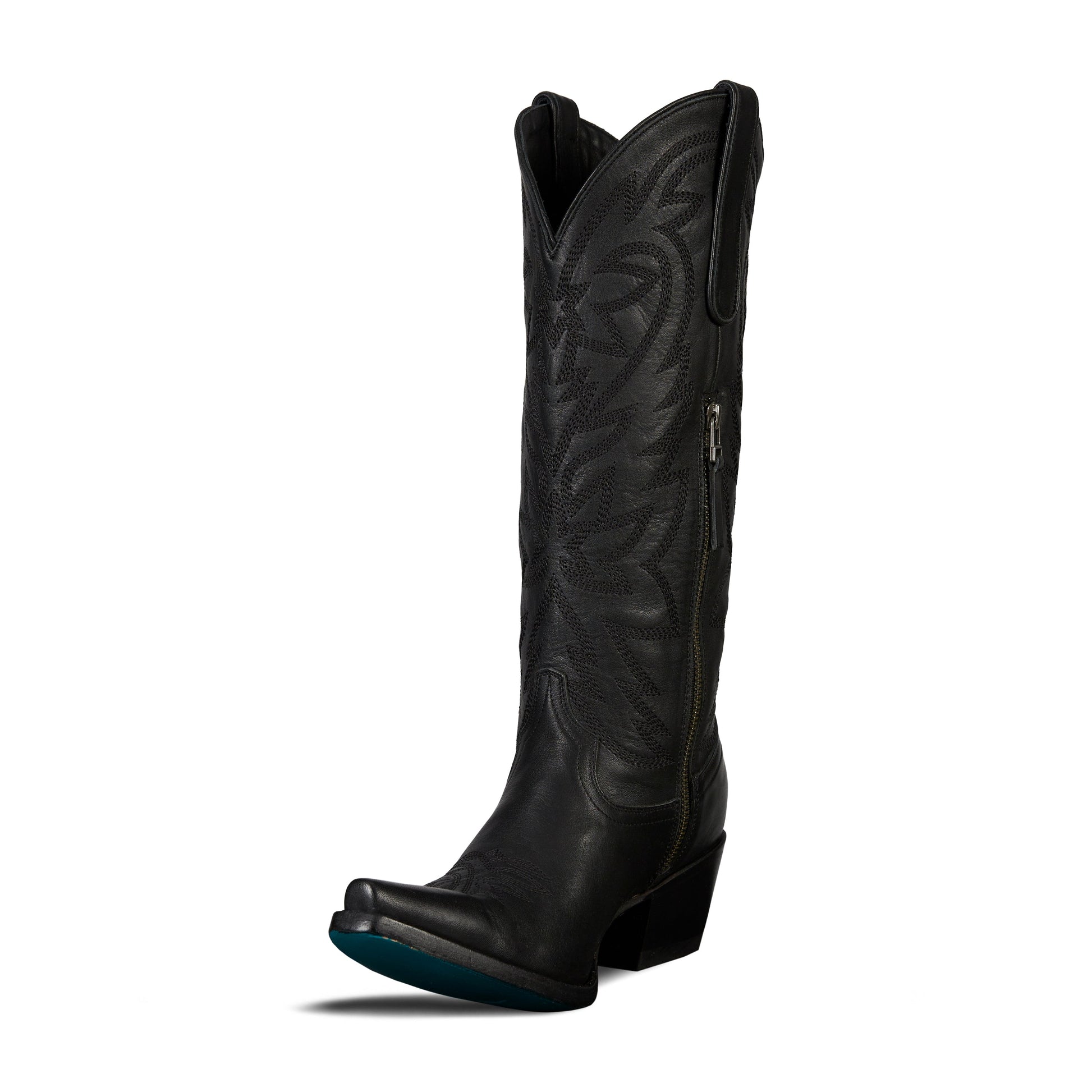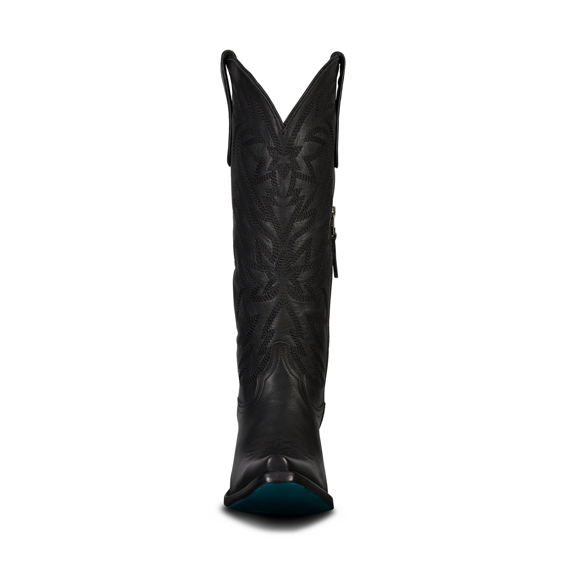 She's a timeless renegade. A jet-black cowgirl boot right off the runway. This classic snip toe is accompanied by an abstract cosmic starburst pattern and retro-inspired toe stitch. Level up your wardrobe and pair this blue-bottom hottie with your favorite little black dress.