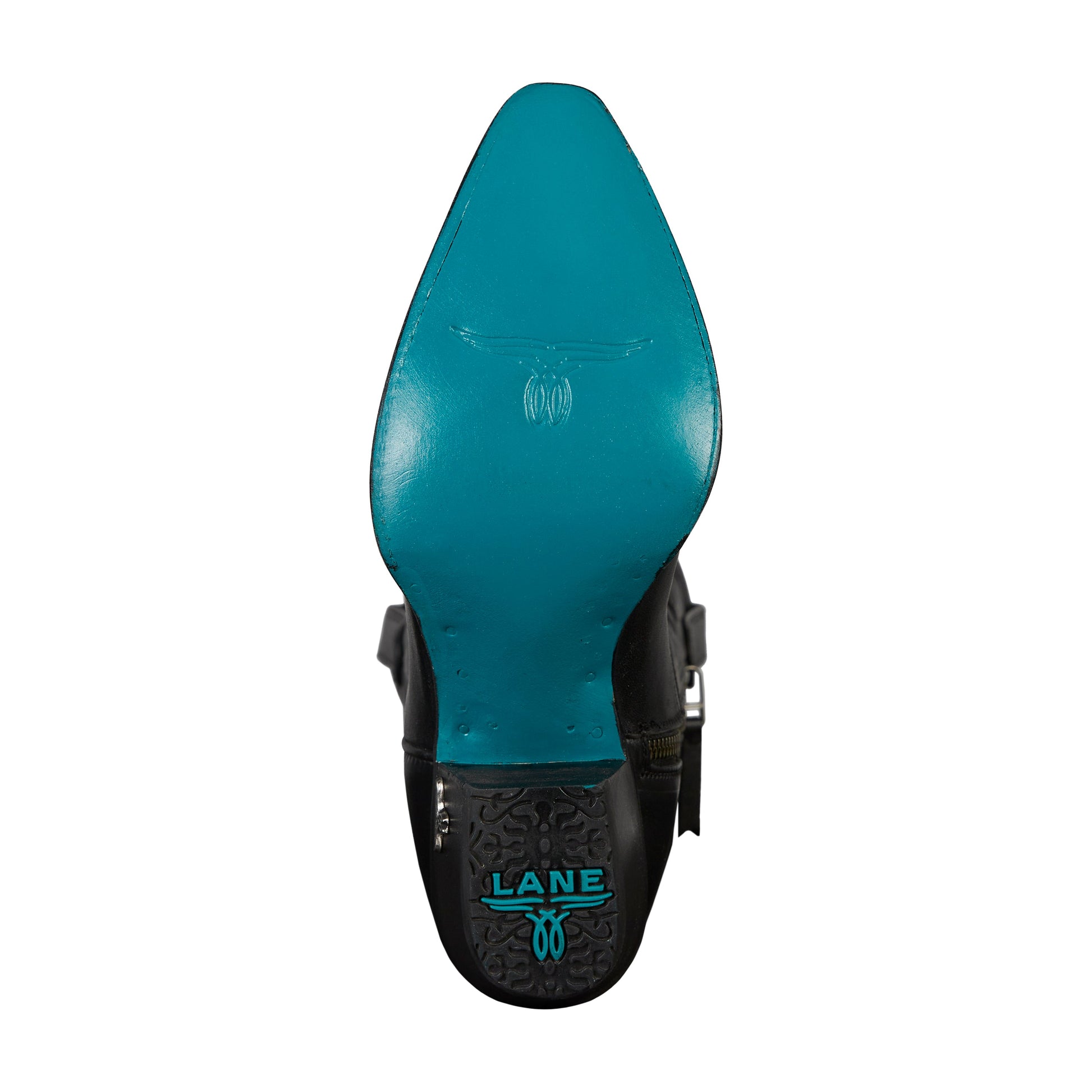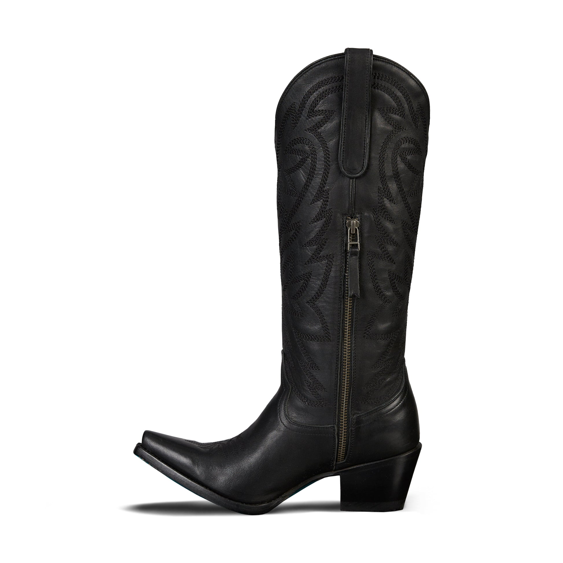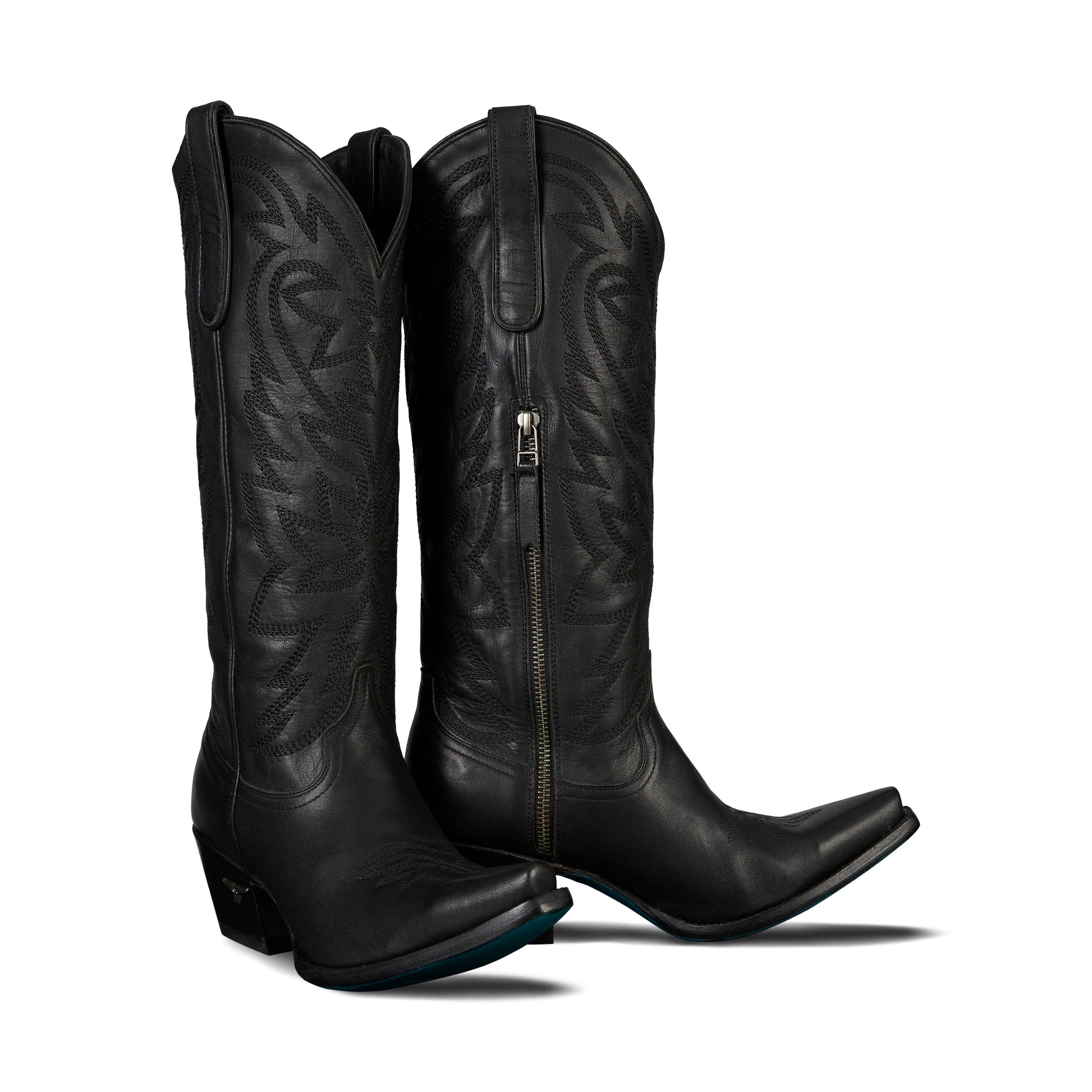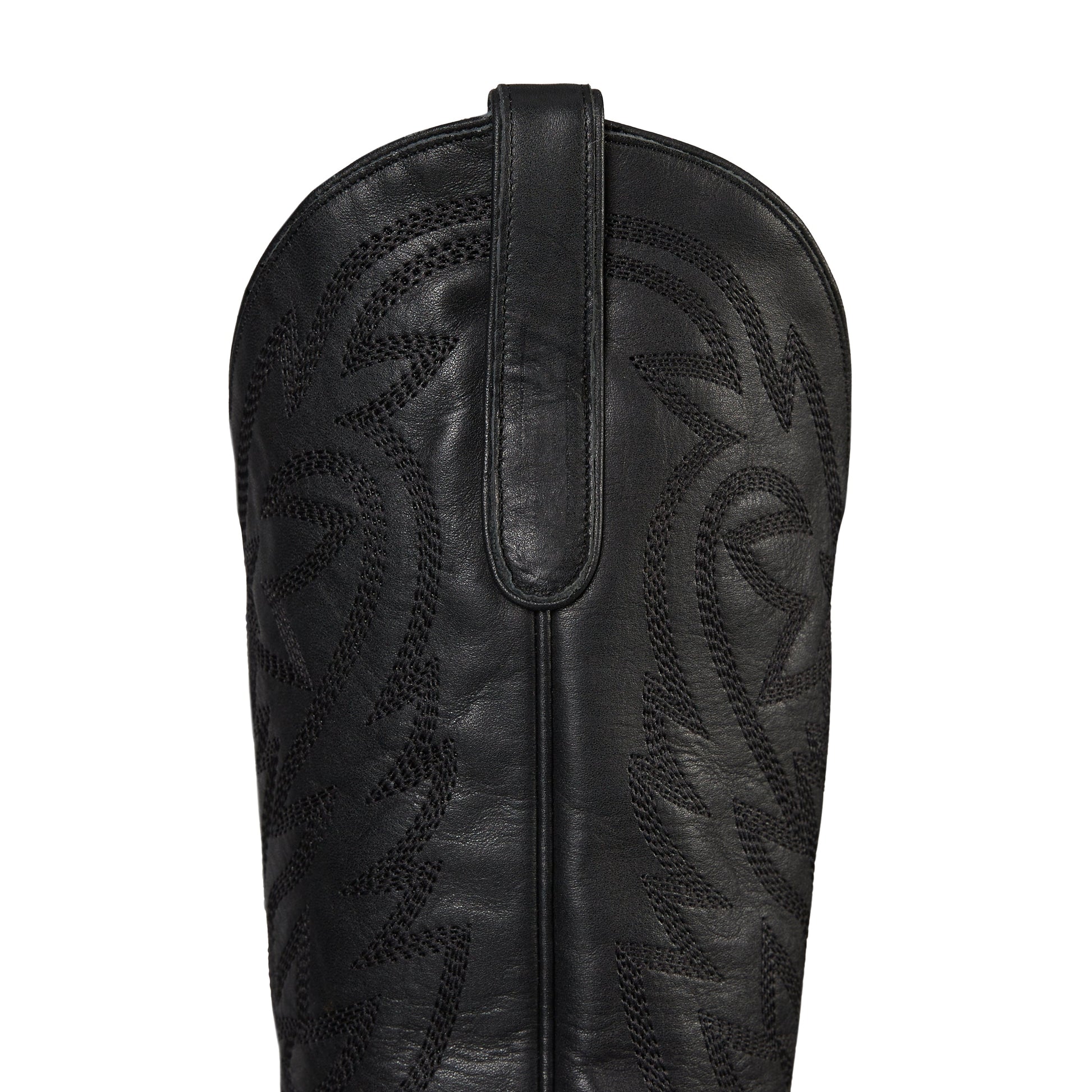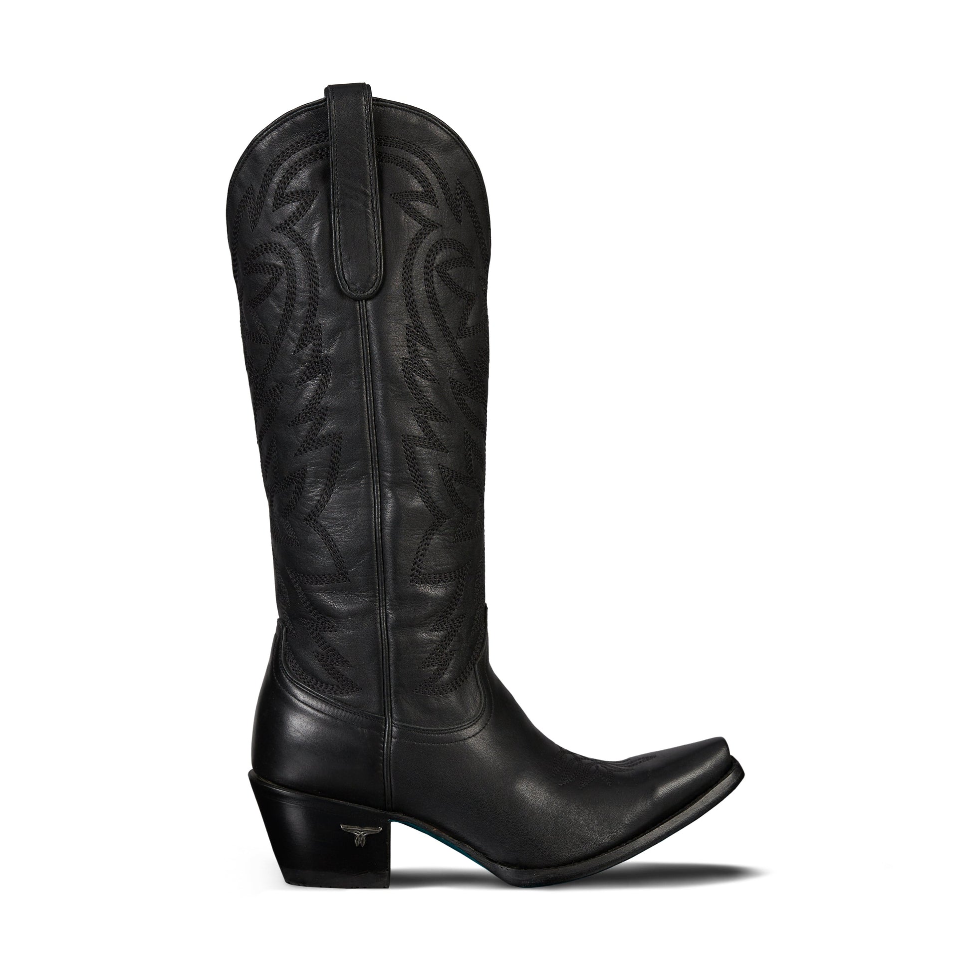 She's a timeless renegade. A jet-black cowgirl boot right off the runway. This classic snip toe is accompanied by an abstract cosmic starburst pattern and retro-inspired toe stitch. Level up your wardrobe and pair this blue-bottom hottie with your favorite little black dress.