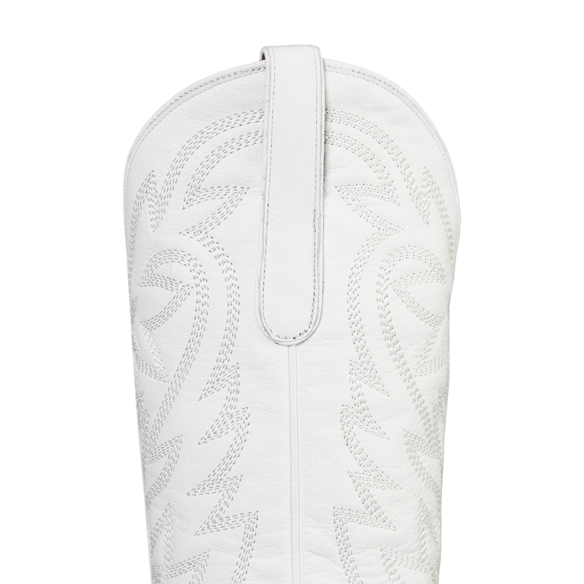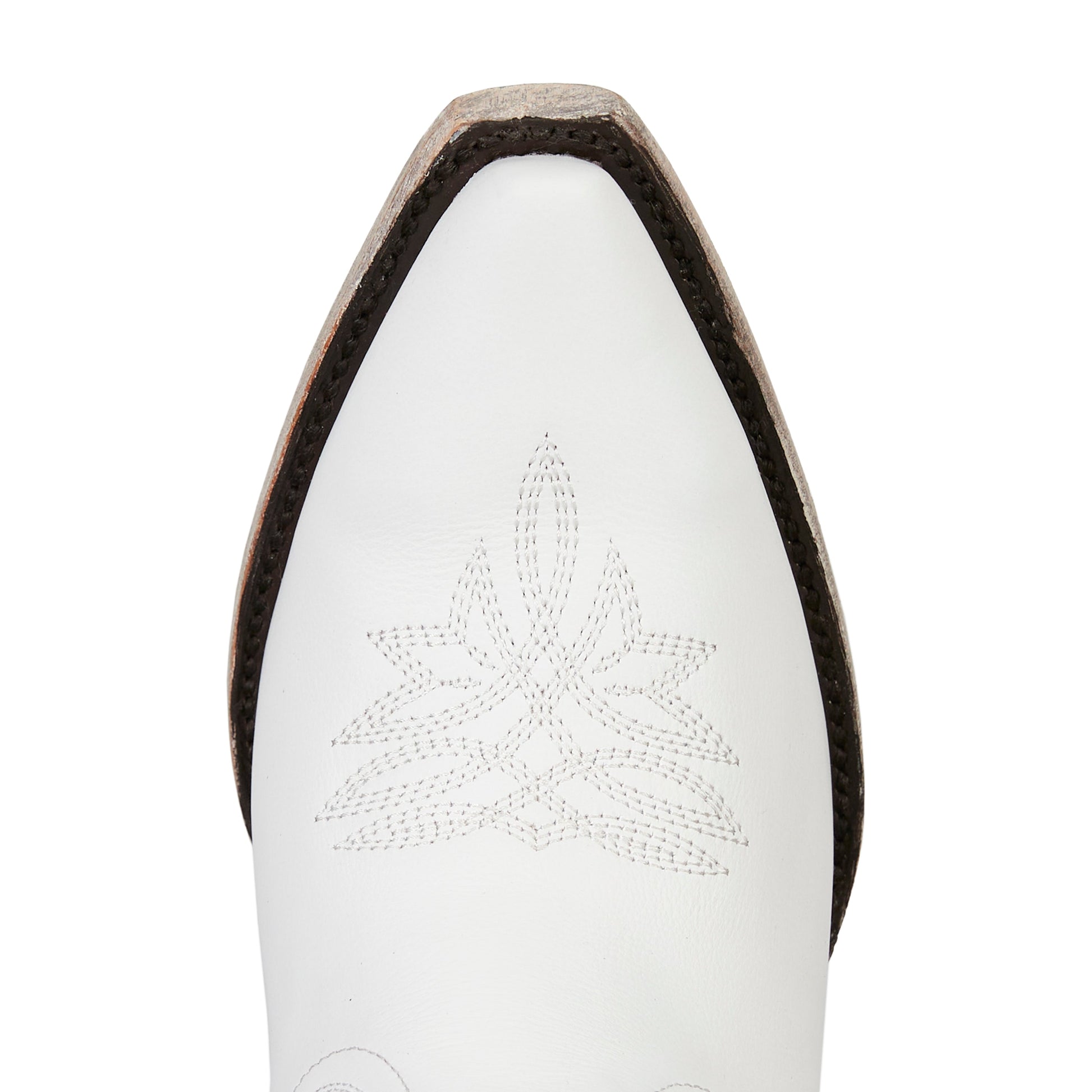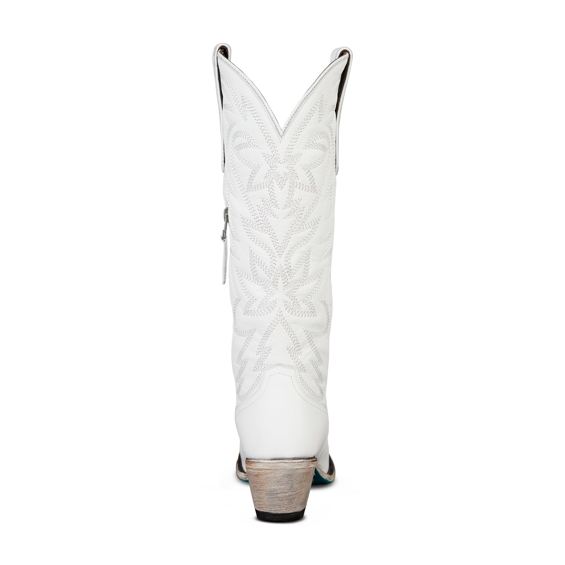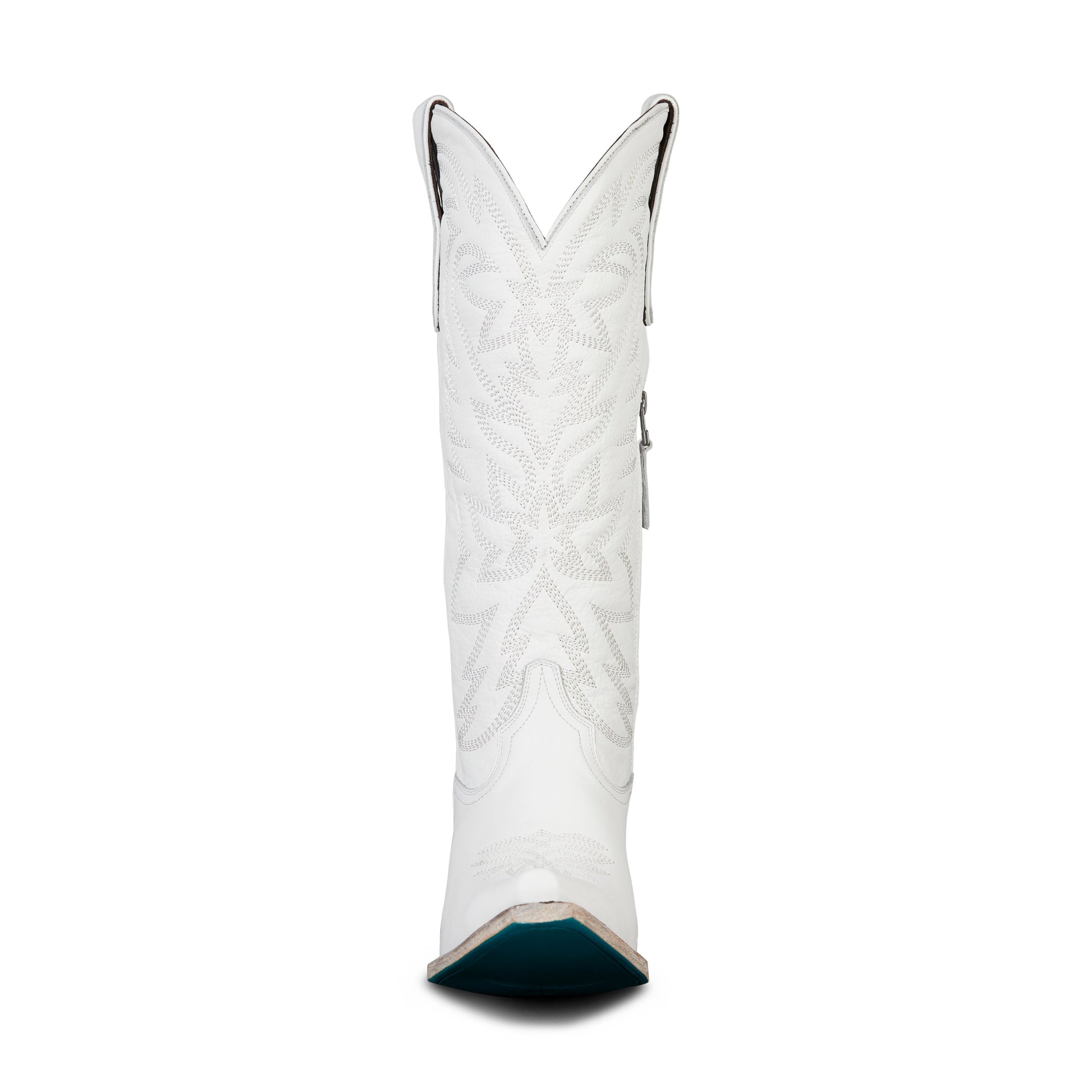 She's the perfect chic, white cowgirl boots right off the runway. This classic snip toe is accompanied by an abstract cosmic starburst pattern and retro-inspired toe stitch. Level up your wardrobe with this blue bottom hottie.