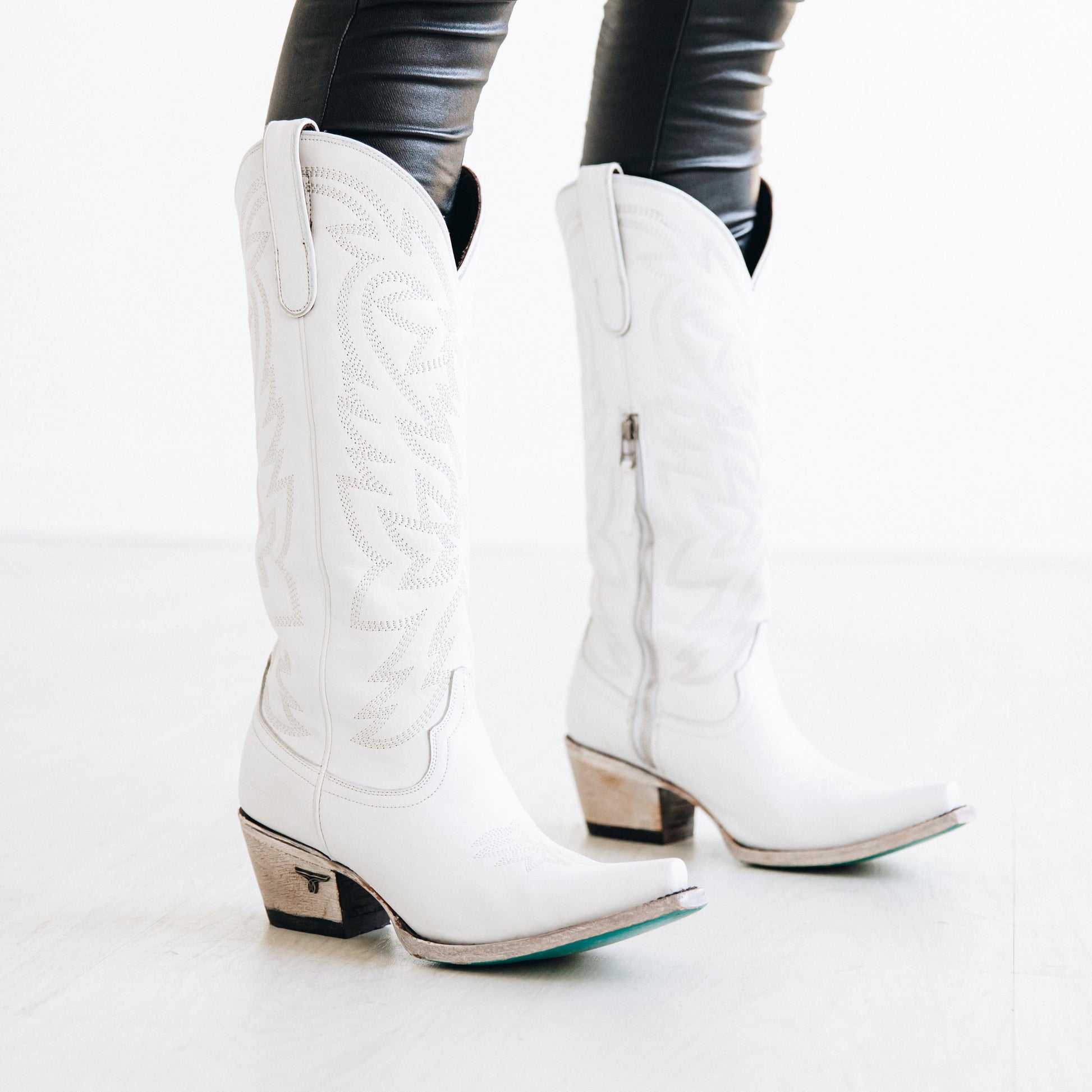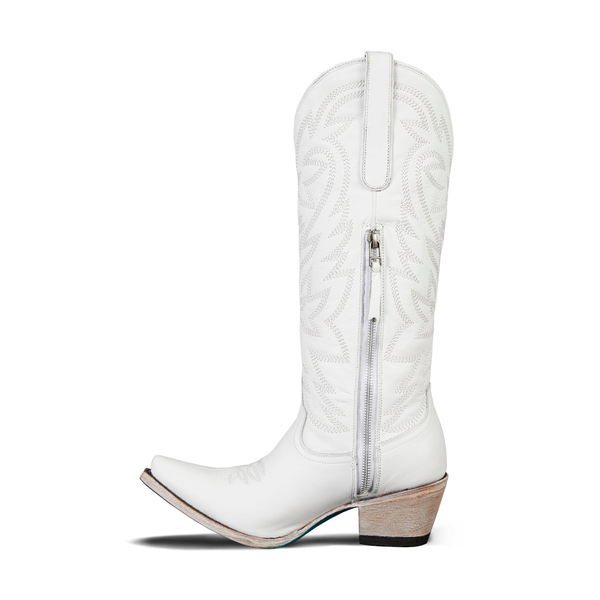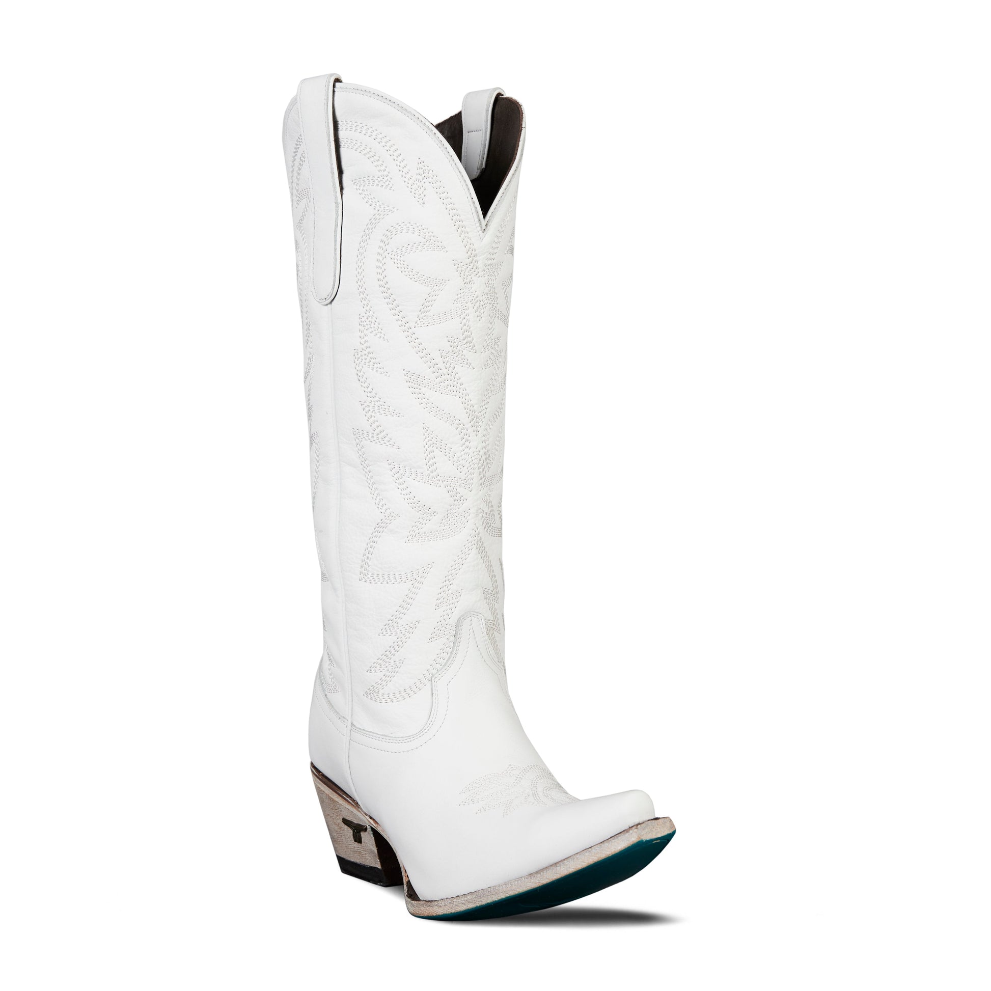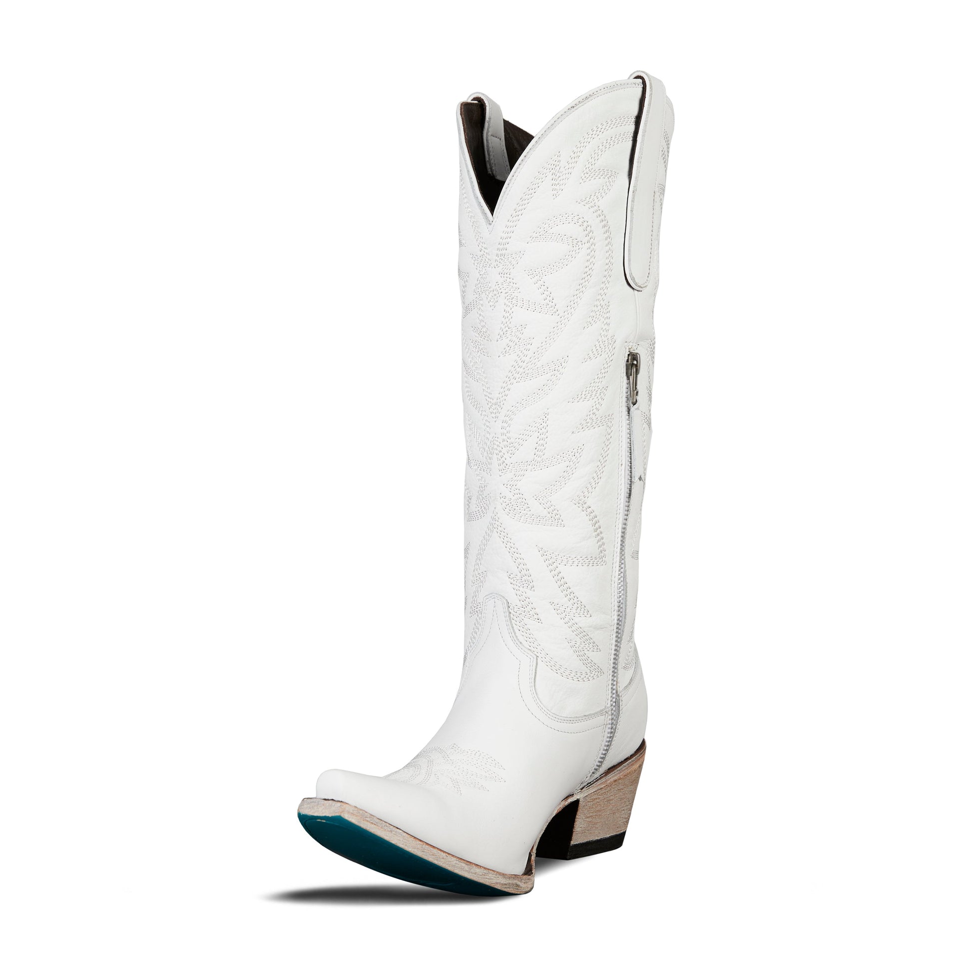 She's the perfect chic, white cowgirl boots right off the runway. This classic snip toe is accompanied by an abstract cosmic starburst pattern and retro-inspired toe stitch. Level up your wardrobe with this blue bottom hottie.