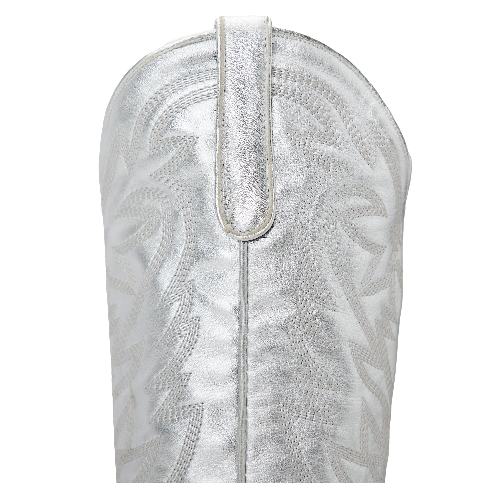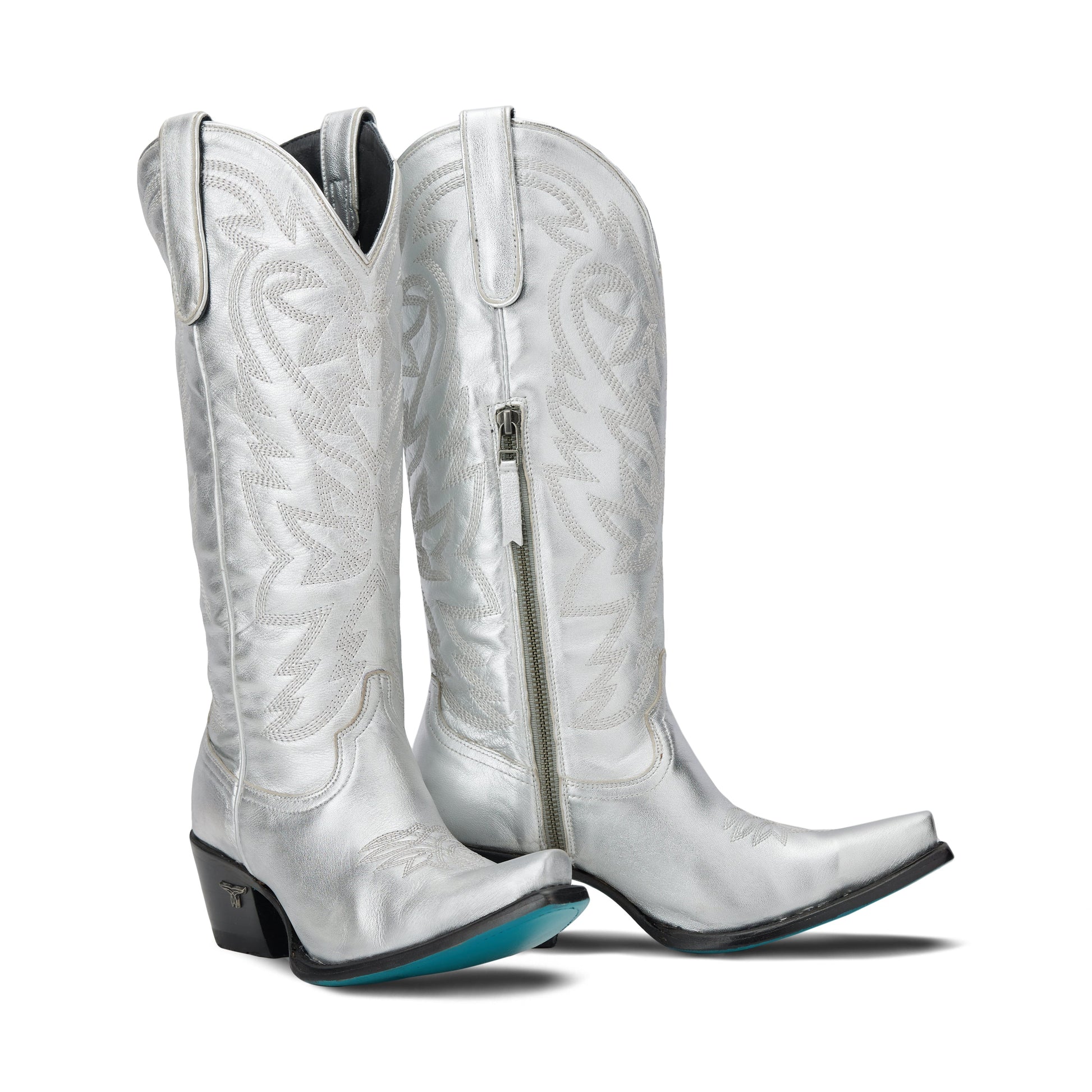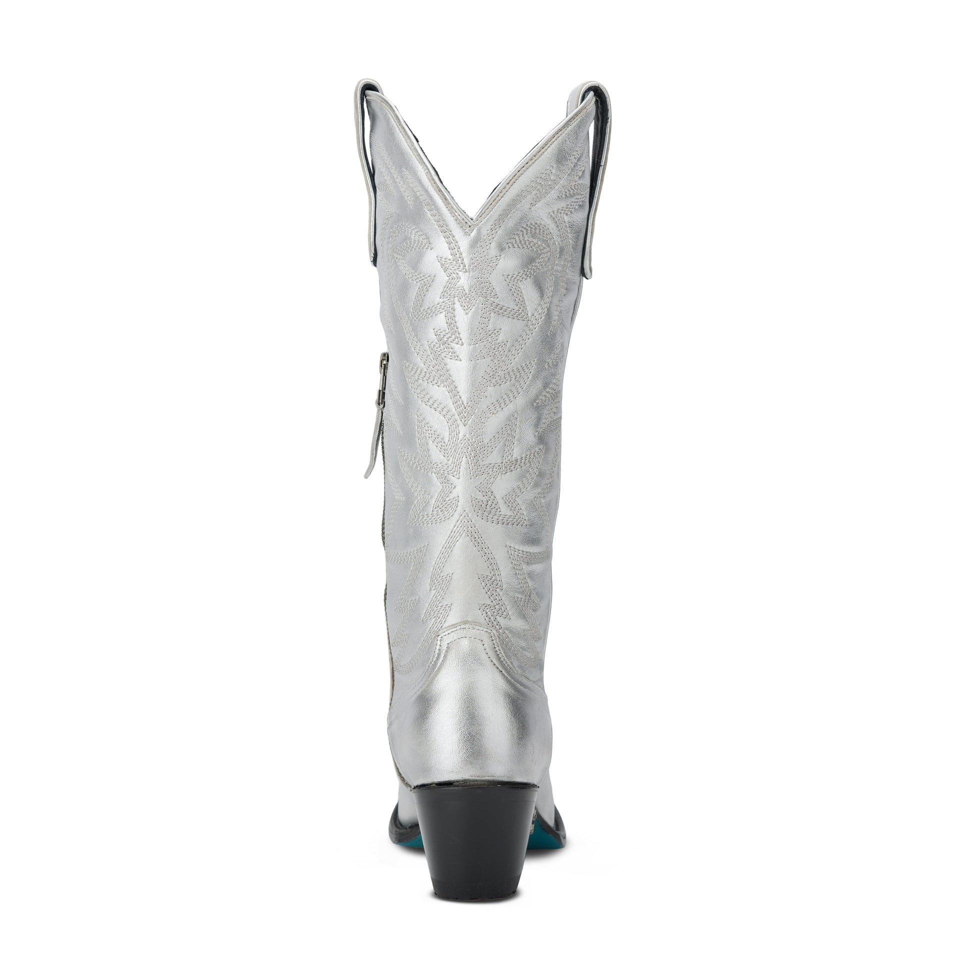 She's the perfect chic, metallic silver cowgirl boots right off the runway.