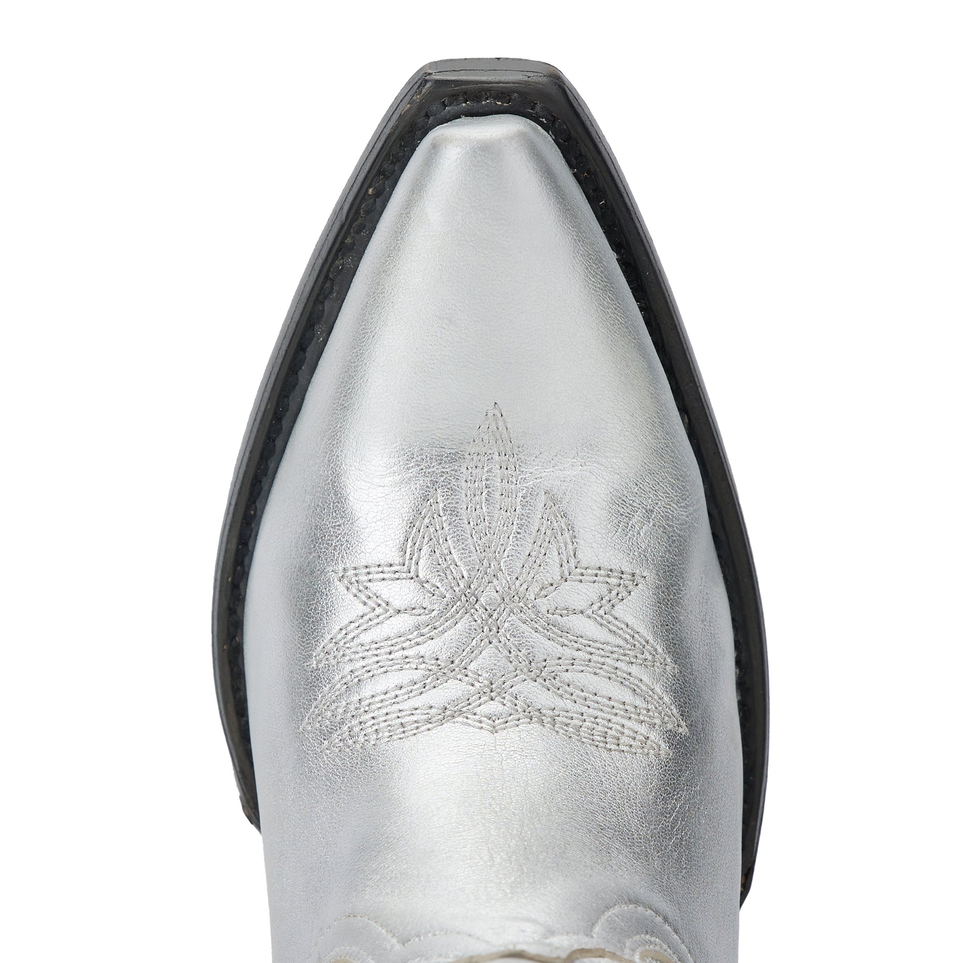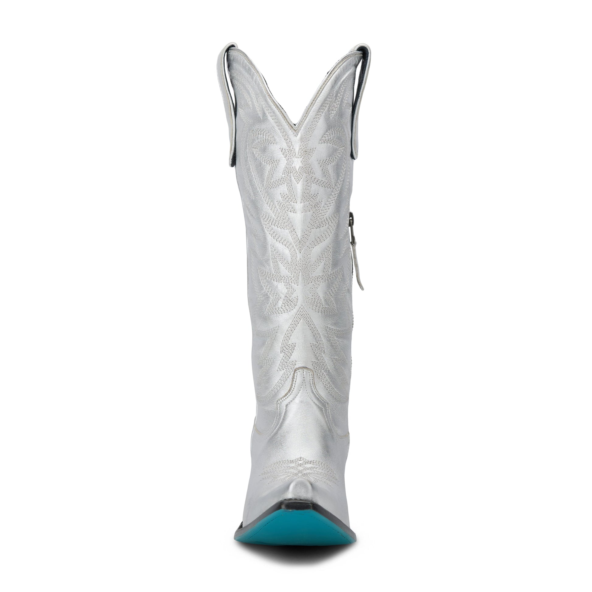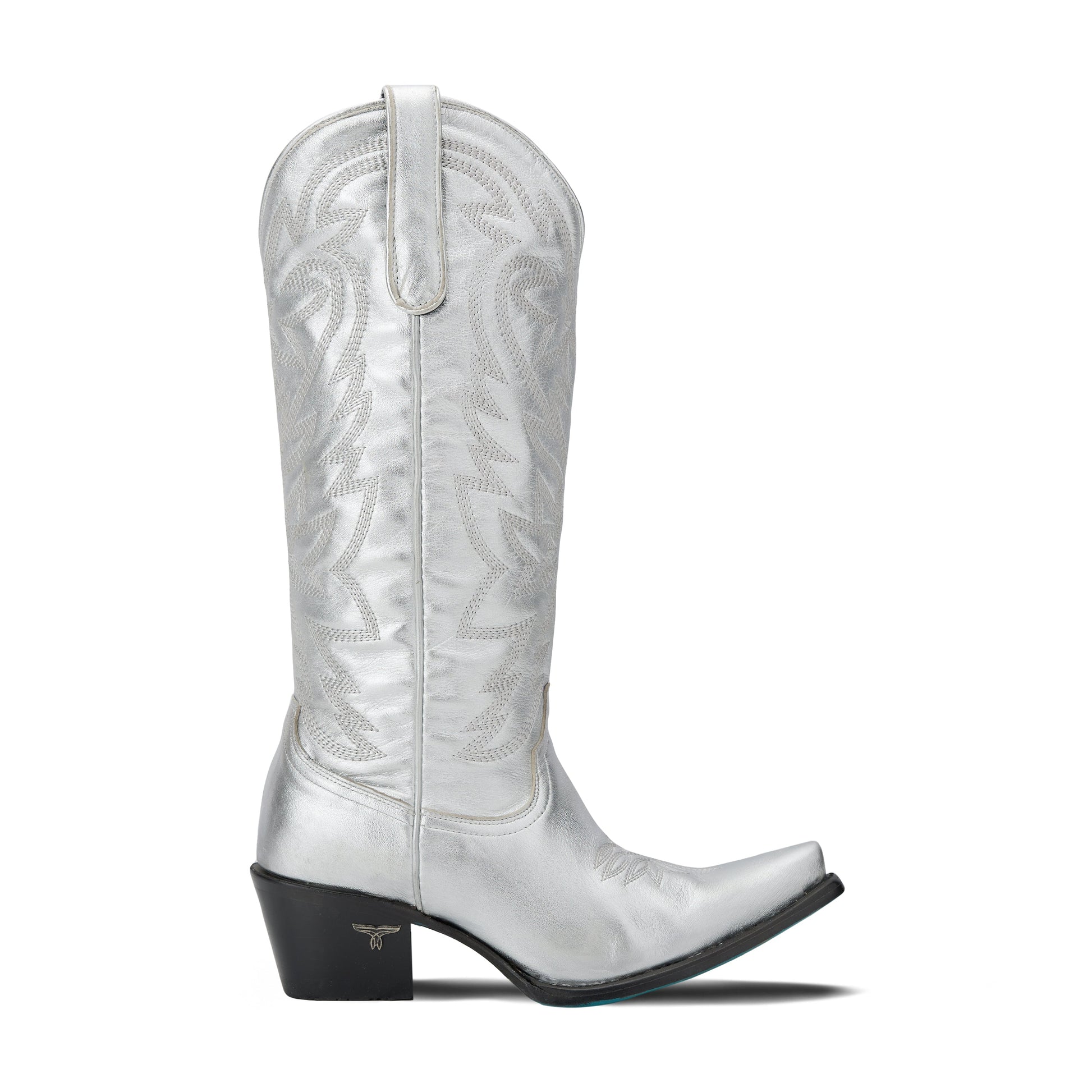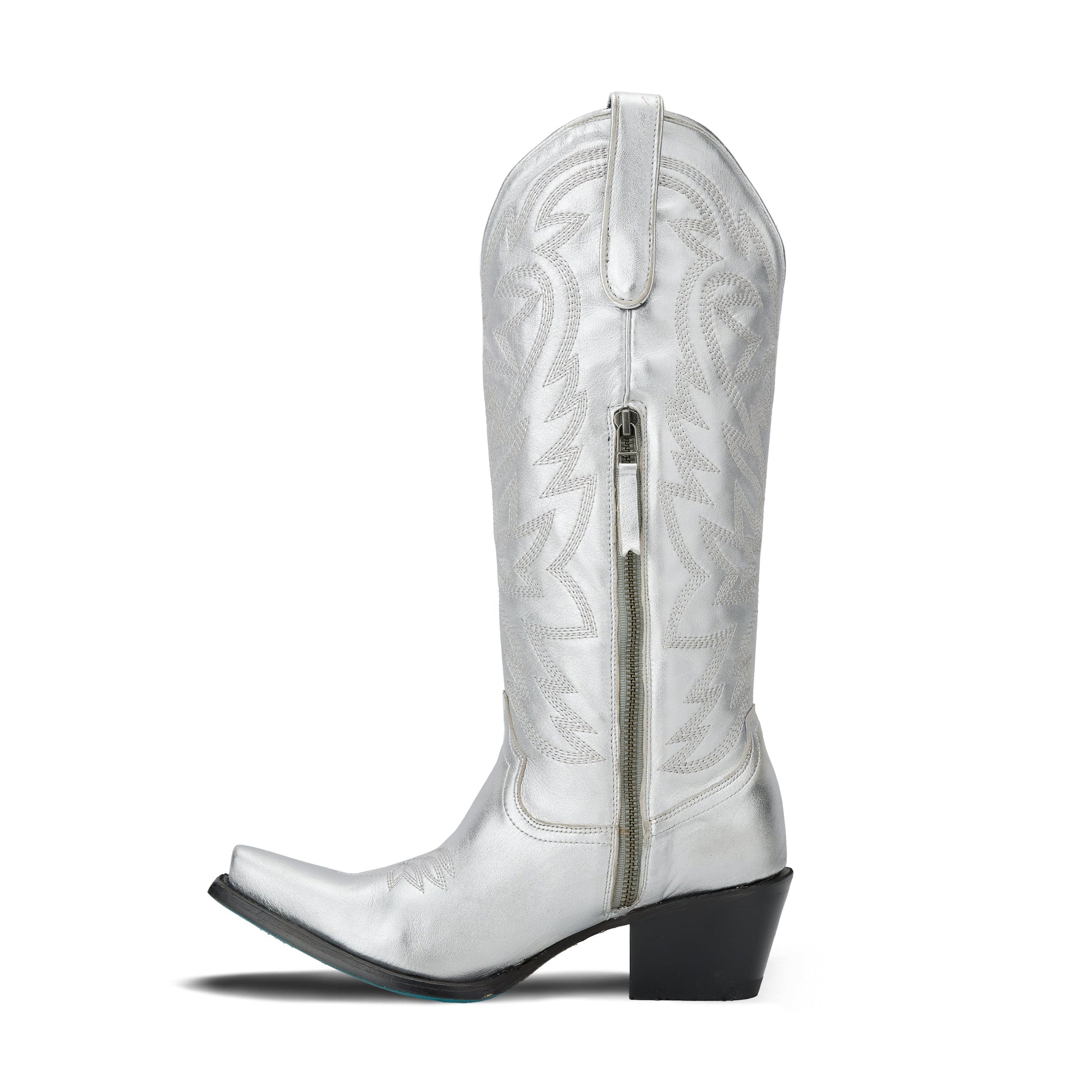 She's the perfect chic, metallic silver cowgirl boots right off the runway.