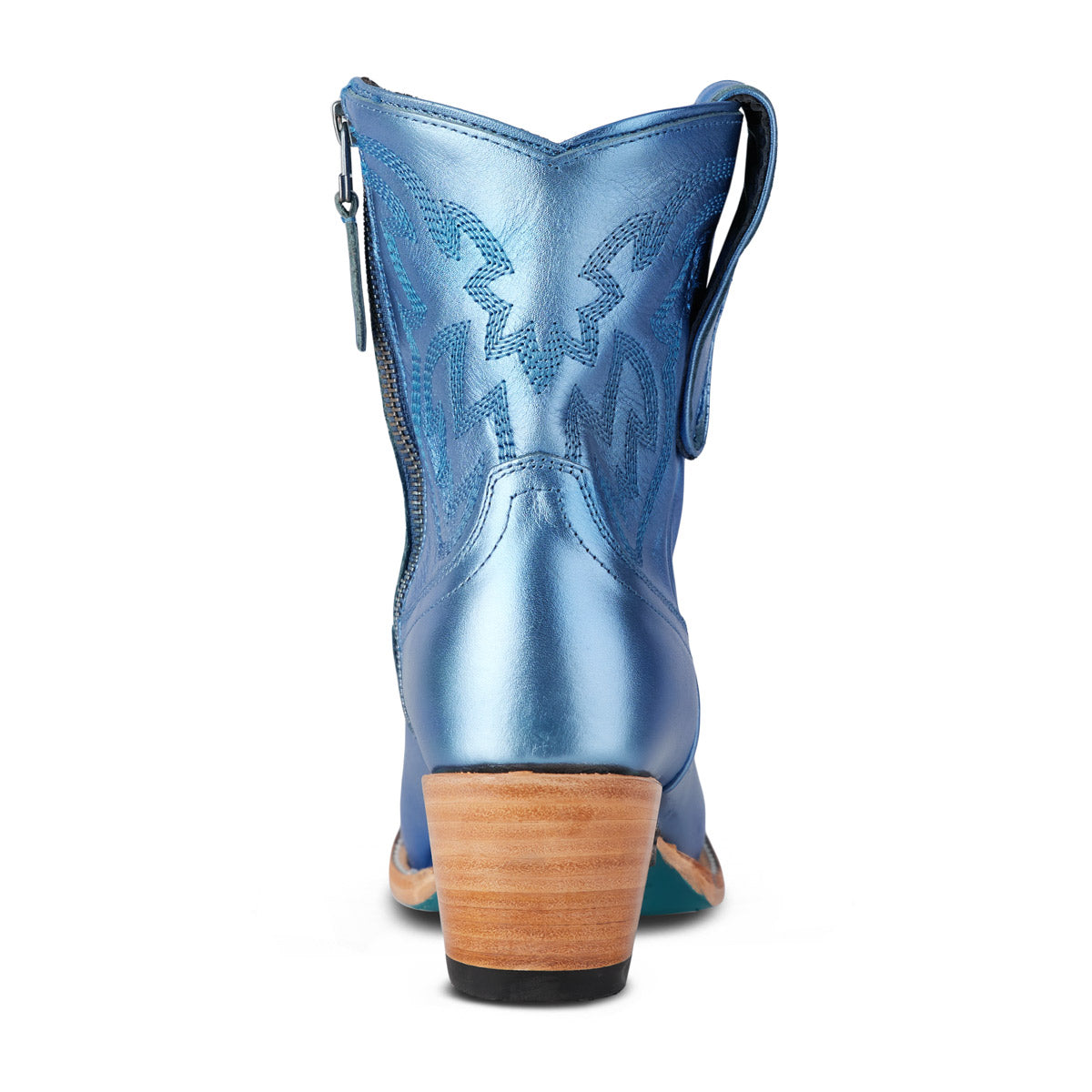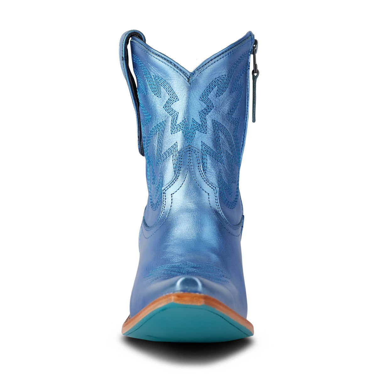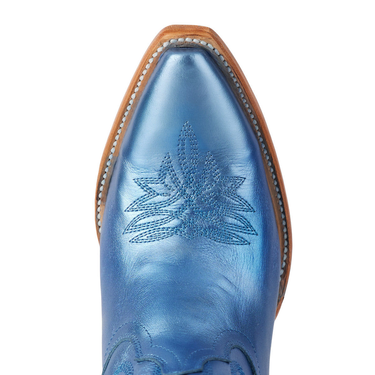 She's the same timeless renegade. A striking cobalt metallic cowgirl bootie right off the runway. This classic snip toe is accompanied by an abstract cosmic starburst pattern and retro inspired toe stitch. Level up your wardrobe and style this blue bottom hottie for a girls-night-out or concert outfit.