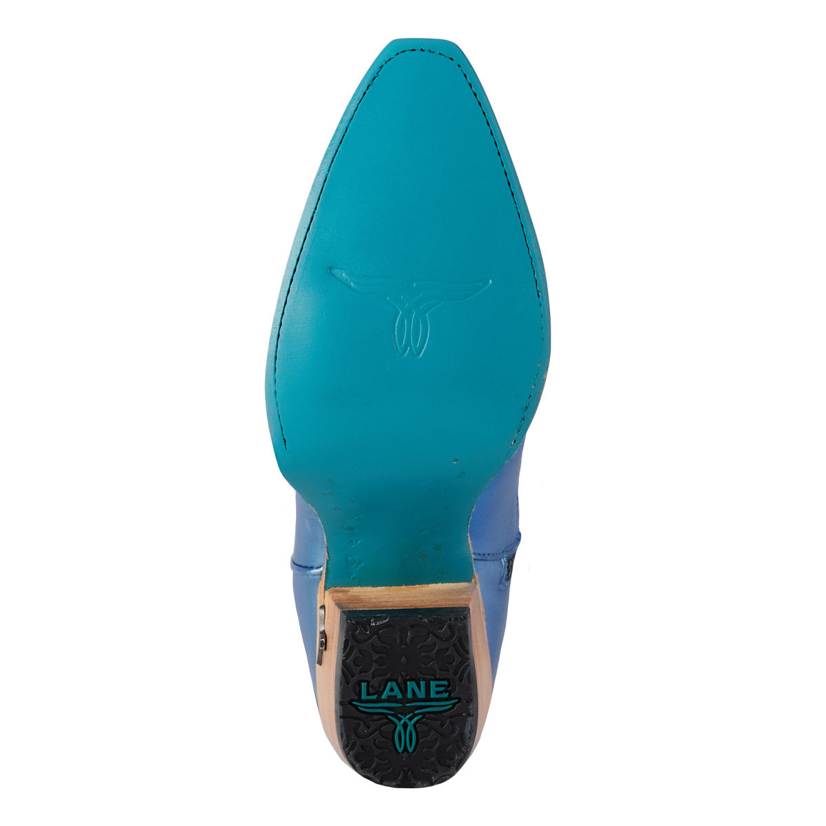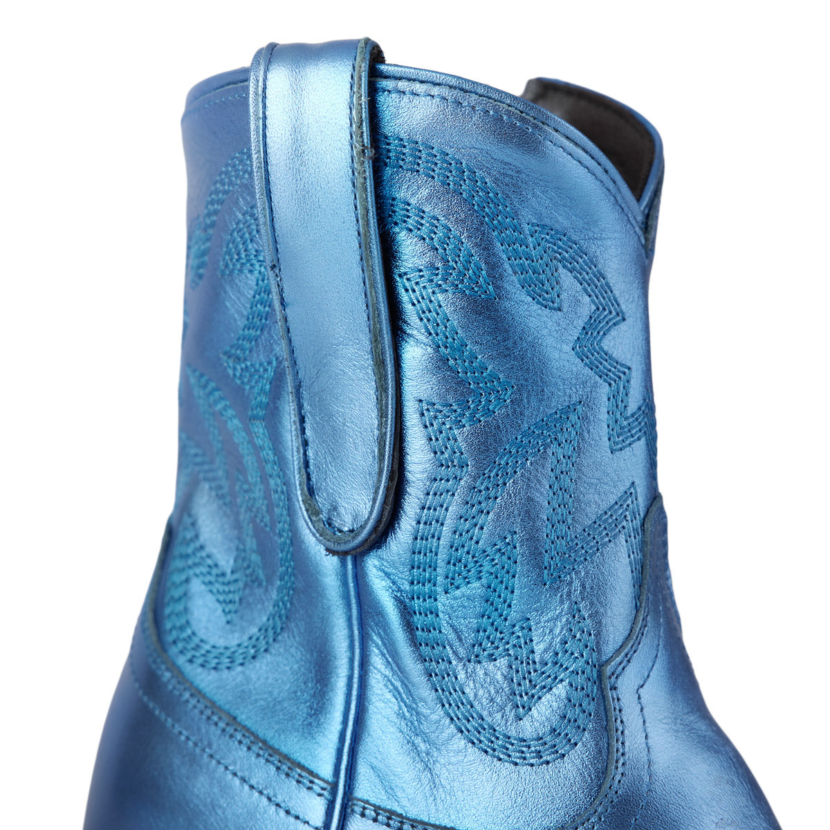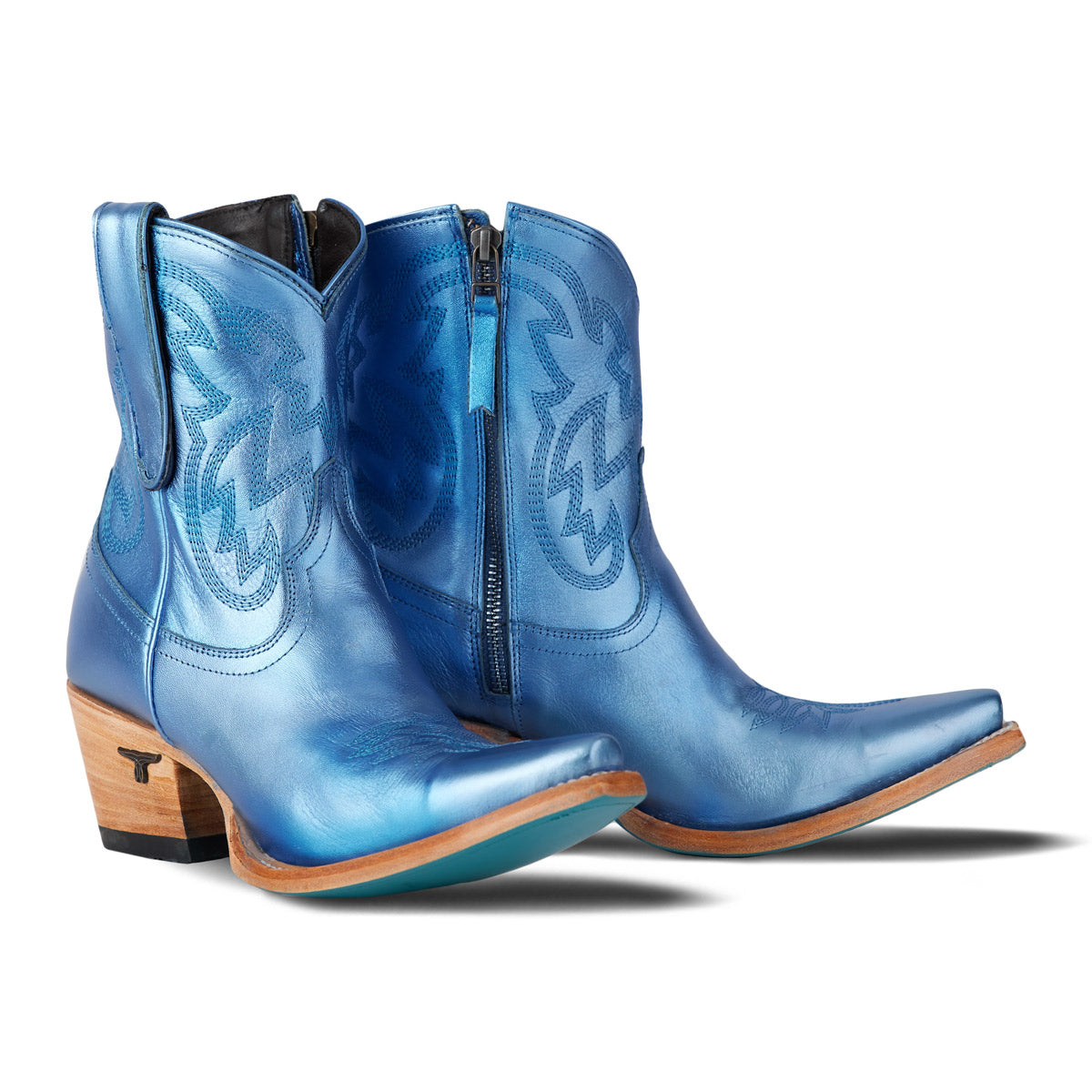 She's the same timeless renegade. A striking cobalt metallic cowgirl bootie right off the runway. This classic snip toe is accompanied by an abstract cosmic starburst pattern and retro inspired toe stitch. Level up your wardrobe and style this blue bottom hottie for a girls-night-out or concert outfit.