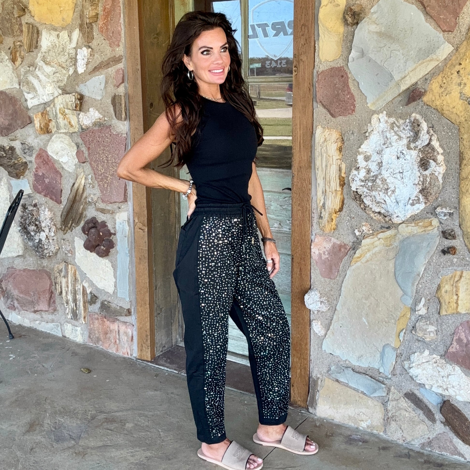Bring a touch of sparkle to your off-duty western look with these black drawstring joggers. Covered in tiny metallic specks that shimmer like desert stars, they’re the perfect blend of comfort and style. The relaxed fit and soft stretch fabric make them ideal for rodeo travel days, cozy nights in, or casual errands with a little flair.