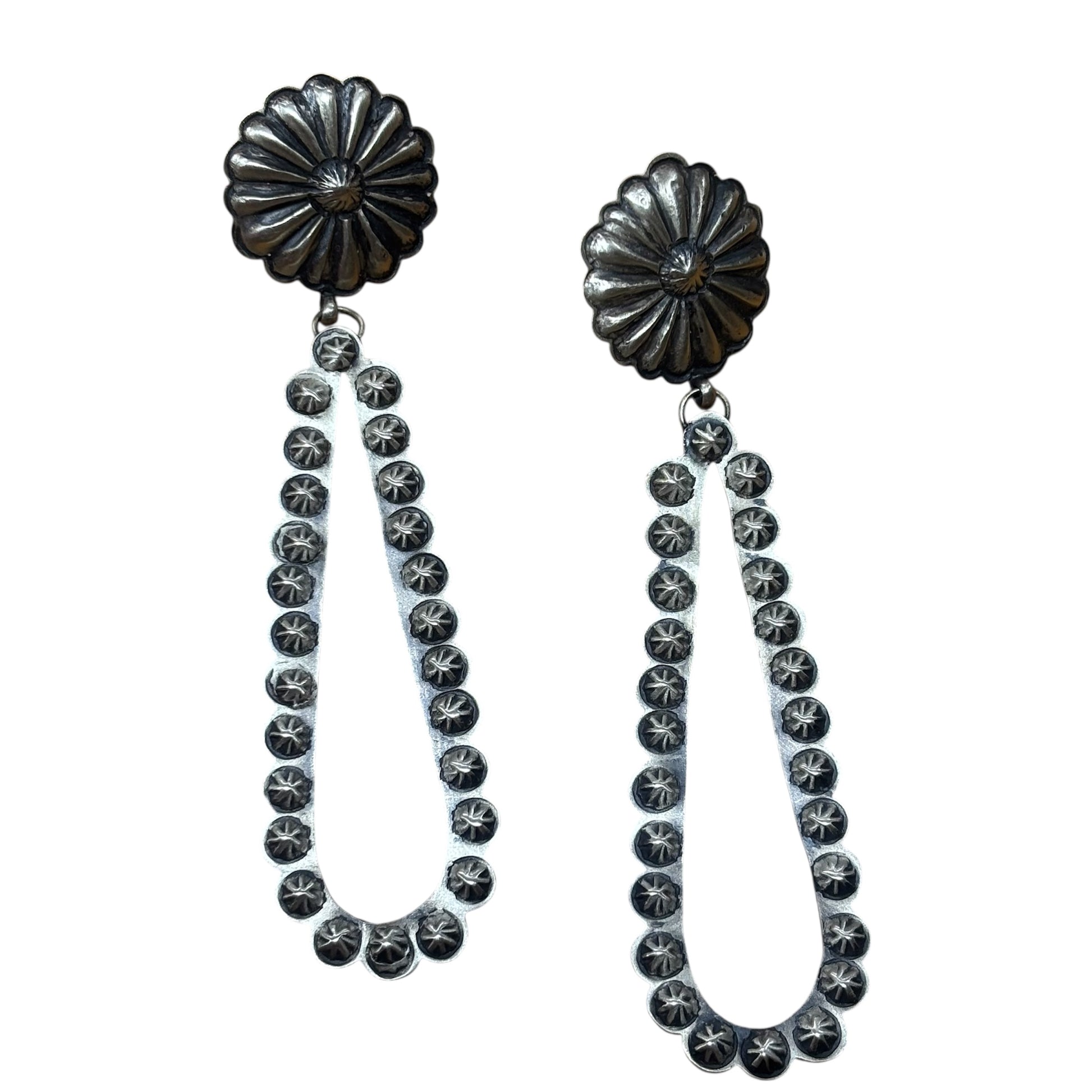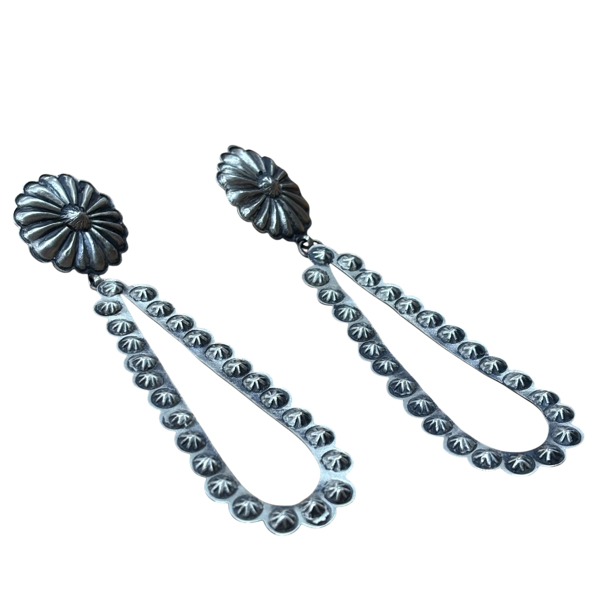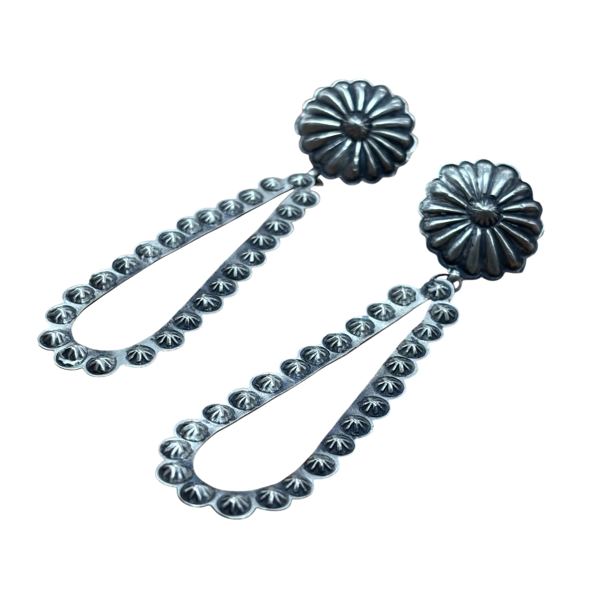 Add a bold Western flair to your look with these handcrafted stamped sterling silver drop hoop earrings. Featuring a striking scalloped concho stud and an elongated teardrop-shaped hoop of individually hand-stamped silver discs, these earrings are a true testament to traditional Southwestern silversmithing.