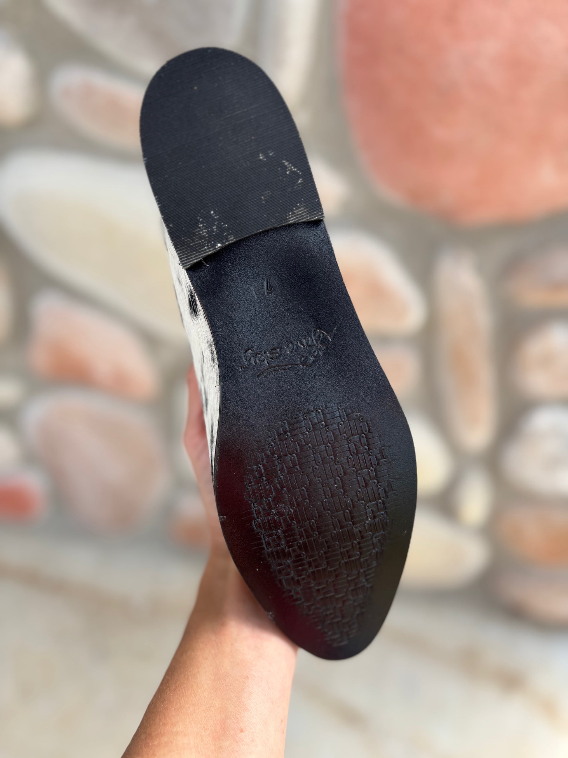 Designed for both comfort and durability, they feature a leather sole for a refined feel and a rubber bottom heel for traction and support. Each pair is handmade and one-of-a-kind, showcasing the distinct markings of natural cowhide—no two are ever the same.