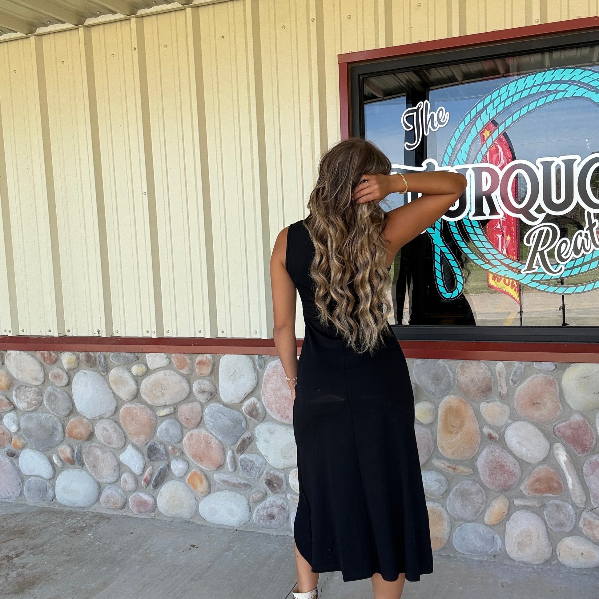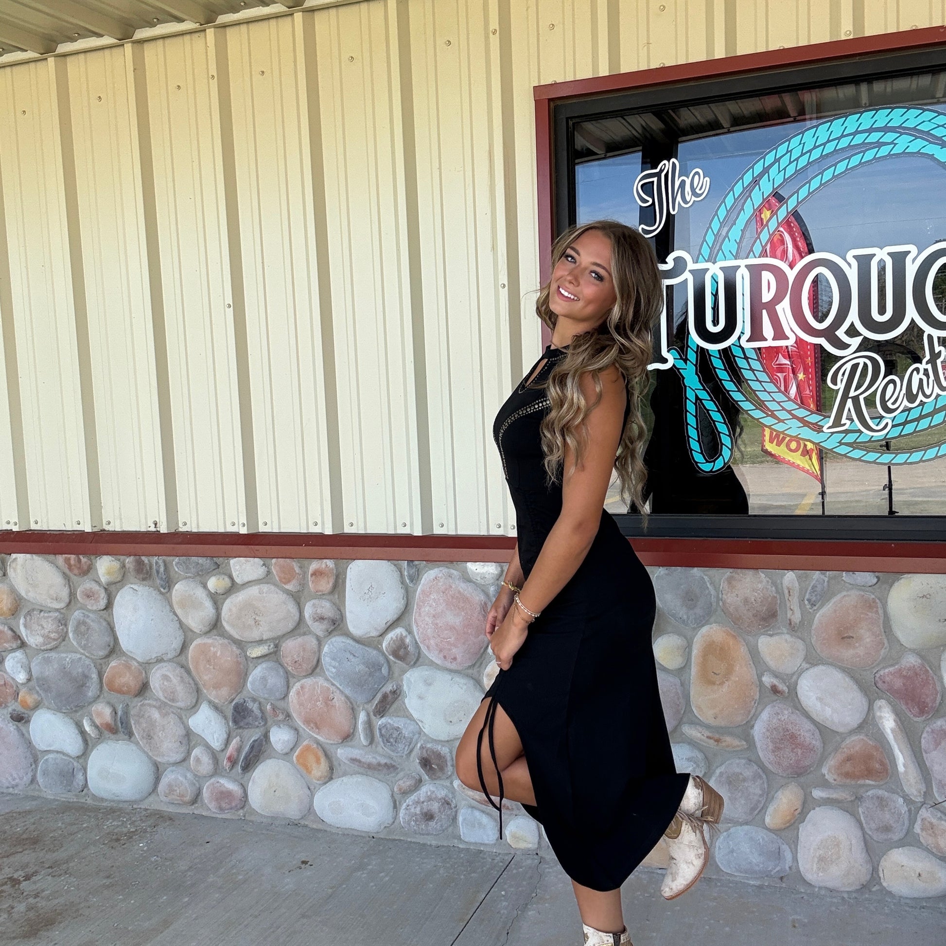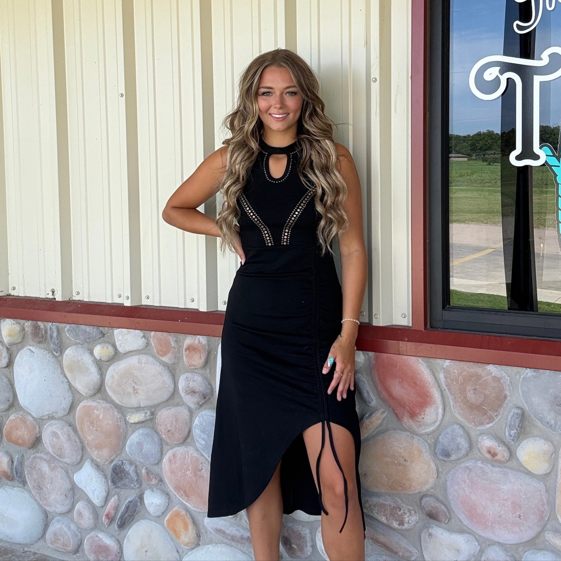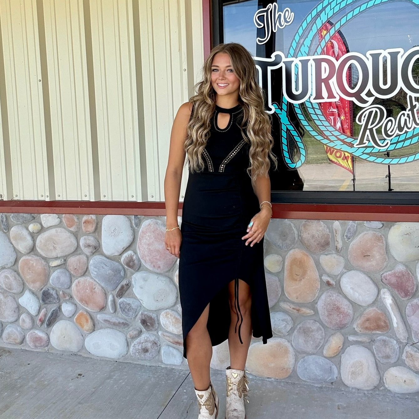 Sleek, sassy, and made to turn heads—the After Rodeo Black Dress is your new go-to for everything from date nights to honky-tonk dance floors. This little black number features a flattering high neckline with a front keyhole cutout, bronze studded embellishment detailing, and adjustable drawstring at the skirt. The fabric hugs in all the right places without being too clingy, and the length is perfect for showing off your favorite boots.